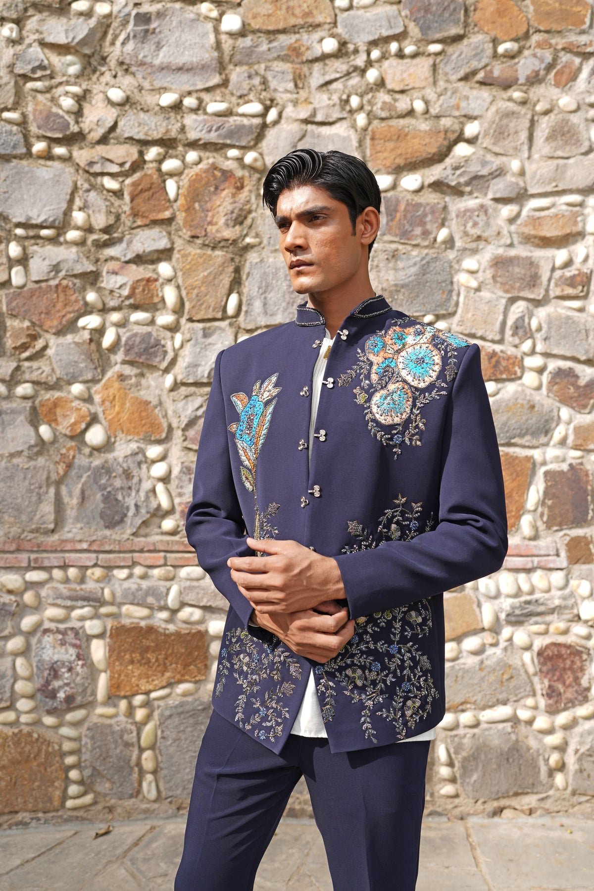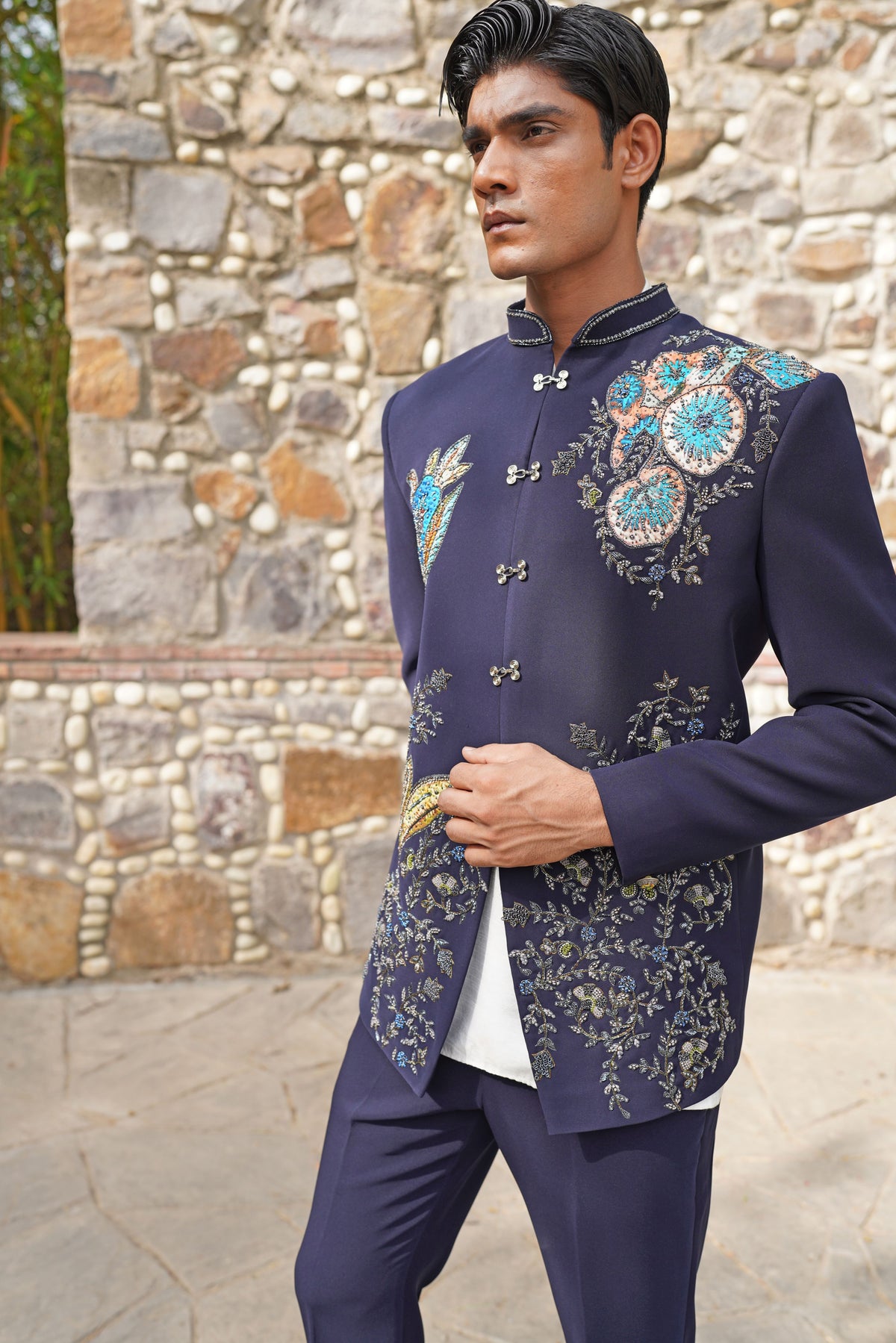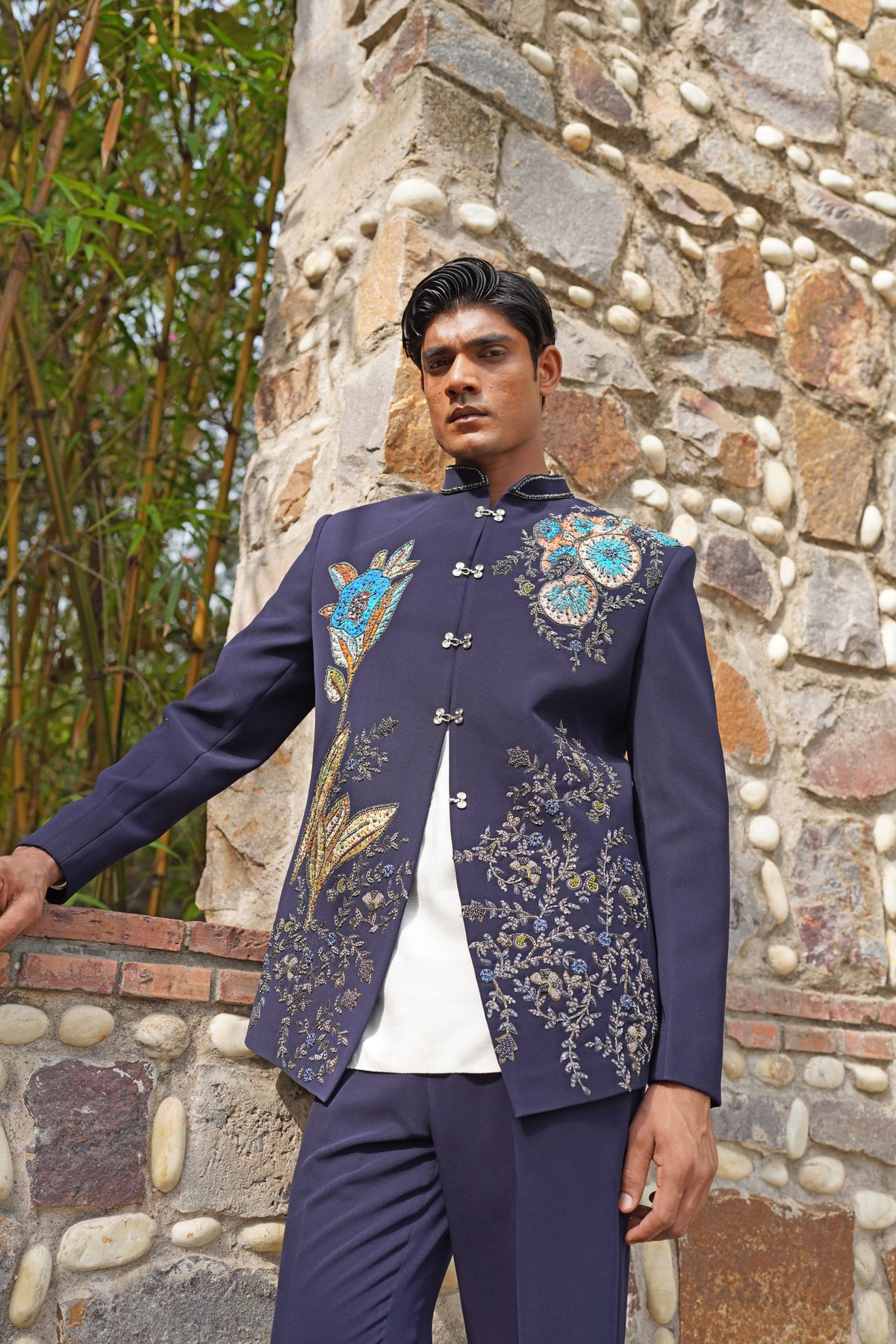 Make A Striking Statement With This Royal Navy Blue Bandhgala Ensemble, Crafted In Luxurious Suiting Fabric. The Jacket Features An Asymmetrical Placement Of Intricate Hand Embroidery In Vibrant Hues Of Turquoise, Gold, And Silver Threadwork. Highlighted With Botanical And Floral Motifs, The Embroidery Showcases Artisanal Craftsmanship With Sequin, Bead, And Zari Embellishments. The Piece Is Finished With Metallic Crest Buttons And A Structured Silhouette, Adding A Regal Touch To The Look. Paired With Straight-Cut Matching Trousers, This Outfit Exudes Understated Opulence—Perfect For Weddings, Festive Soirées, Or High-Profile Occasions.