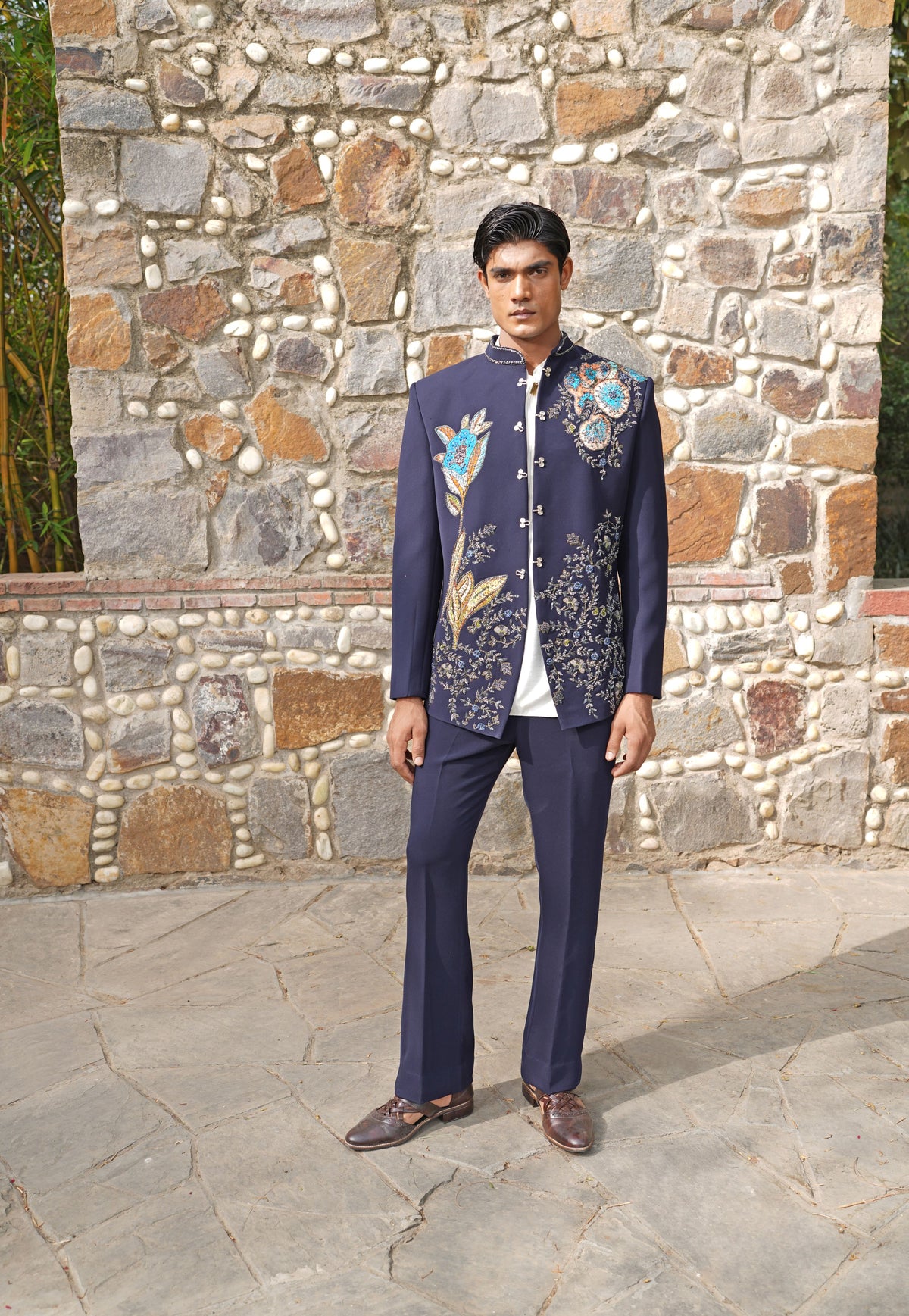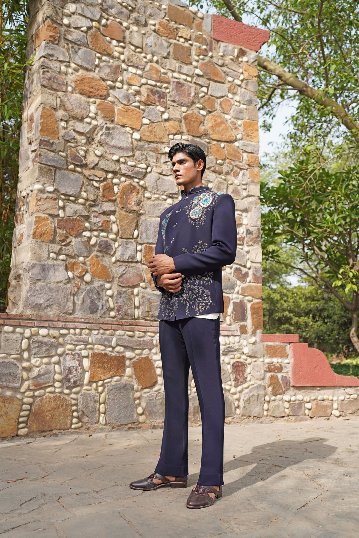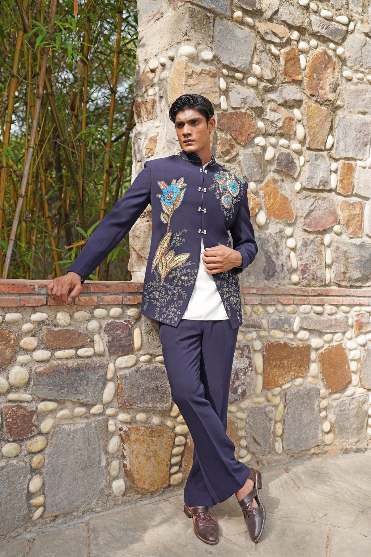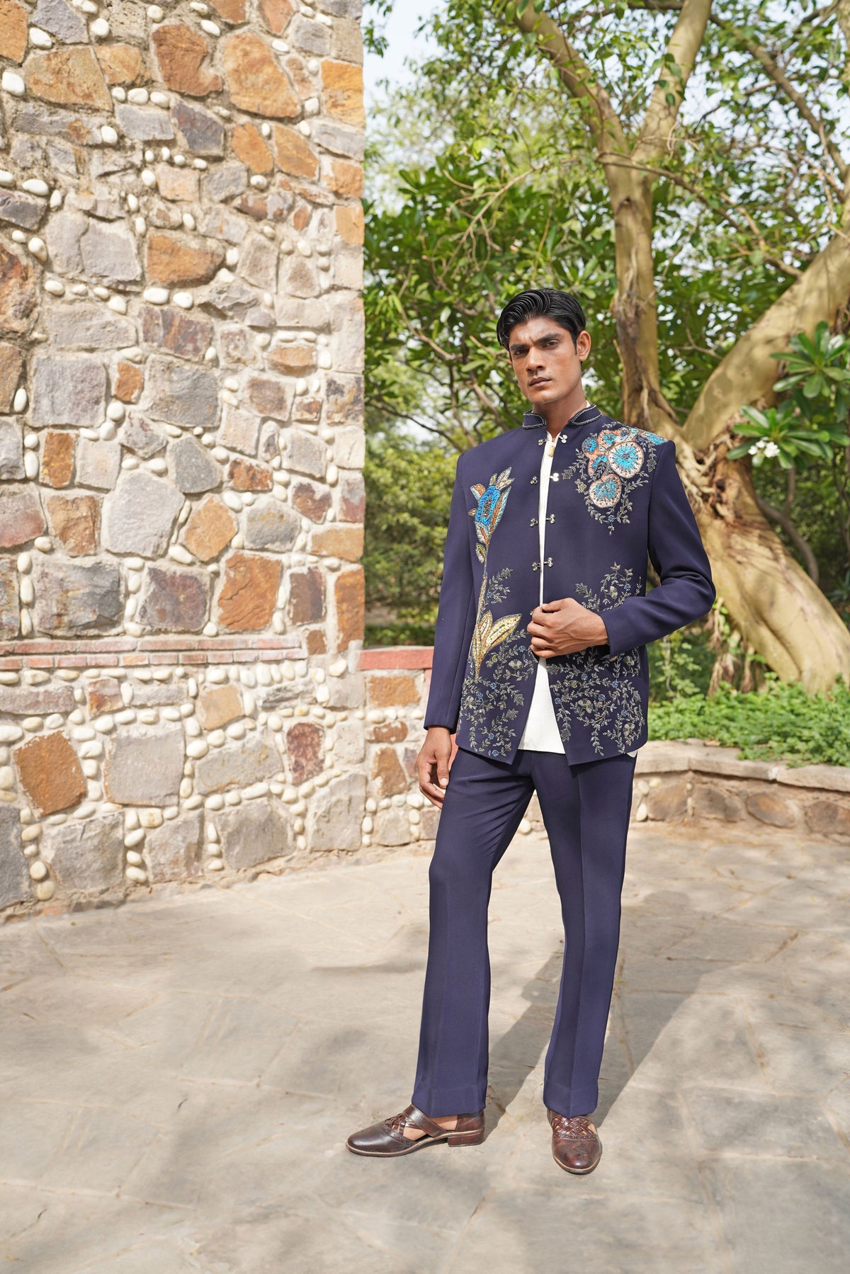 Make A Striking Statement With This Royal Navy Blue Bandhgala Ensemble, Crafted In Luxurious Suiting Fabric. The Jacket Features An Asymmetrical Placement Of Intricate Hand Embroidery In Vibrant Hues Of Turquoise, Gold, And Silver Threadwork. Highlighted With Botanical And Floral Motifs, The Embroidery Showcases Artisanal Craftsmanship With Sequin, Bead, And Zari Embellishments. The Piece Is Finished With Metallic Crest Buttons And A Structured Silhouette, Adding A Regal Touch To The Look. Paired With Straight-Cut Matching Trousers, This Outfit Exudes Understated Opulence—Perfect For Weddings, Festive Soirées, Or High-Profile Occasions.