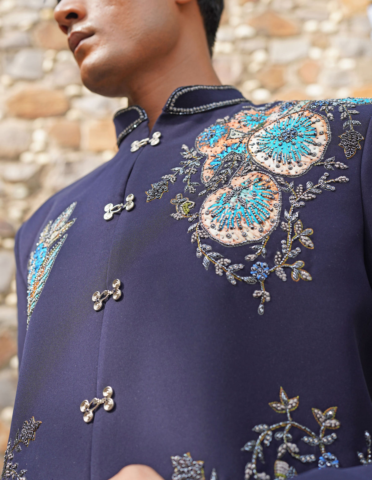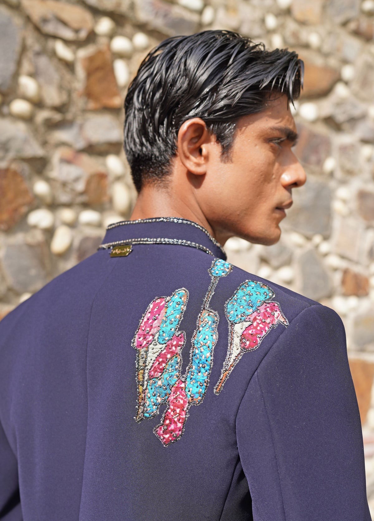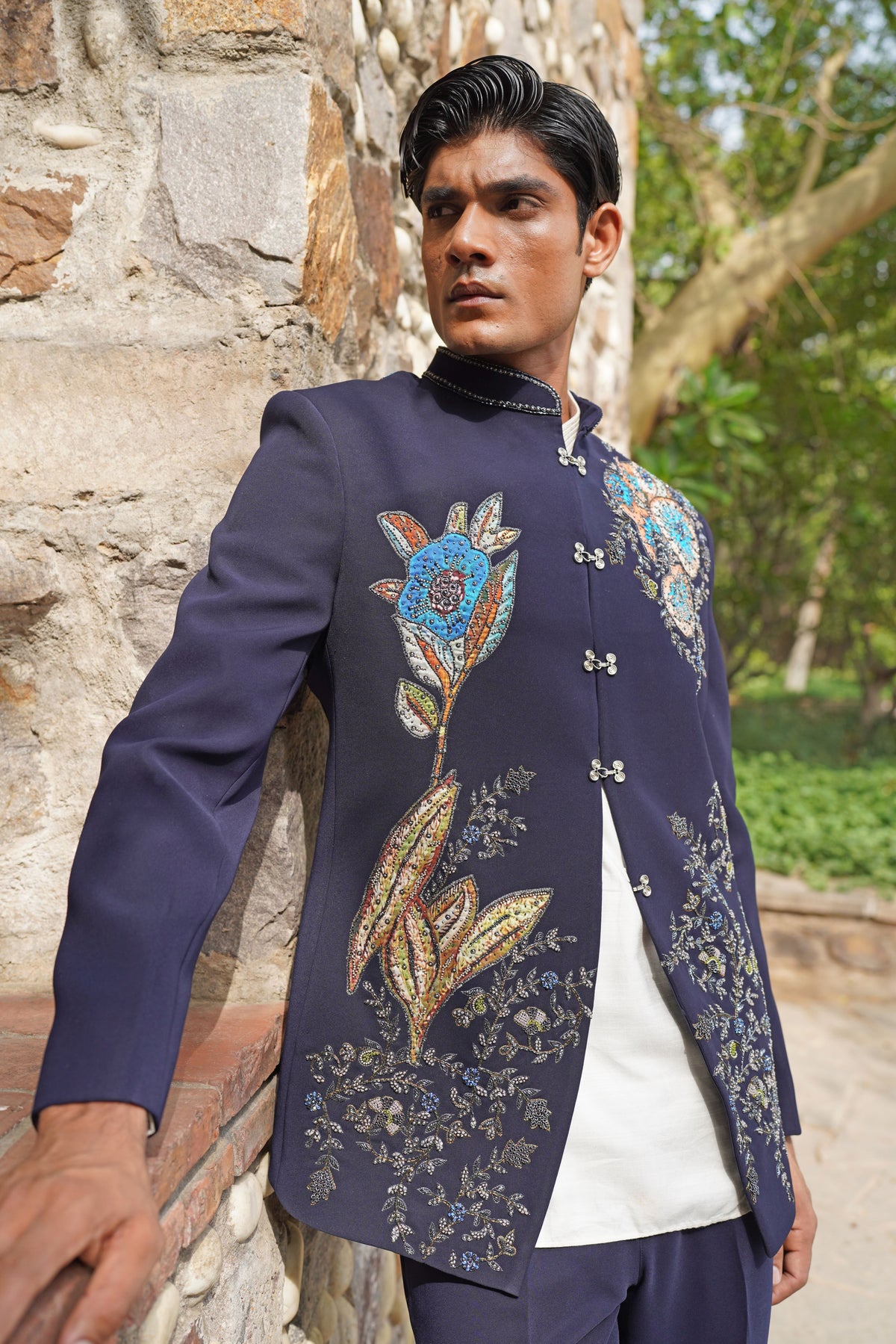 Royal Navy Blue Bandhgala Set with Multicolor Hand Embroidery & Crest Buttons