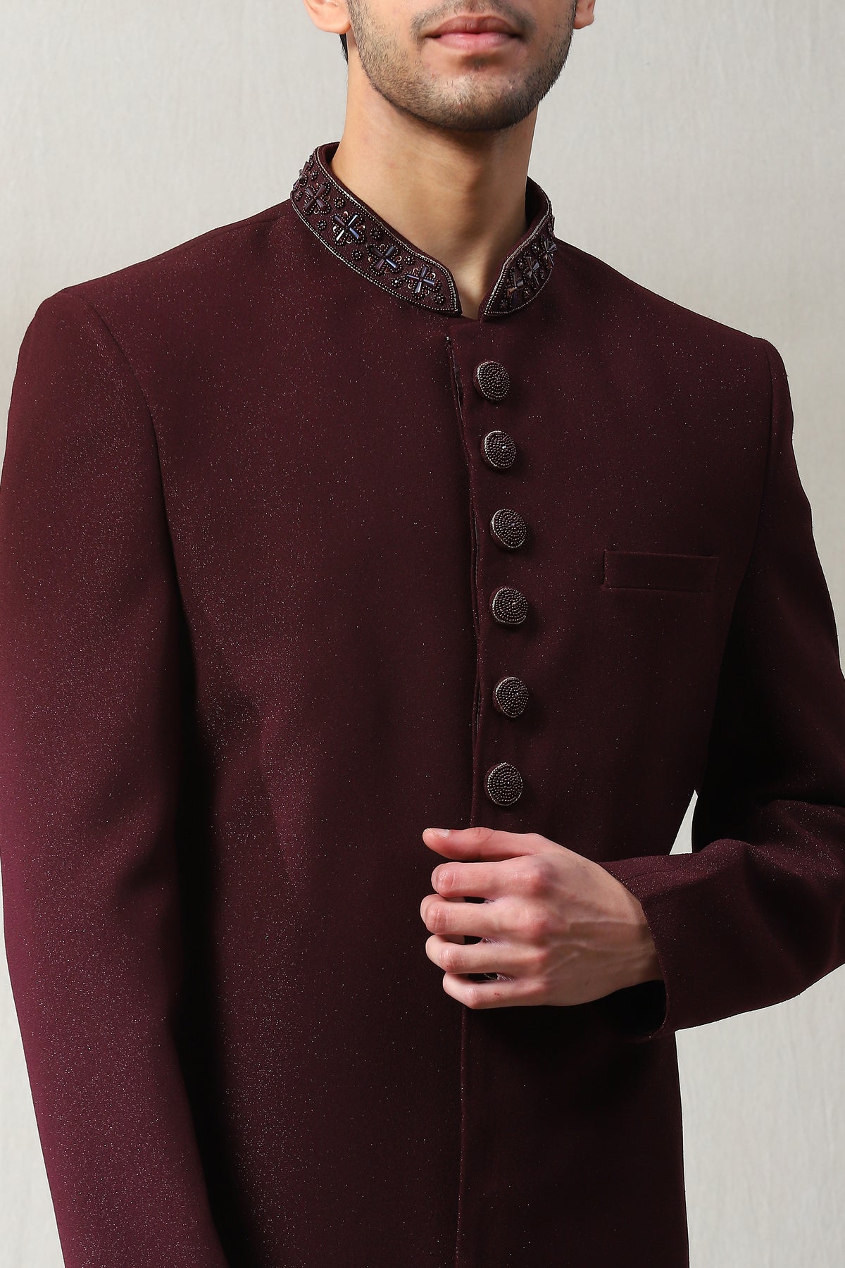 This shimmer Indonesian indo western has been adorned with hand embroidery on ban neck and buttons