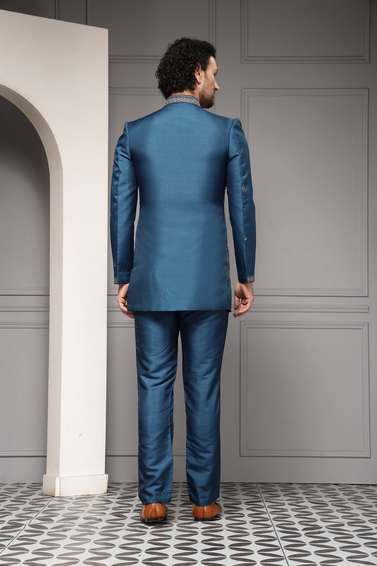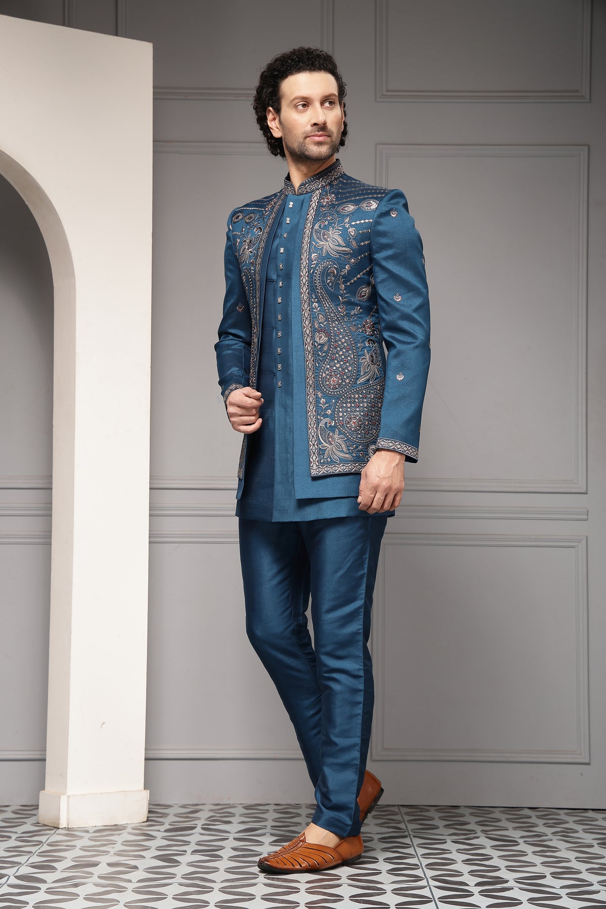 A regal teal-blue bandhgala set adorned with intricate multicolour embroidery inspired by classical paisley and floral motifs. Rich surface detailing, contrasted with clean tailoring, highlights artisanal craftsmanship while maintaining a contemporary, elegant silhouette—ideal for weddings and grand celebrations.