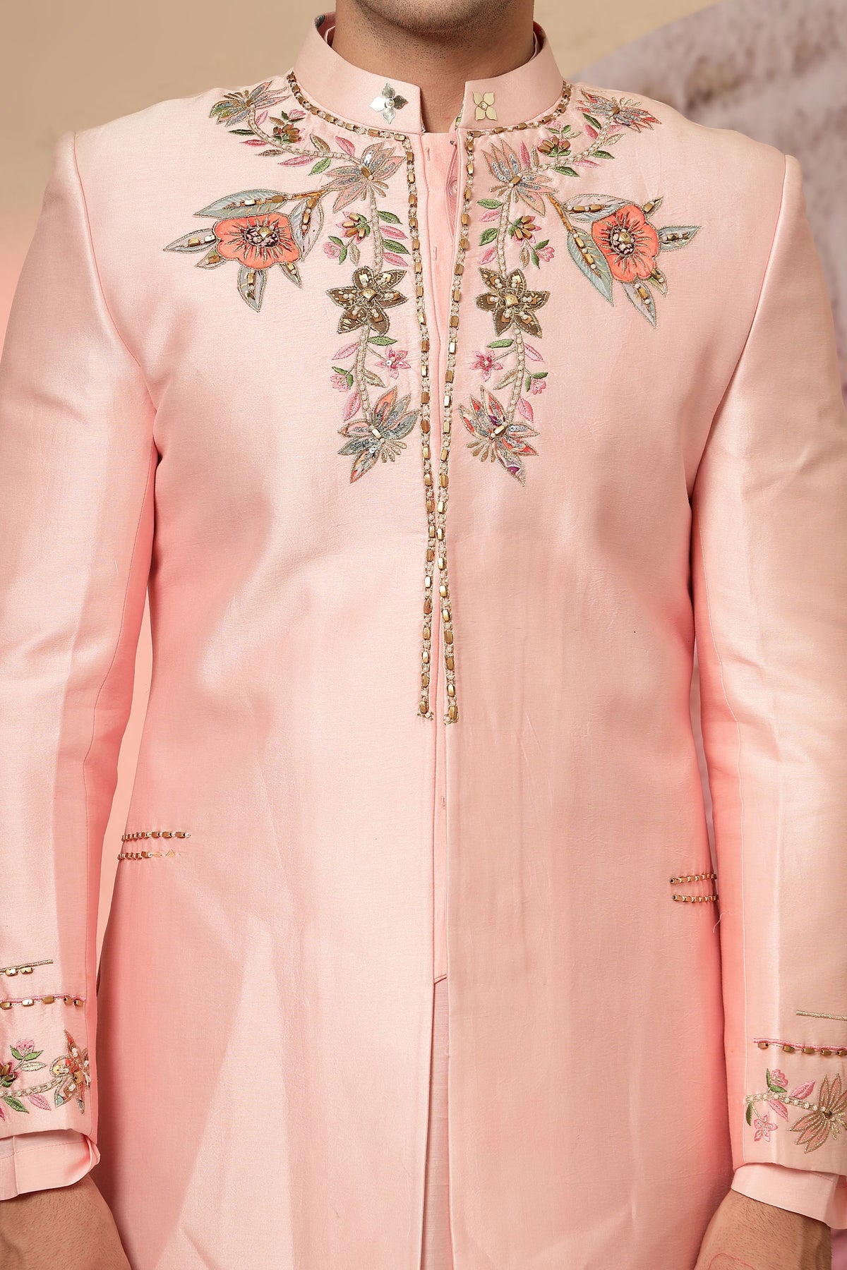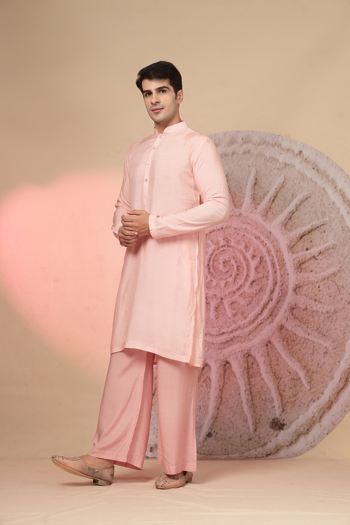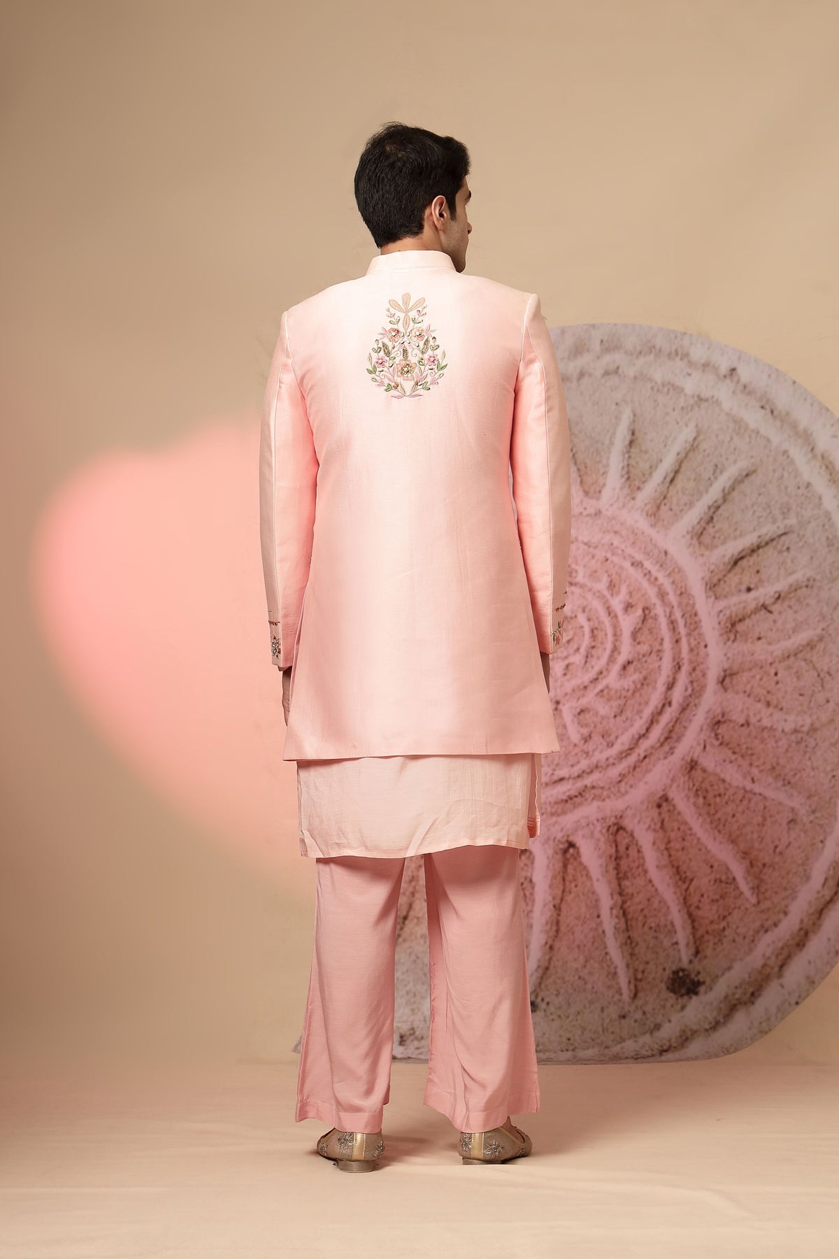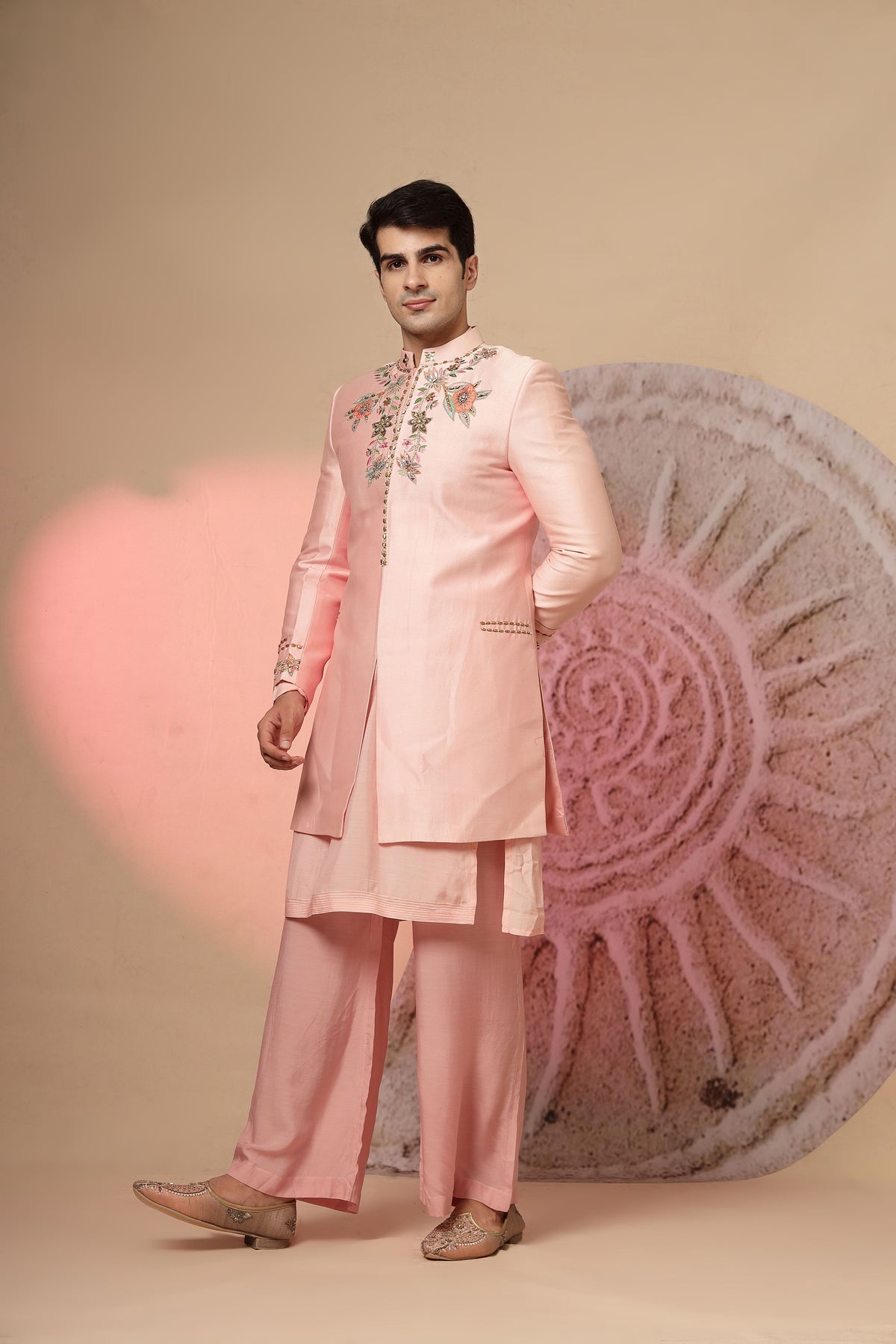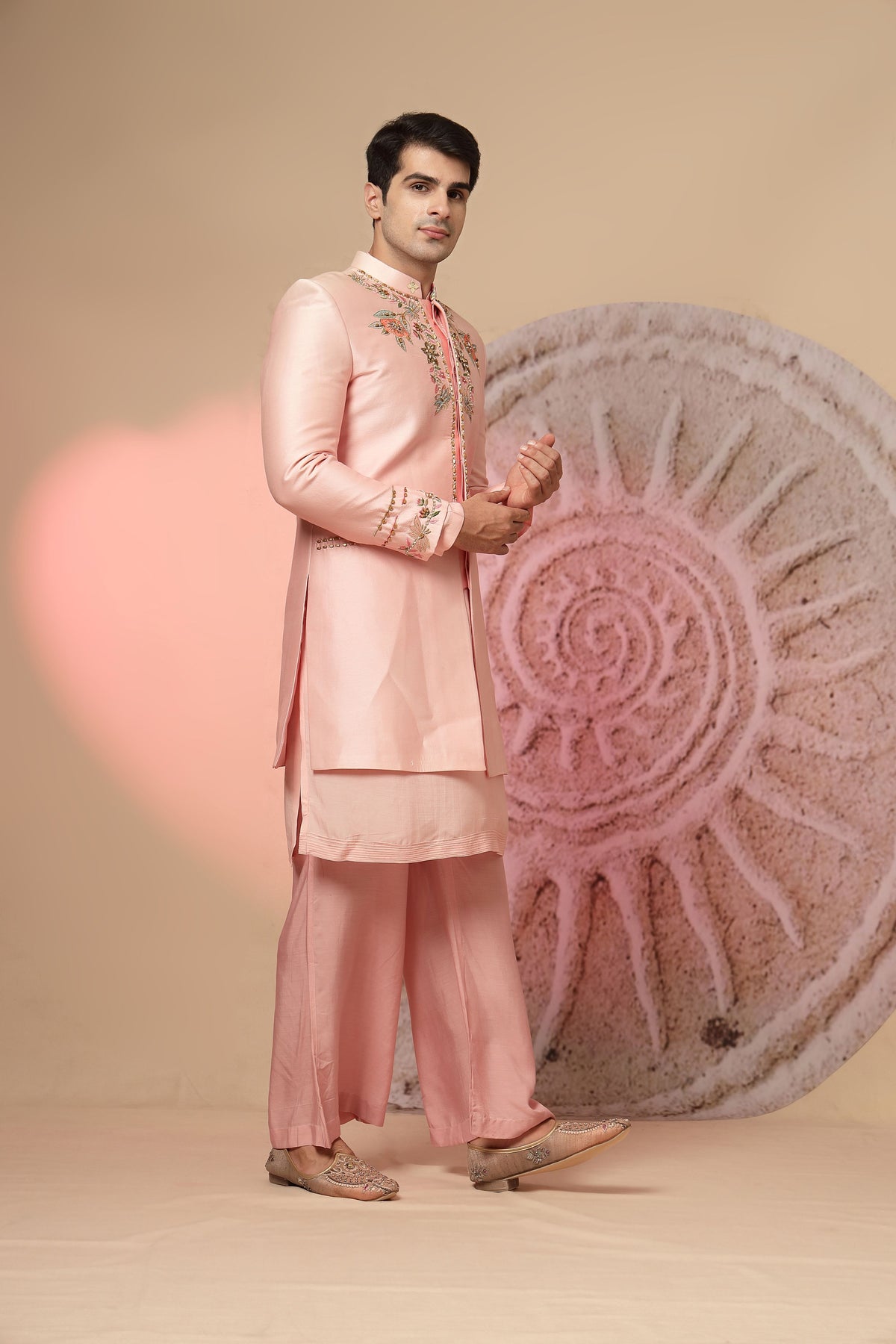 light pink satin jacket with intricate embroidery on the collar and cuffs. Underneath, he has a matching kurta and comfortable pants. He's also wearing embroidered shoes. The backdrop is a soft, textured material with a large, decorative element. The overall look is elegant and traditional.