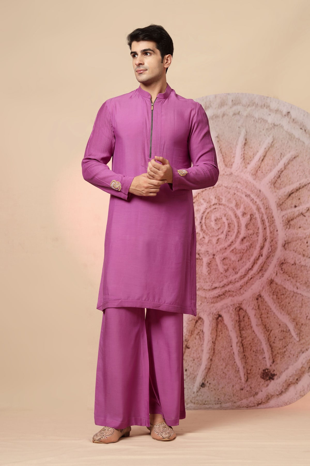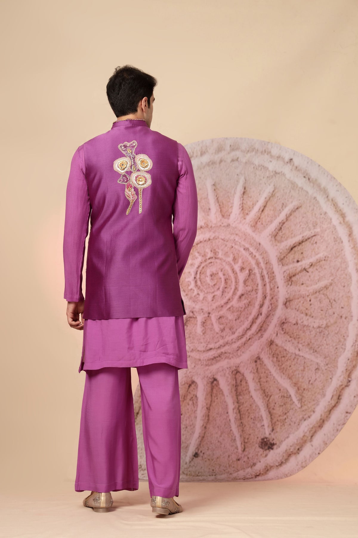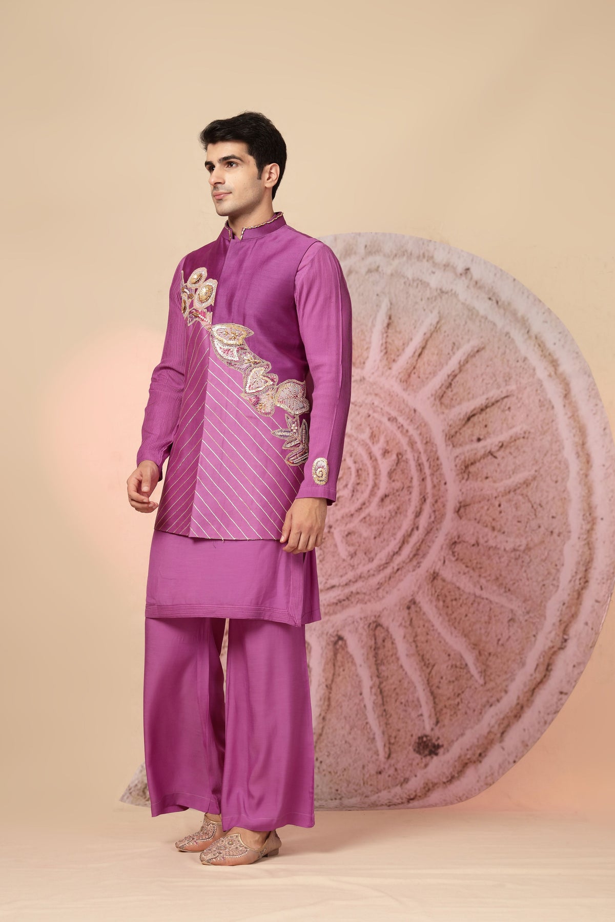 Stand out in sophistication with this designer magenta kurta pajama set, featuring an attached asymmetrical jacket-style overlay that blends tradition with a modern silhouette. This ensemble is a true statement piece, ideal for those who want to turn heads at weddings, receptions, or festive celebrations. The kurta is tailored from a high-quality silk blend fabric that offers both shine and structure. The highlight is the asymmetrical front panel overlay, adorned with intricate zari, sequin, and thread embroidery in a floral-inspired pattern. Subtle diagonal lines on the lower panel add visual balance to the elaborate upper design.