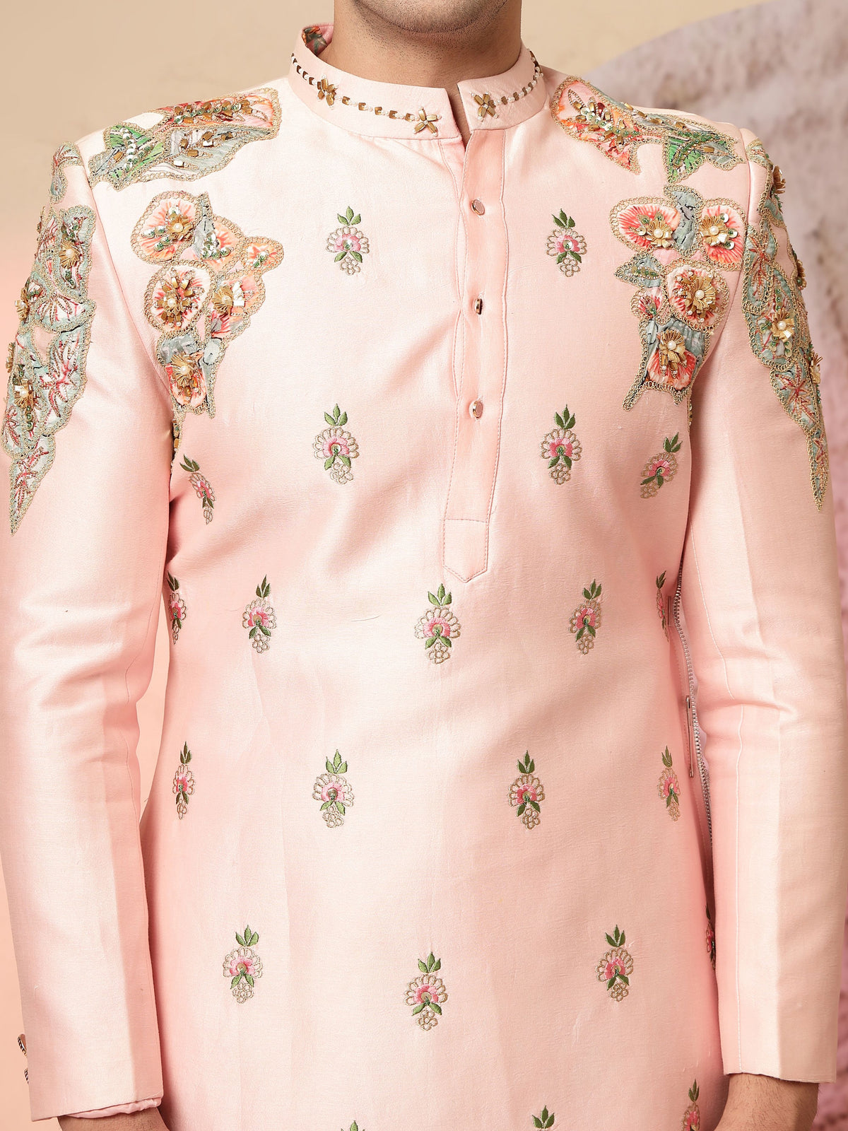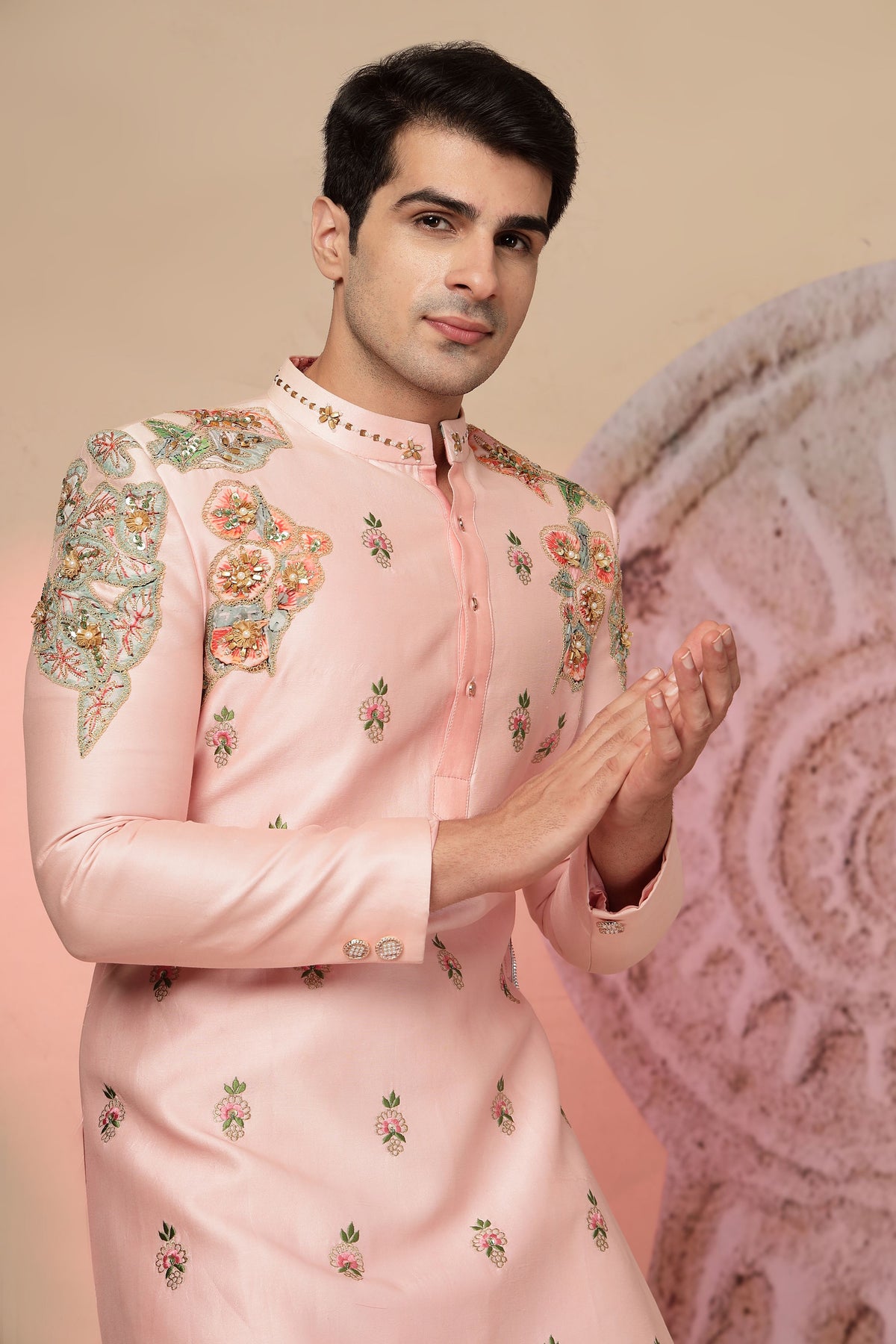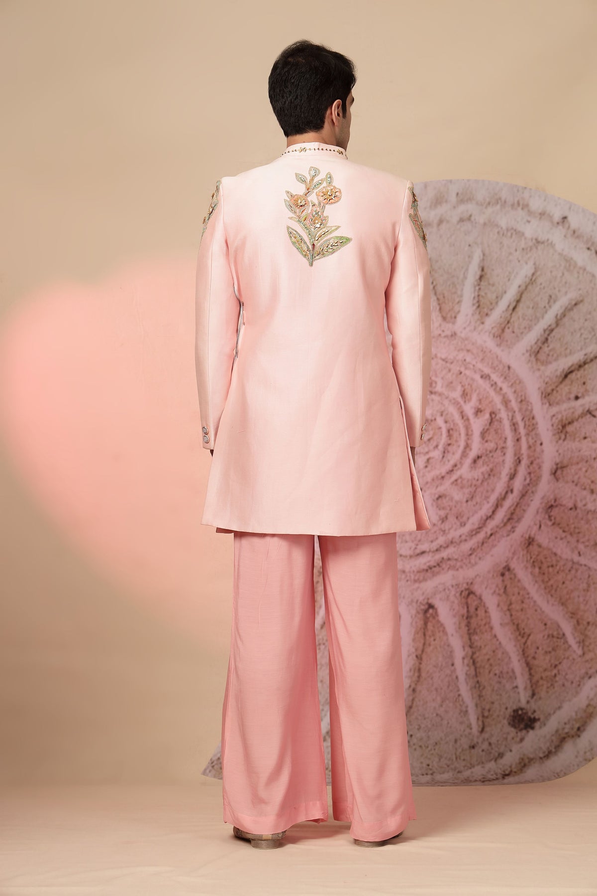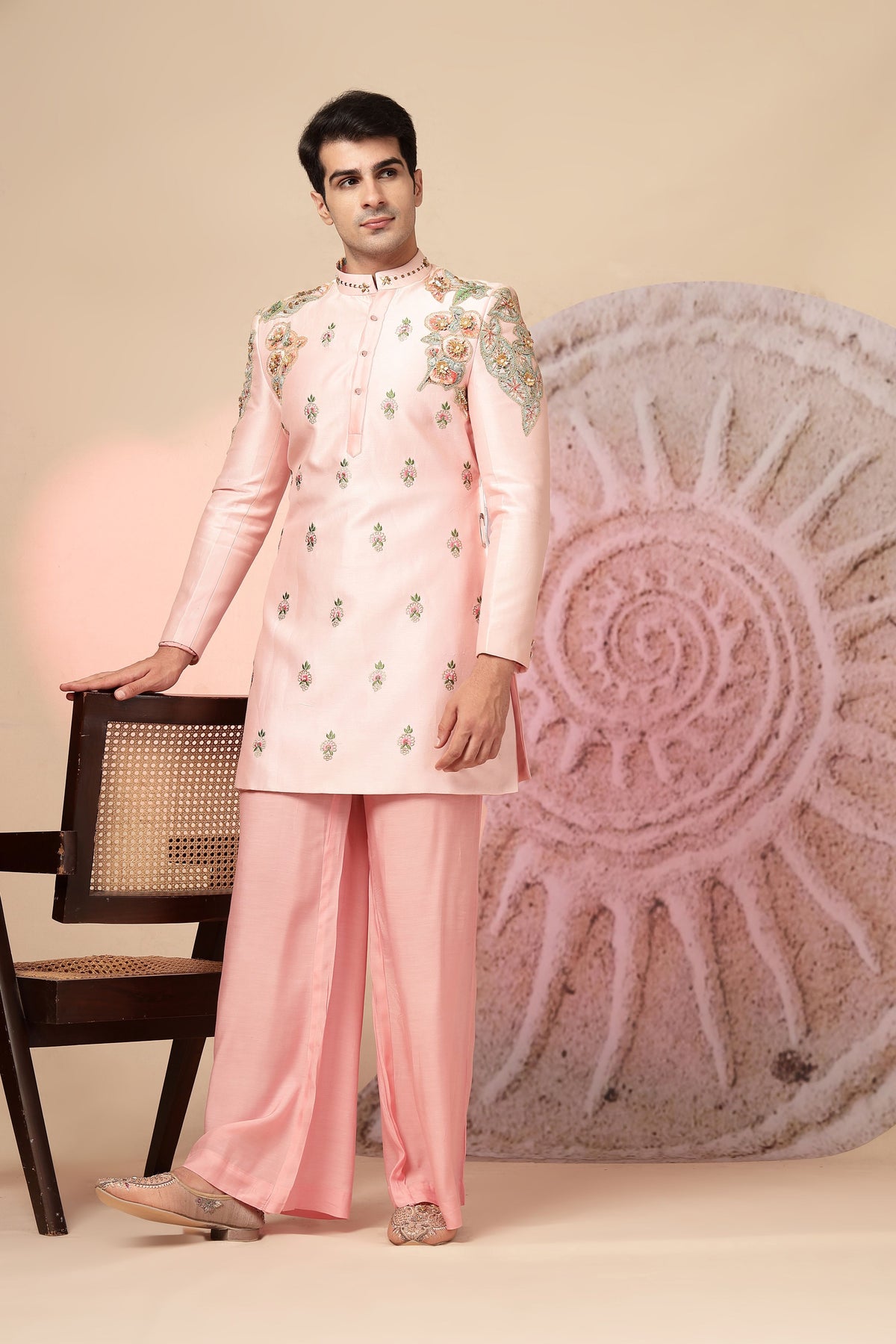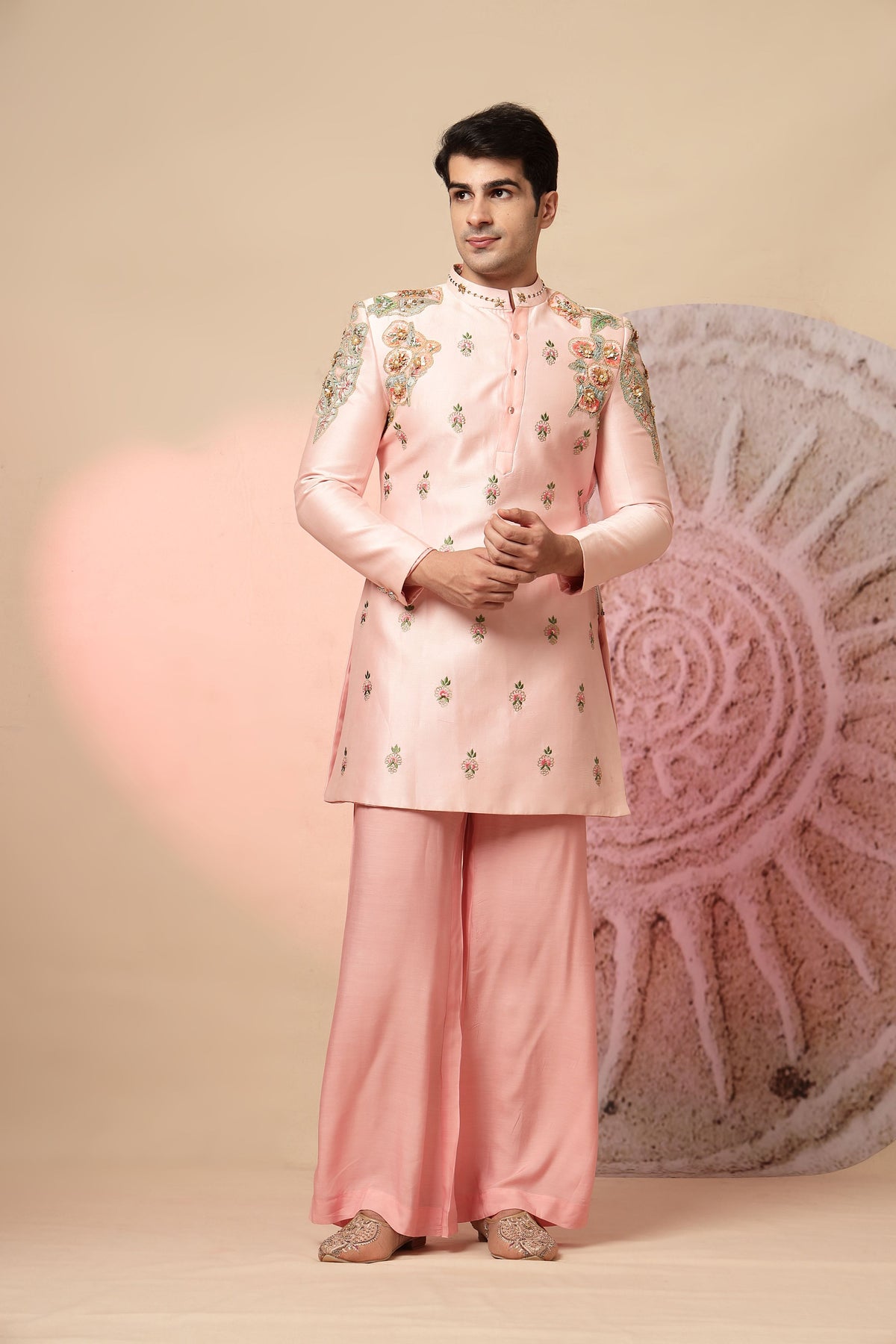 Well, that's a lovely pastel pink outfit. It consists of a long kurta with delicate embroidery on the collar and cuffs, paired with matching palazzo pants. The embroidery adds a touch of elegance to the outfit. It's a very graceful and sophisticated look, suitable for various occasions.