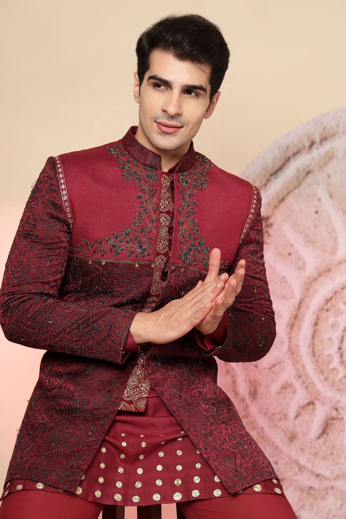 jacket with intricate embroidery, paired with a matching kurta and palazzo pants. The jacket has a high collar and button detailing. The whole ensemble gives off a regal and elegant vibe, perfect for a formal occasion.