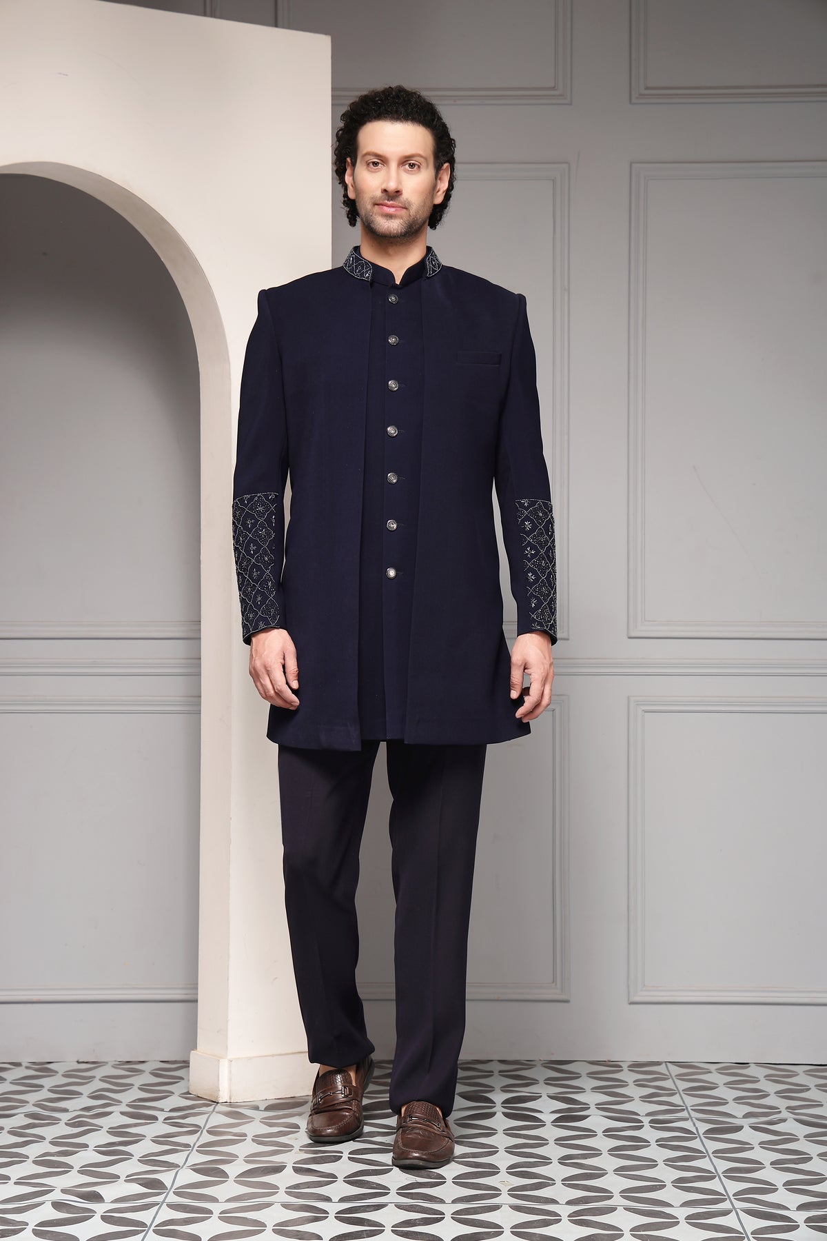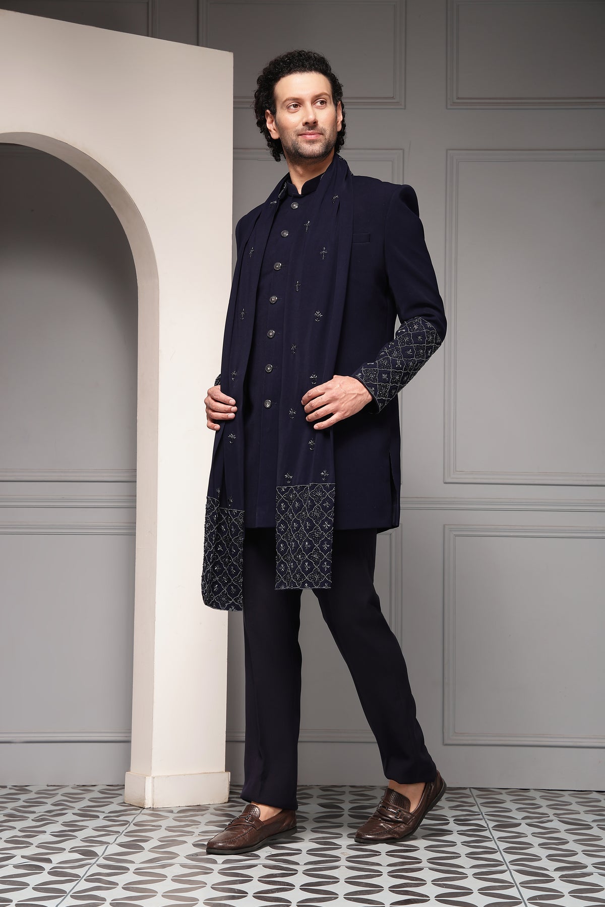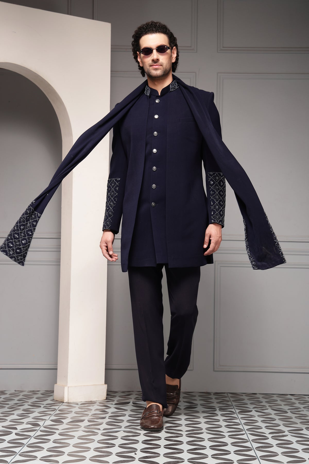 A sophisticated midnight-blue bandhgala set layered with a matching stole for added elegance. Subtle geometric embroidery on the cuffs and collar complements the clean, structured silhouette, creating a look that balances modern minimalism with regal charm—ideal for evening ceremonies and formal occasions.