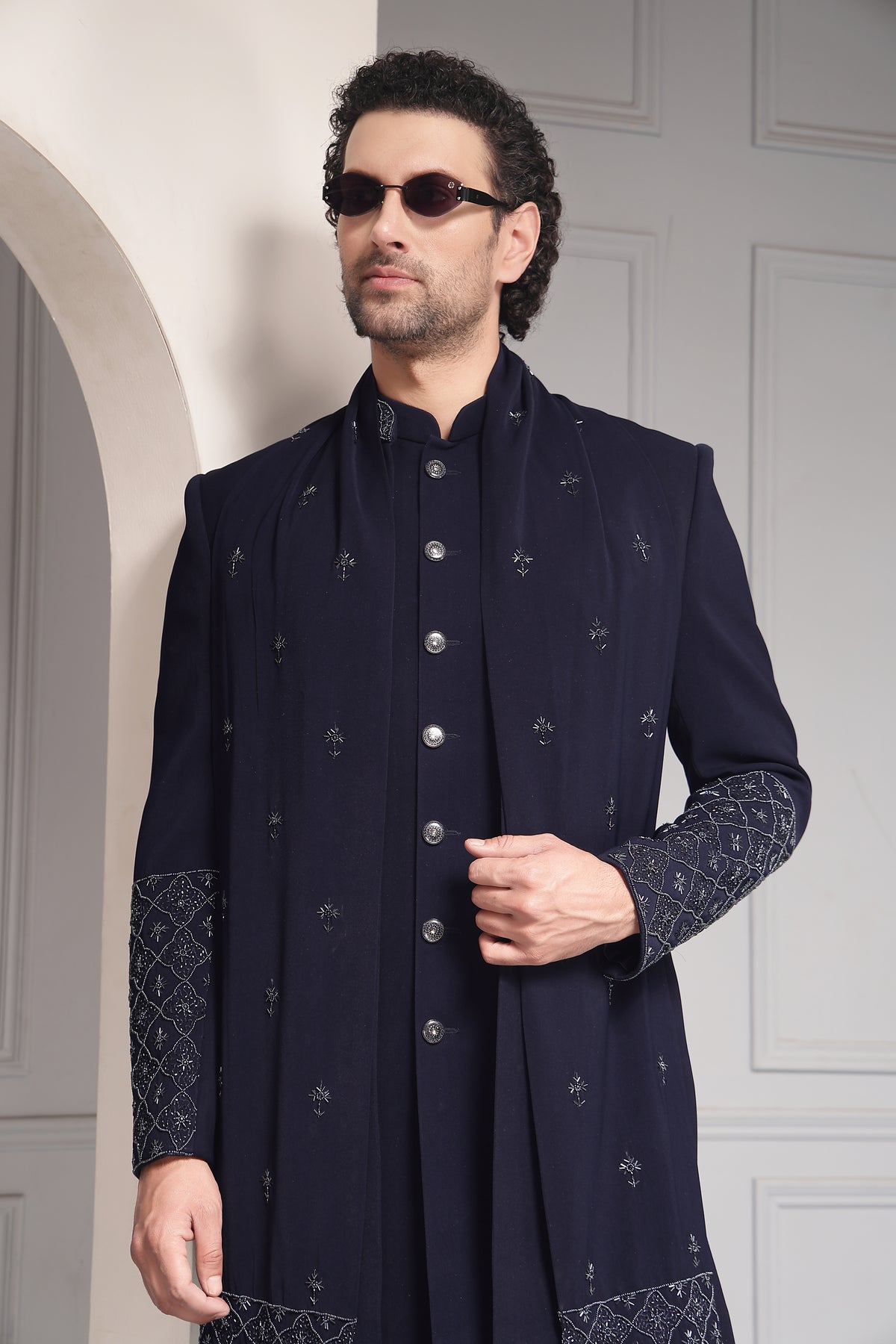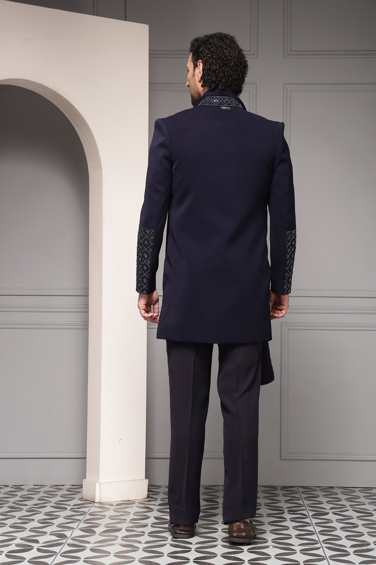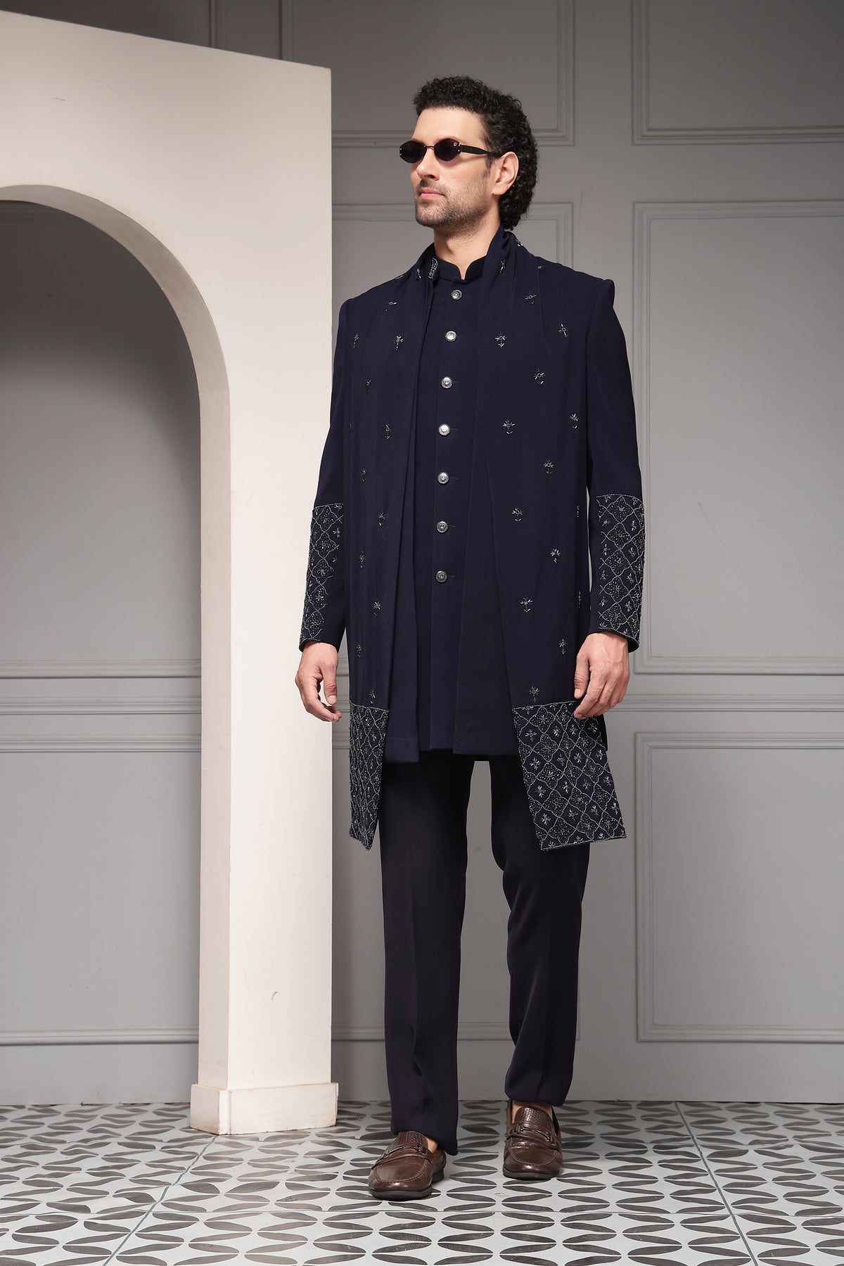 A sophisticated midnight-blue bandhgala set layered with a matching stole for added elegance. Subtle geometric embroidery on the cuffs and collar complements the clean, structured silhouette, creating a look that balances modern minimalism with regal charm—ideal for evening ceremonies and formal occasions.