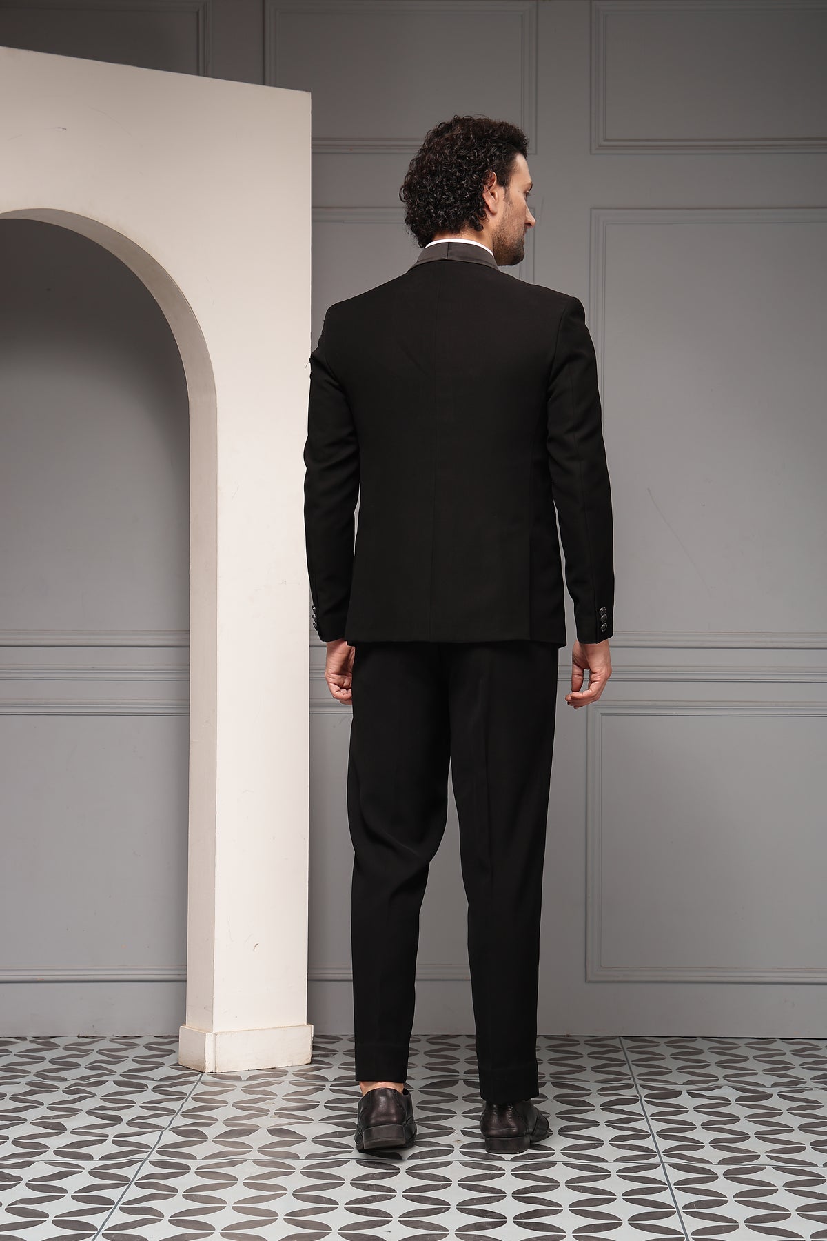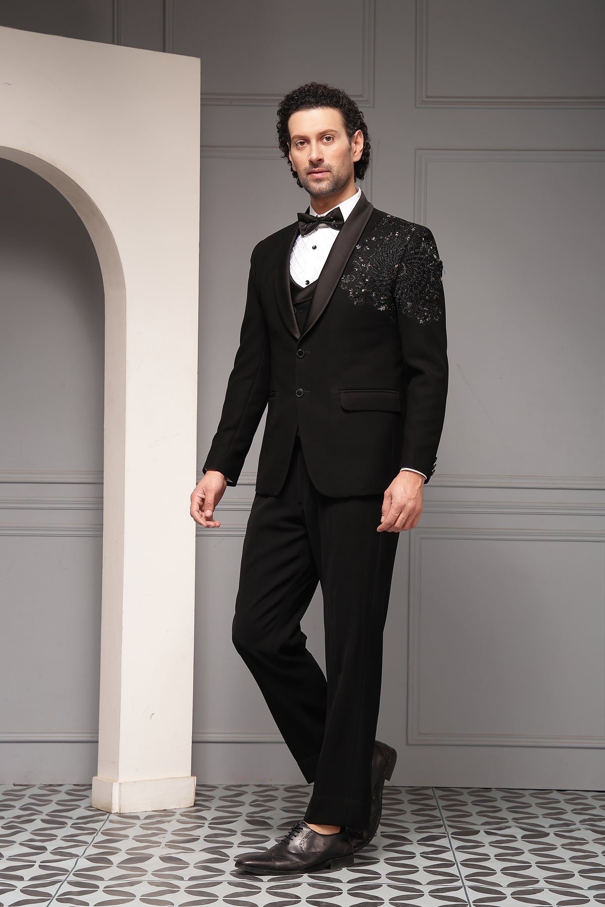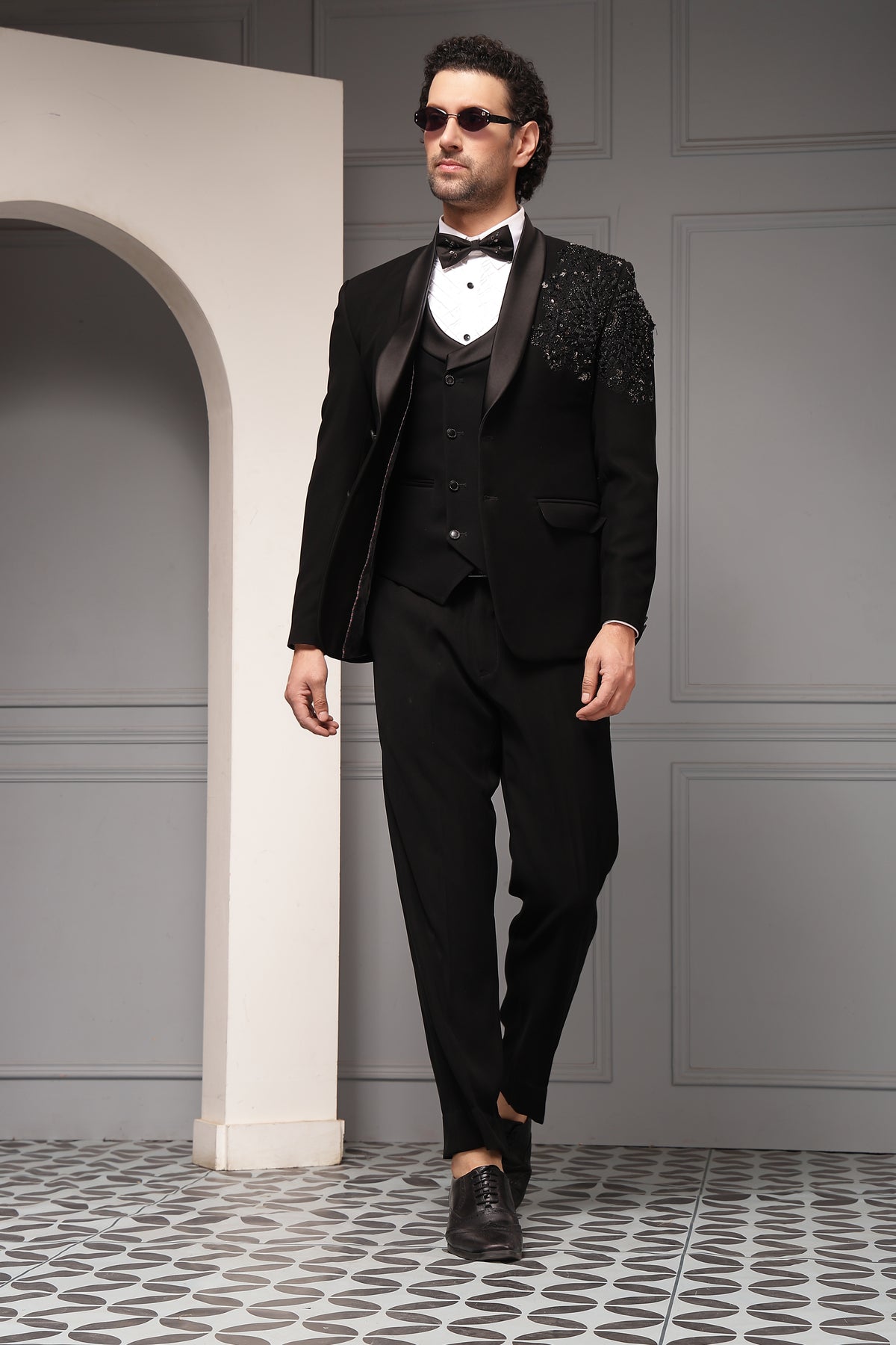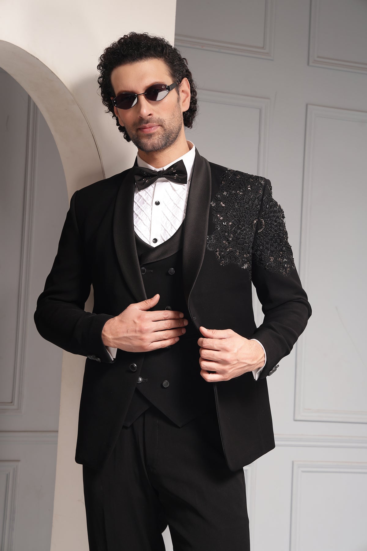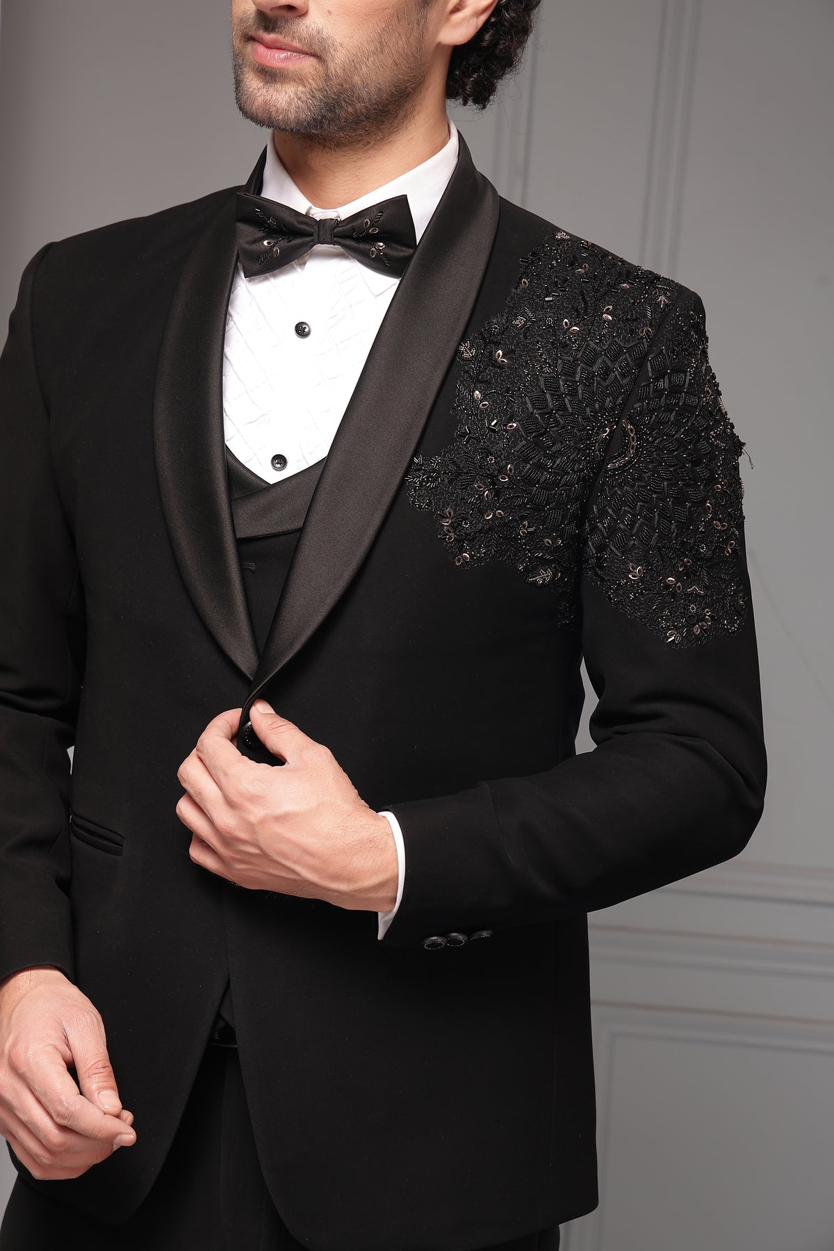 A sophisticated black tuxedo set featuring a classic shawl-lapel blazer accented with intricate tonal embellishment on the shoulder. Paired with a structured waistcoat, crisp shirt, and tailored trousers, this ensemble delivers timeless black-tie elegance with a modern couture edge.