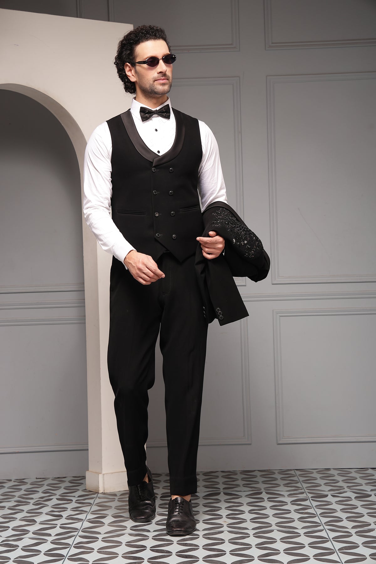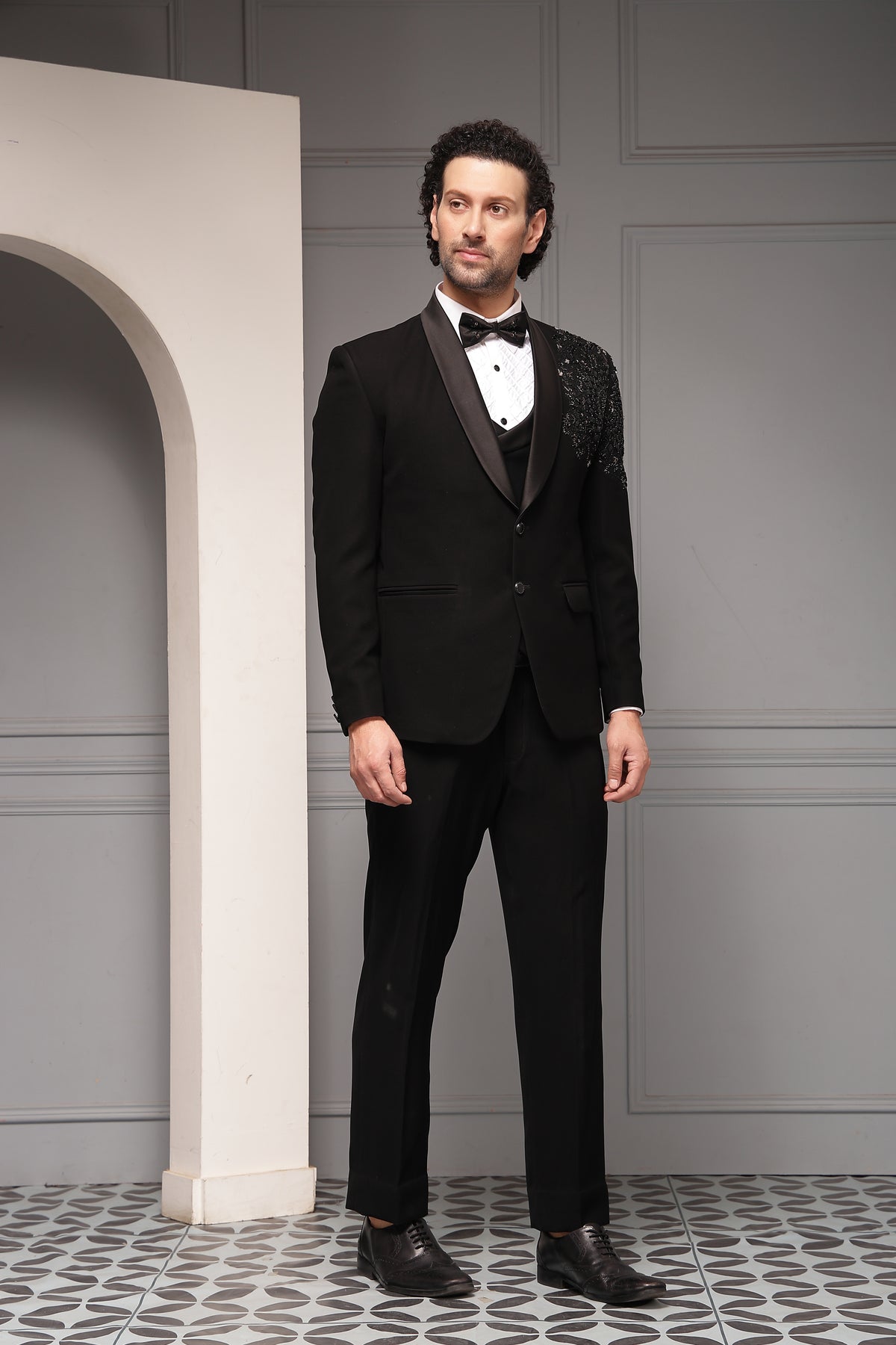 Items : Embellished Tuxedo Blazer,Waistcoat,Formal Shirt,Tailored Trousers,Bow Tie