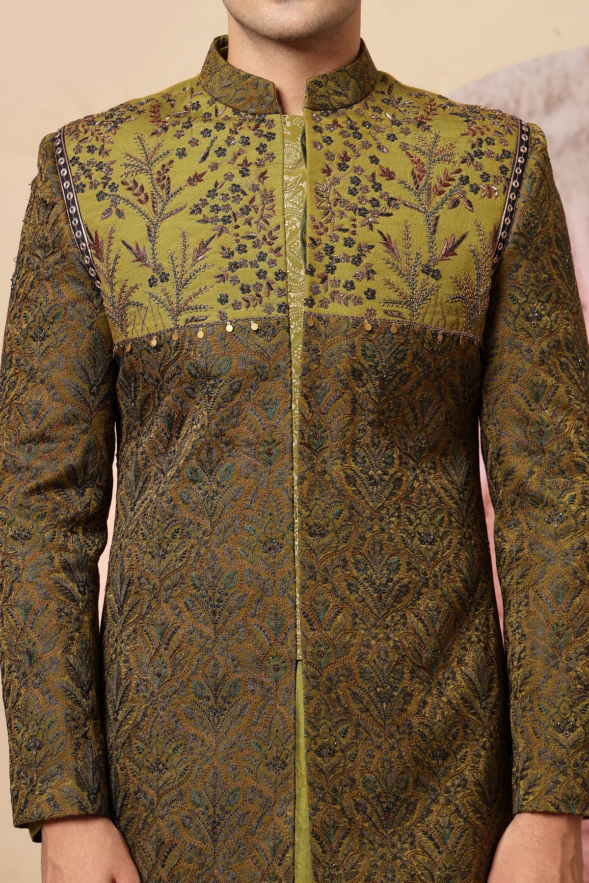 Men's Olive Green Embroidered Indo-Western Kurta Set with Designer Jacket Make a bold style statement with this exquisite olive green Indo-Western kurta set, designed for the modern man who appreciates traditional craftsmanship with a contemporary twist. This regal ensemble is perfect for festive occasions, weddings, and cultural functions.