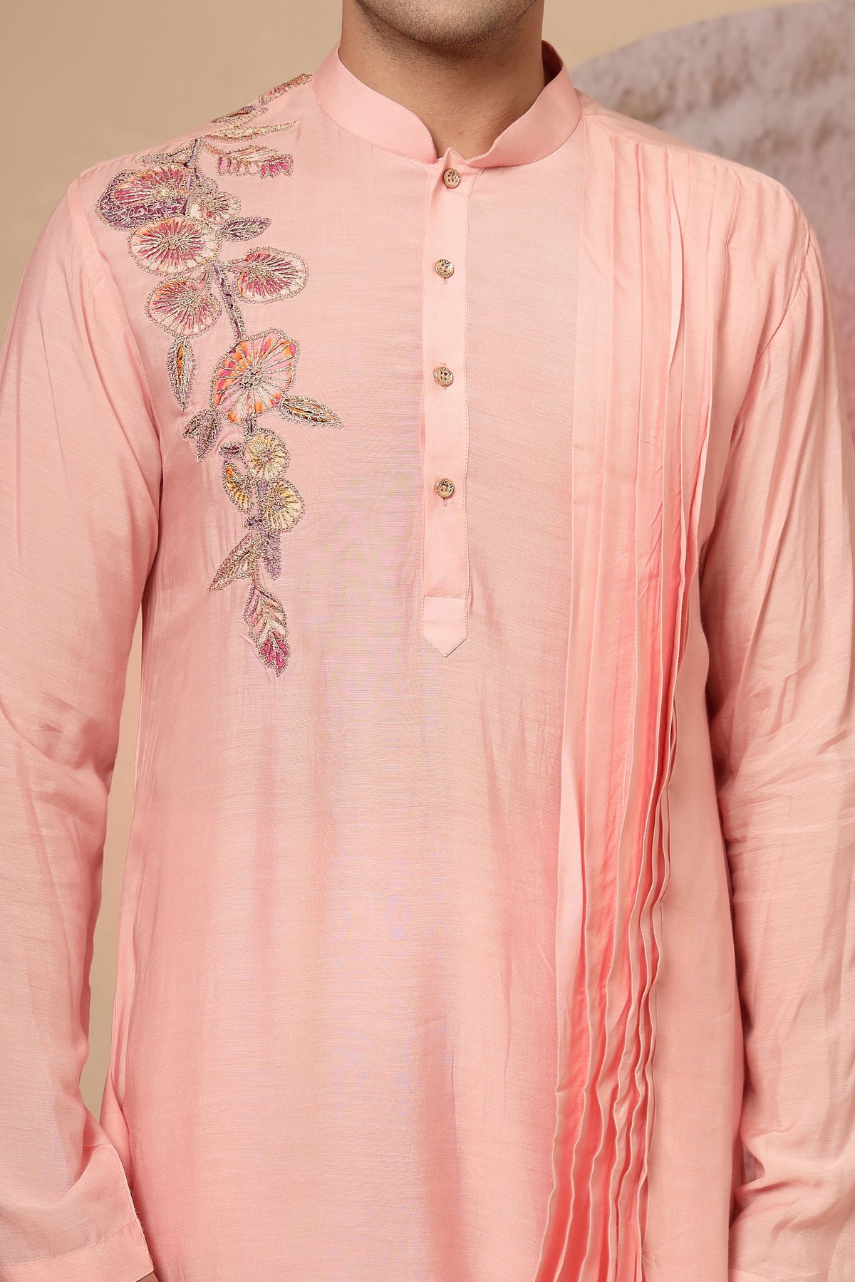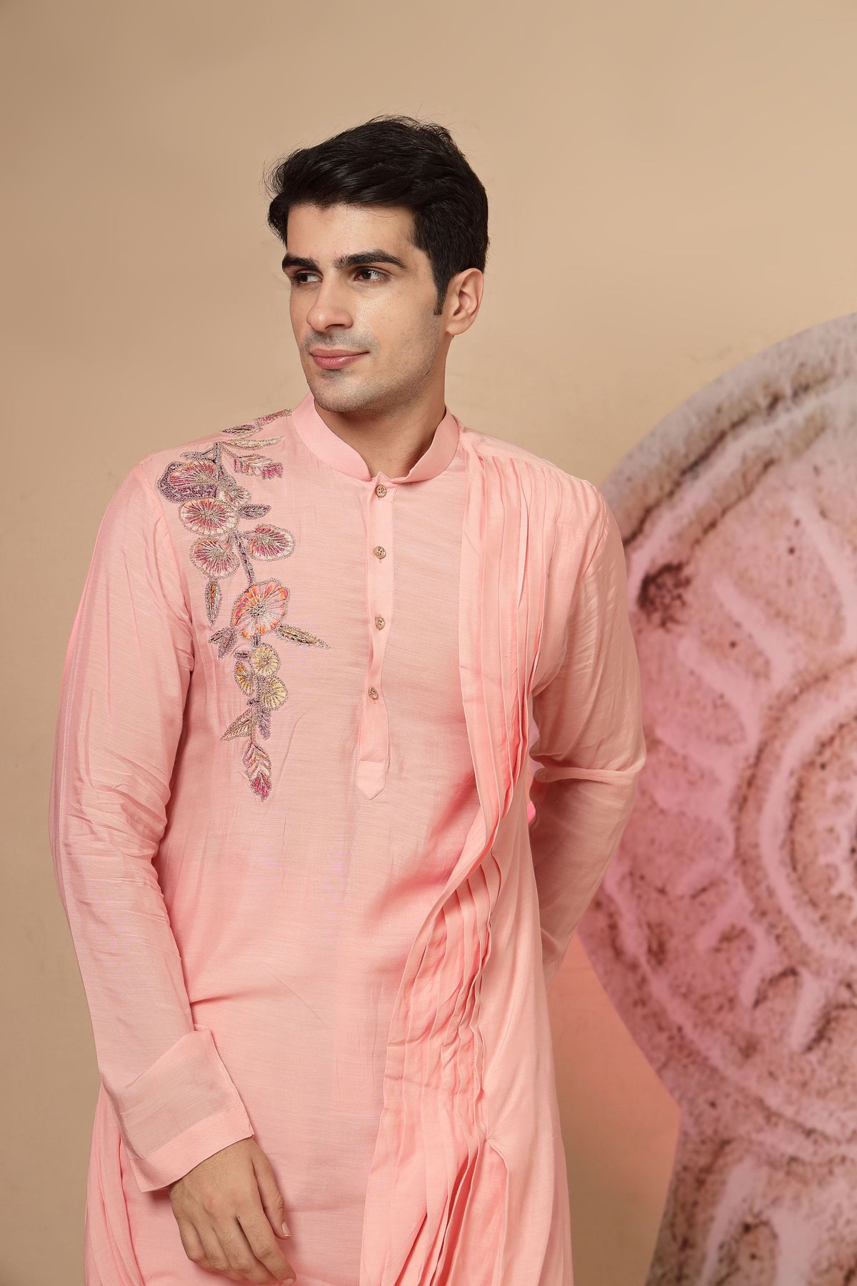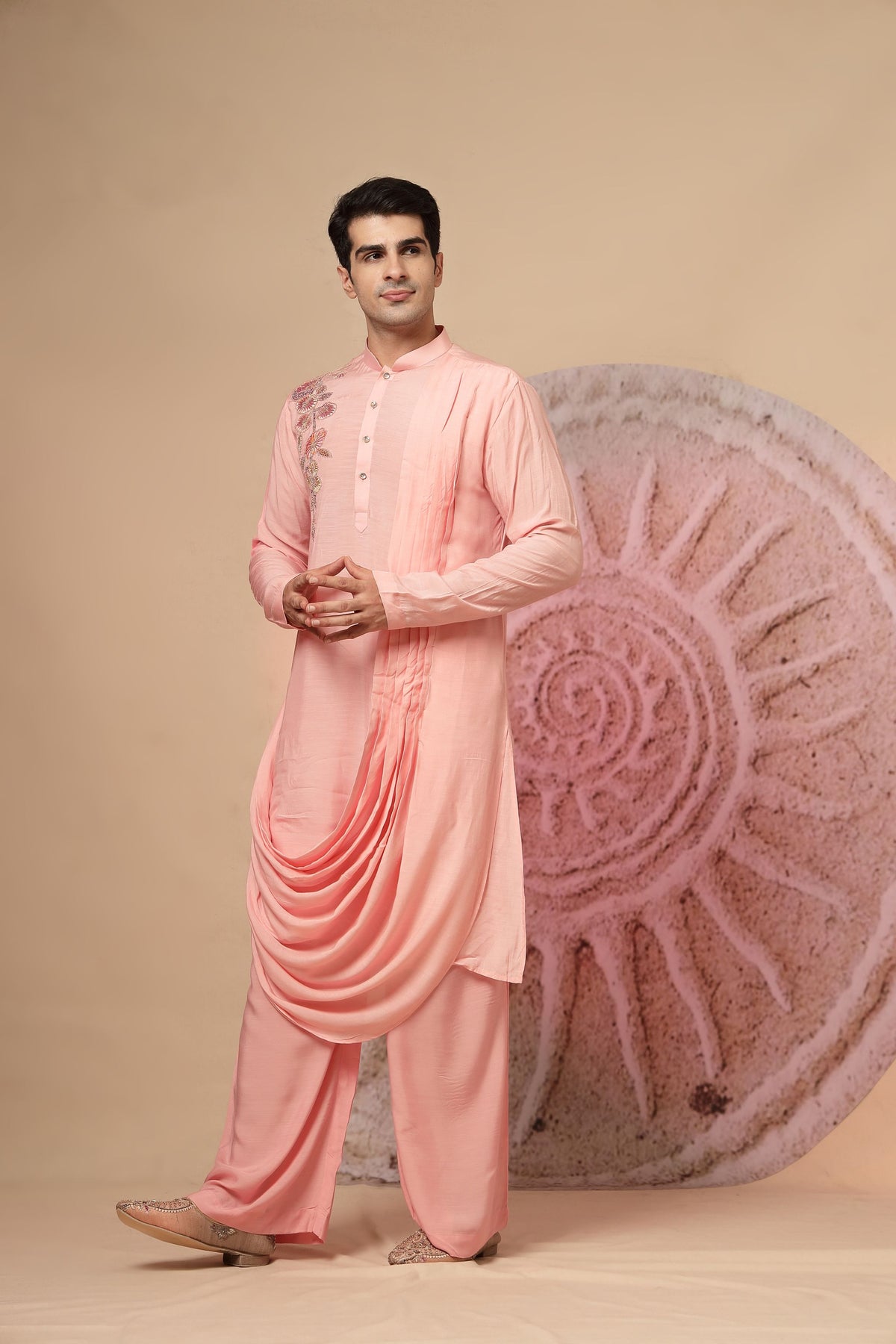 Peach Draped Kurta with Embroidered Detail and Palazzo Pants