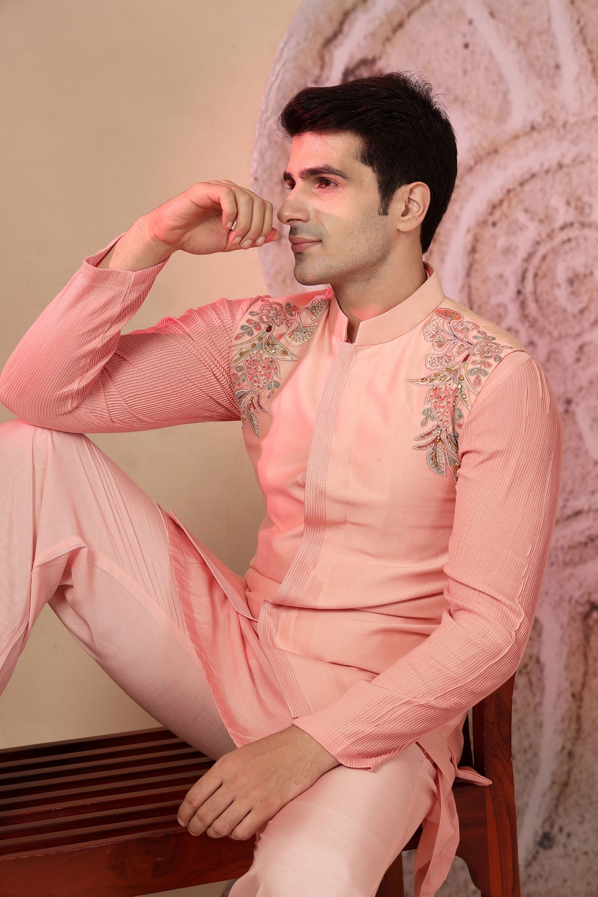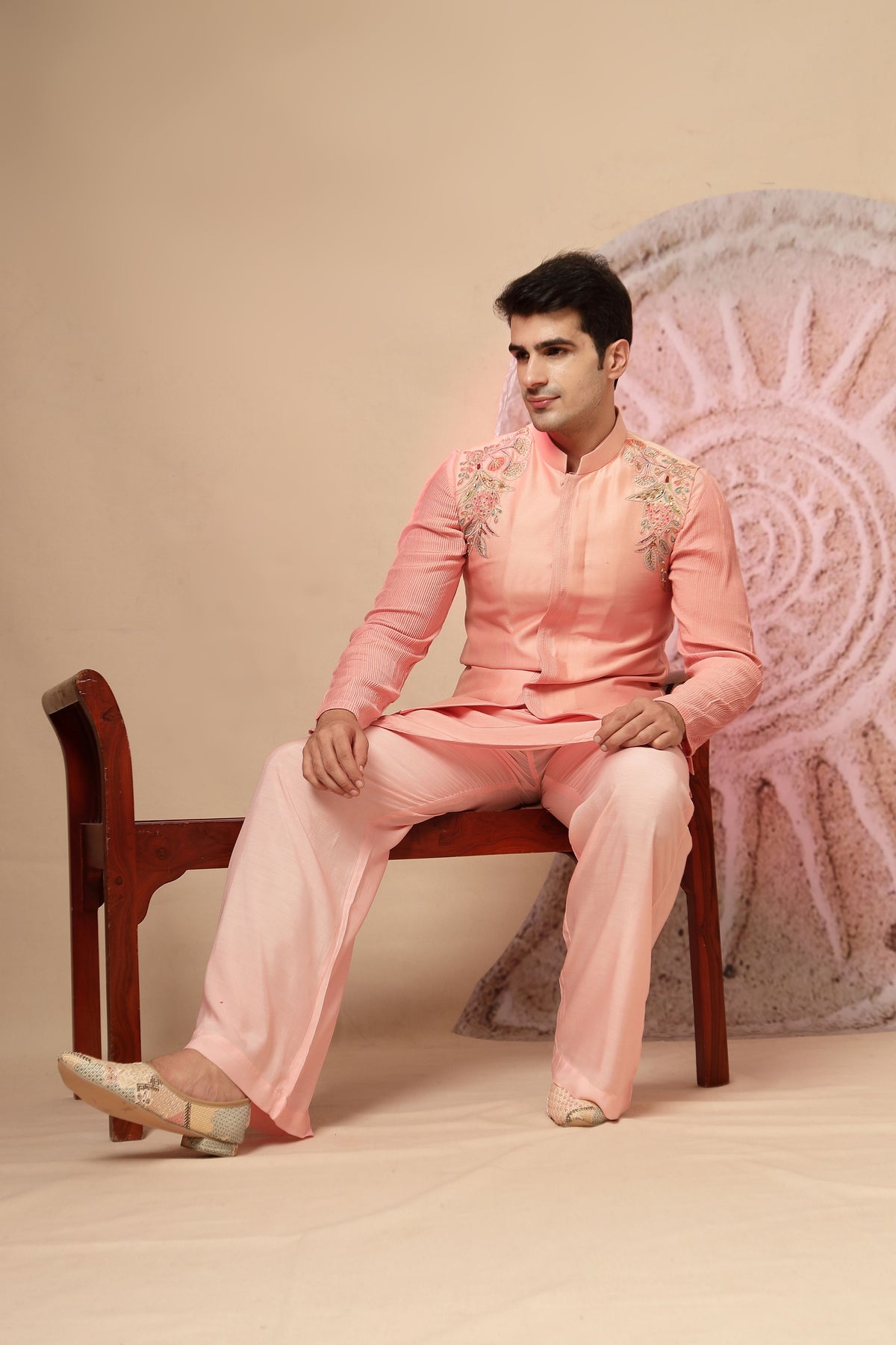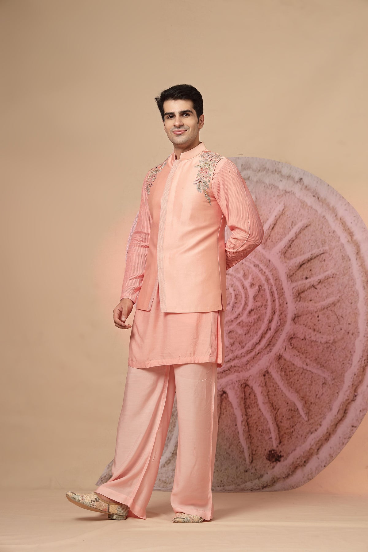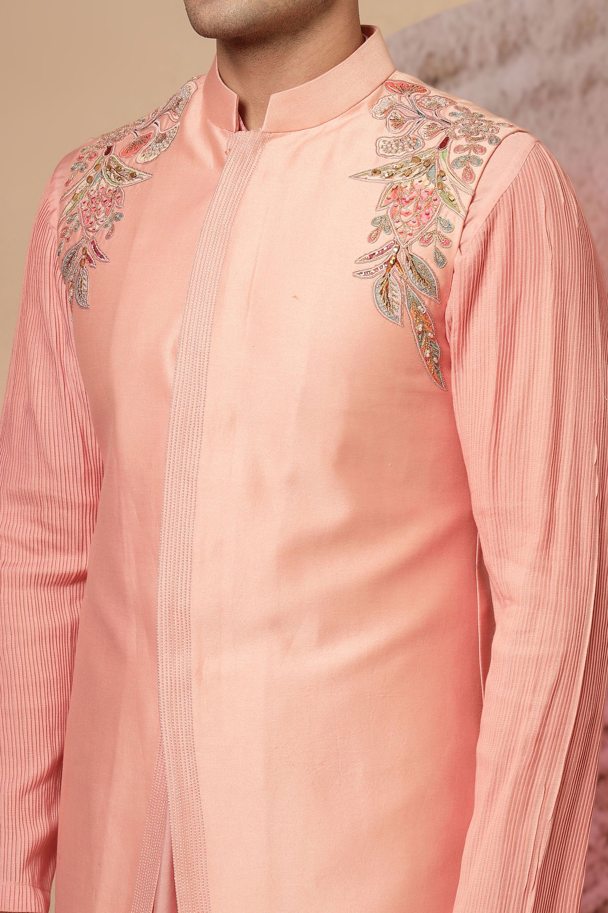 Exuding grace and sophistication, this blush pink silk kurta set is designed for the modern man who appreciates traditional elegance with a contemporary twist. Tailored in luxurious silk fabric, the kurta features a structured silhouette with a mandarin collar and concealed placket, giving it a refined and polished look. The highlight of this ensemble lies in the delicate floral embroidery on the shoulders, adding an artisanal charm to the otherwise minimalistic design. Paired with wide-legged palazzo-style trousers in matching blush silk, this outfit ensures both comfort and effortless style. The soft pastel shade makes it a perfect choice for day weddings, festive occasions, and elegant evening gatherings.