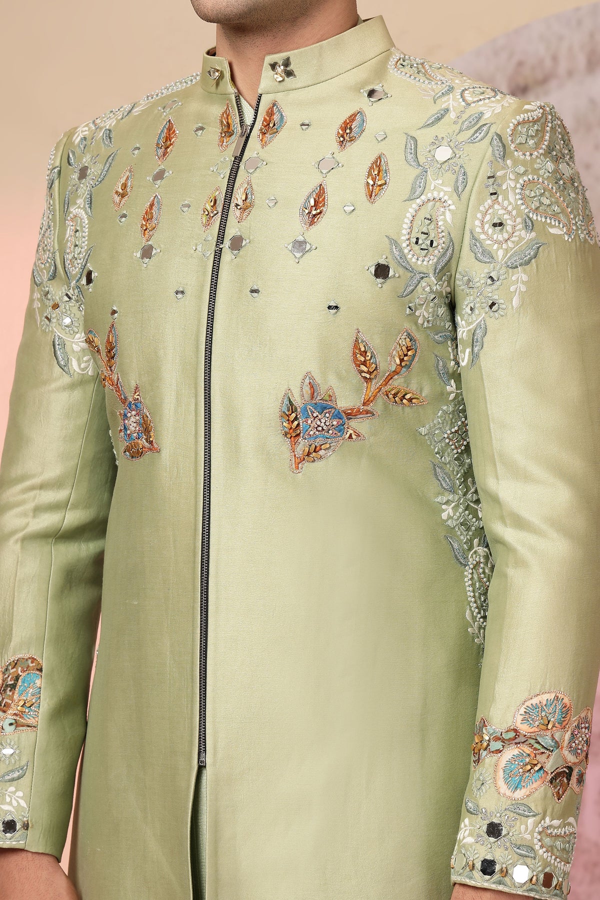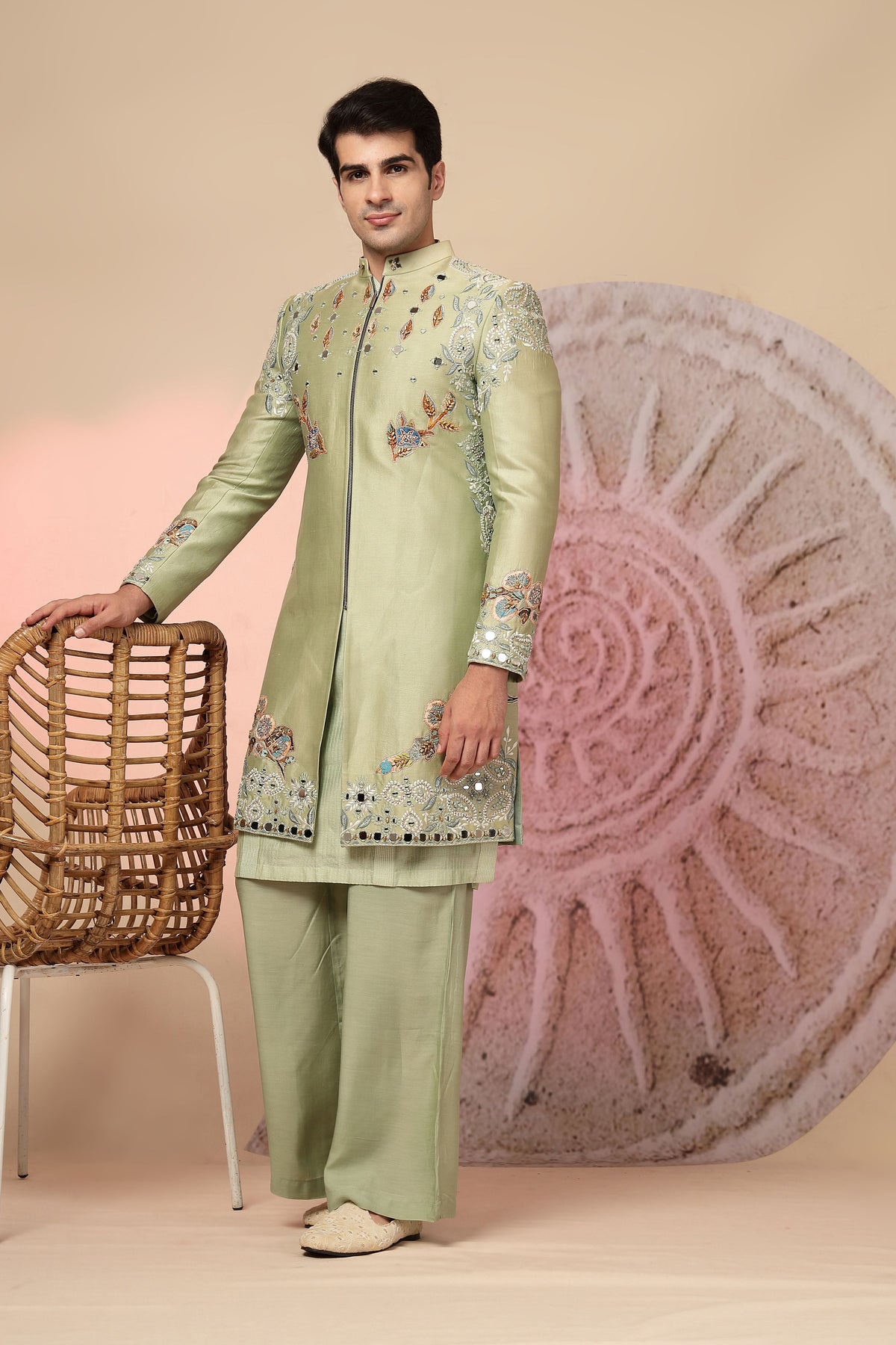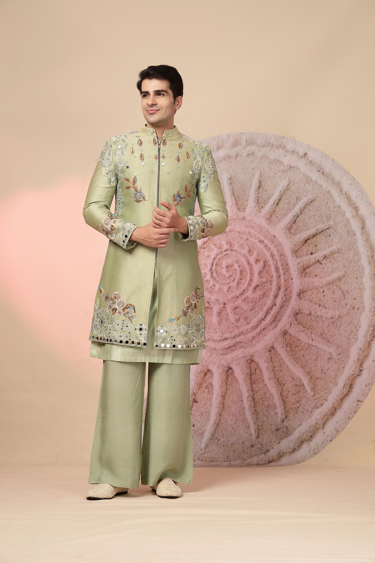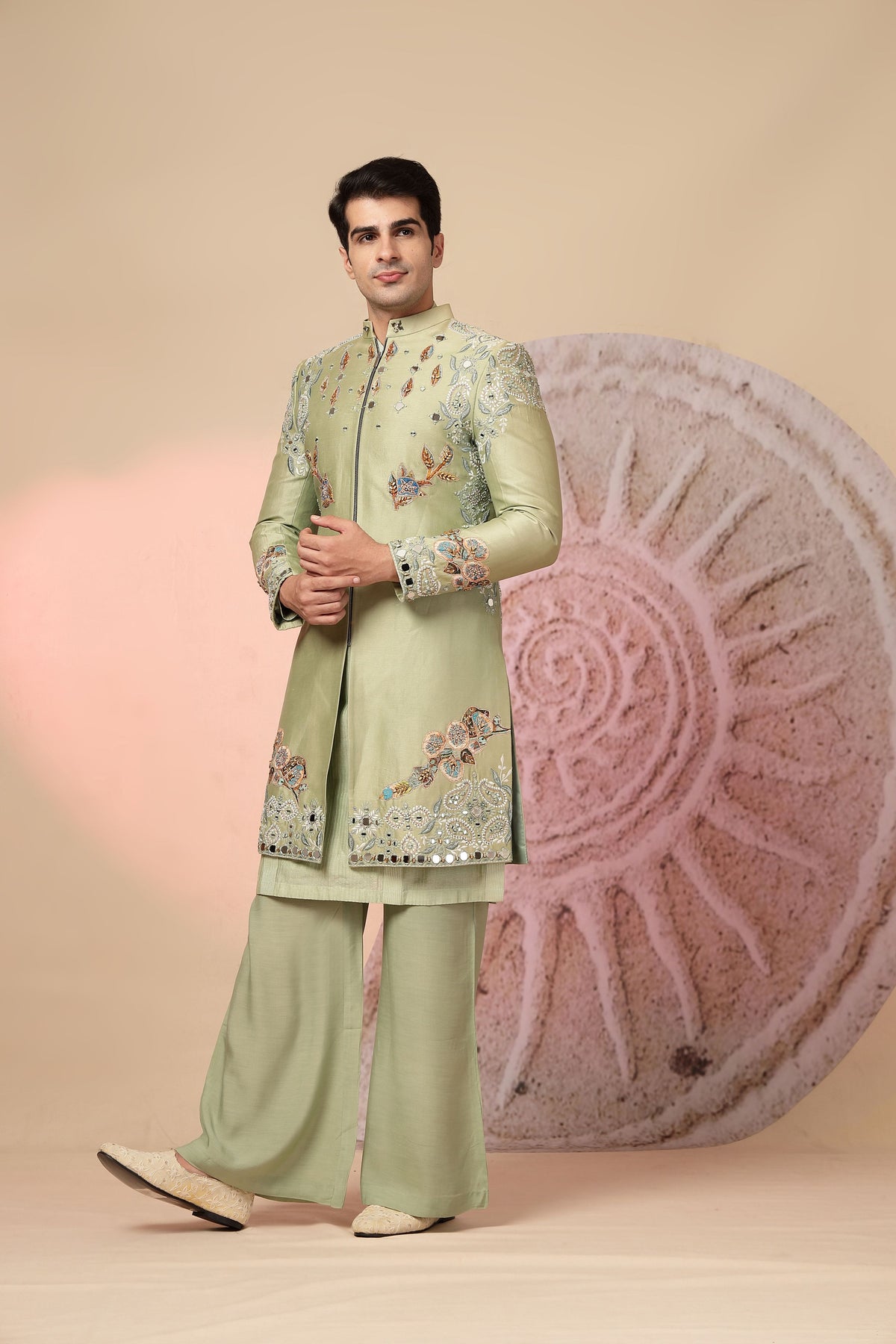 green embroidered jacket with palazzo pants. The jacket has intricate embroidery and mirror work, adding a touch of sparkle and elegance. The matching palazzo pants complete the look, making it a very stylish and eye-catching outfit, suitable for festive occasions.