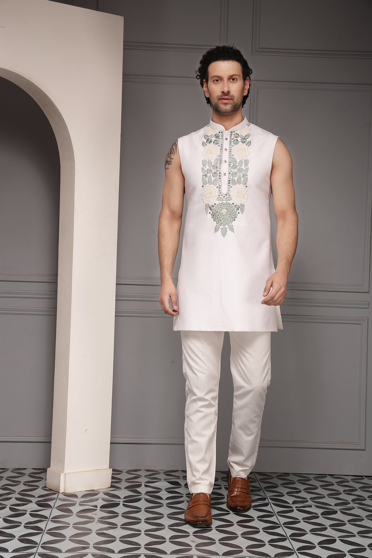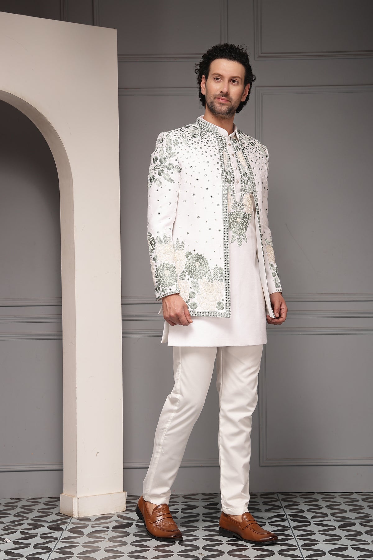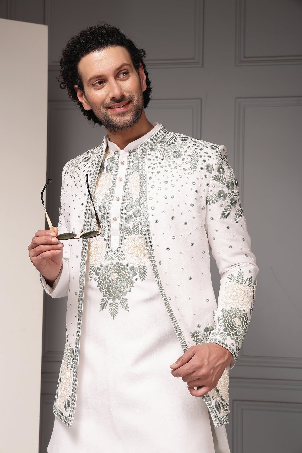 A pristine ivory kurta set layered with a delicately embroidered Nehru jacket, adorned with floral motifs and subtle sequin highlights. Soft, romantic detailing paired with a clean silhouette makes this ensemble an elegant choice for day weddings, mehndi functions, and summer festivities.