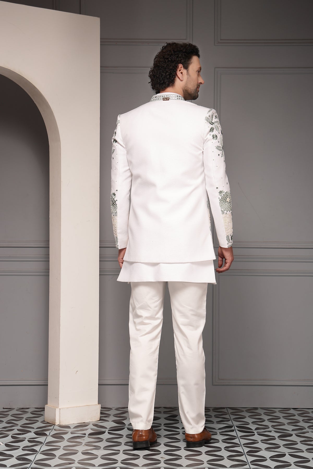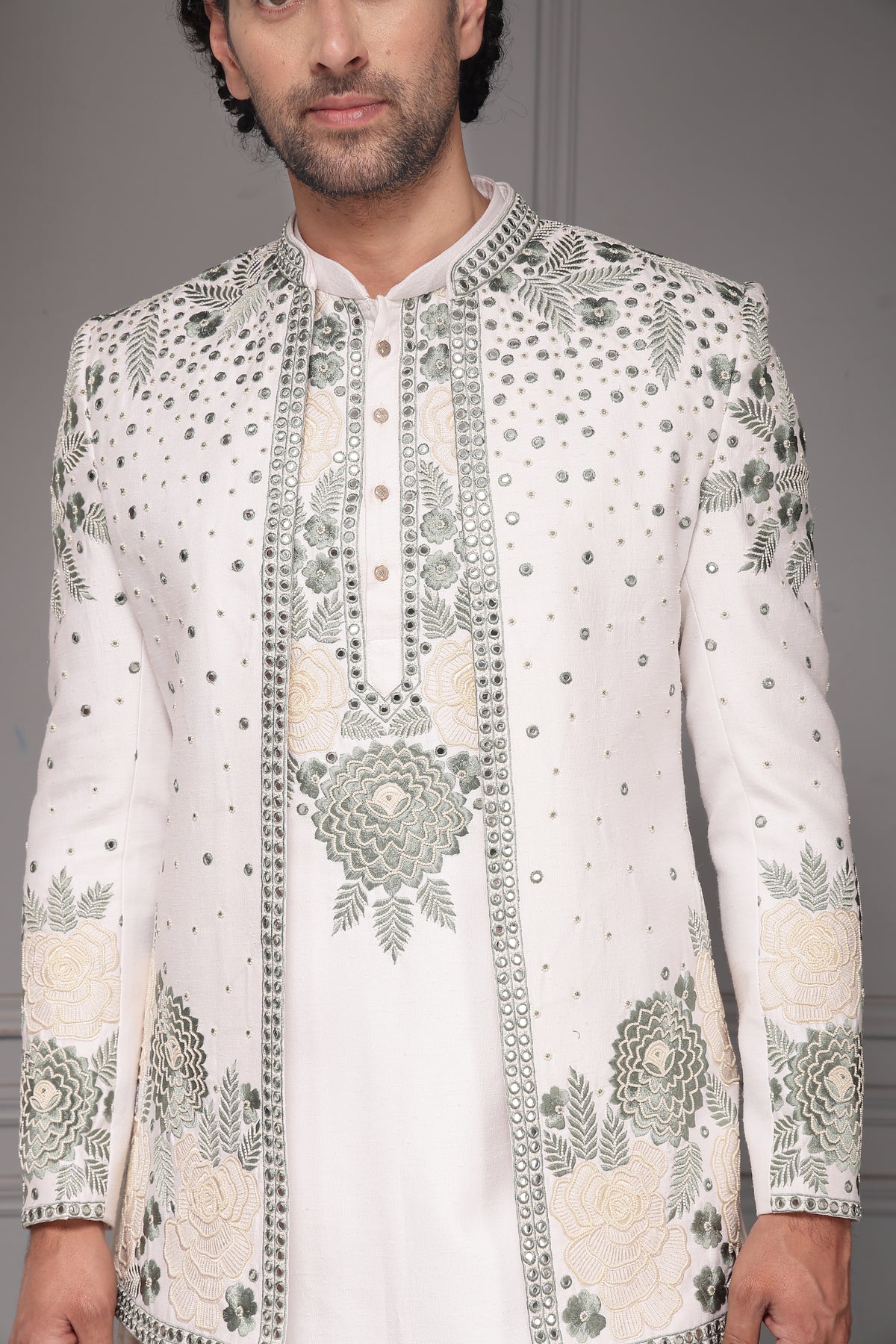 Fabric : Nehru Jacket: Silk Blend Fabric Kurta & Trousers: Premium Silk Blend Embroidery: Ivory, Sage Green & Silver Thread with Sequin Work Lining (Jacket): Soft Poly-Viscose Lining