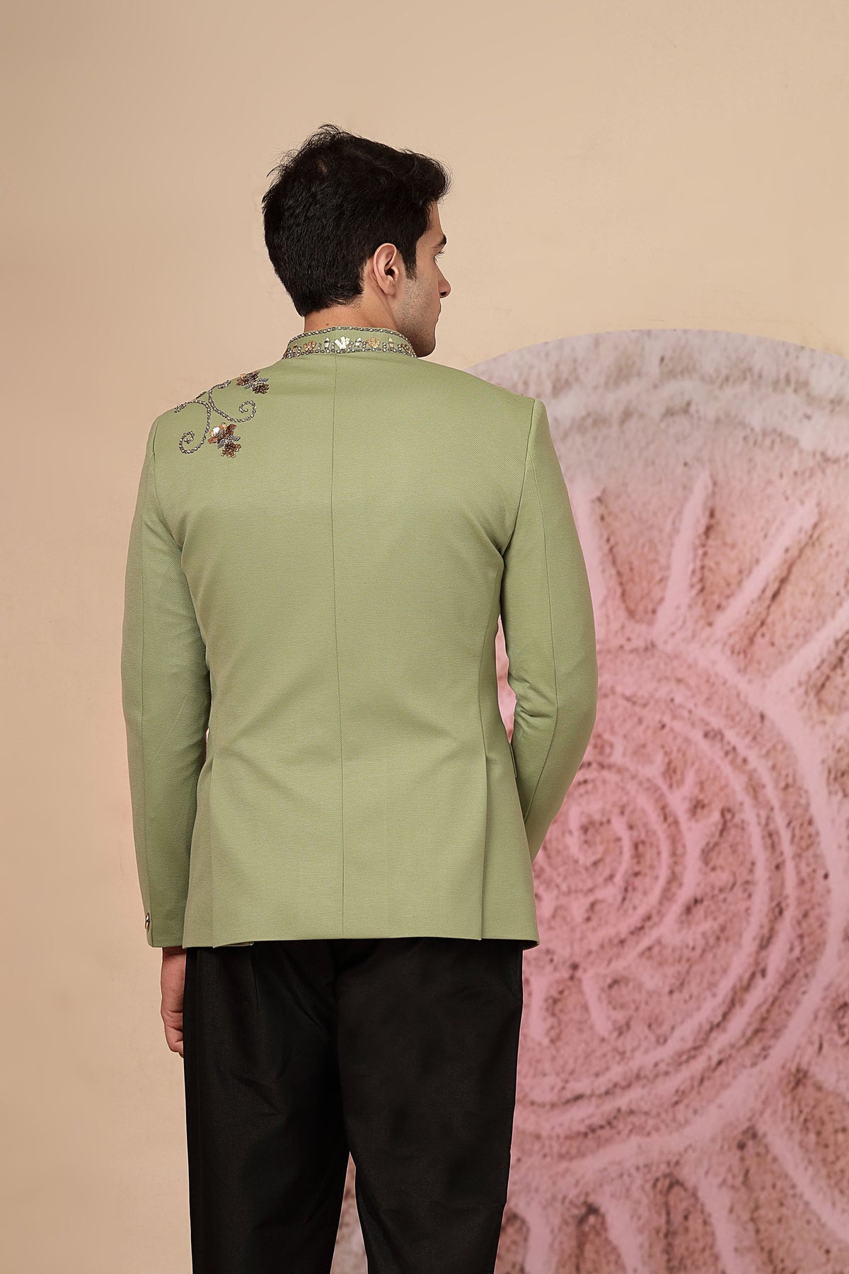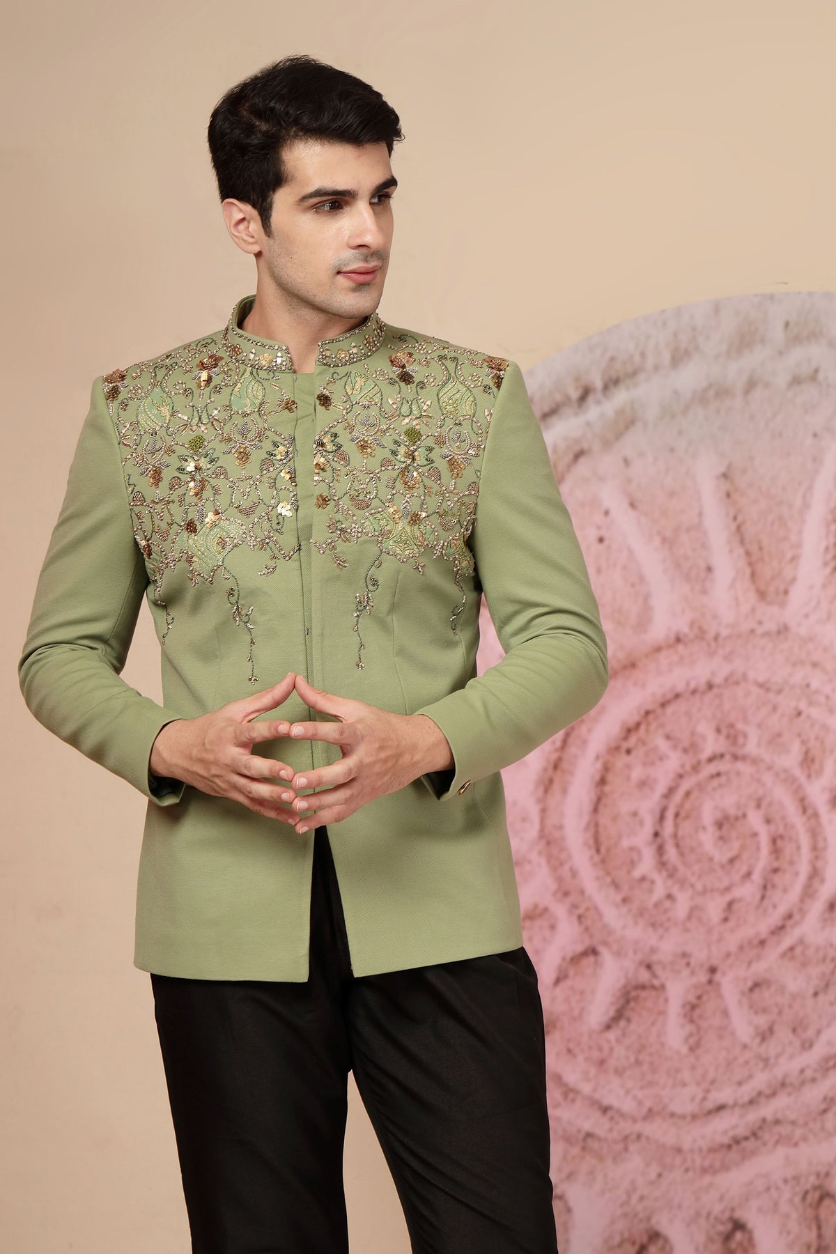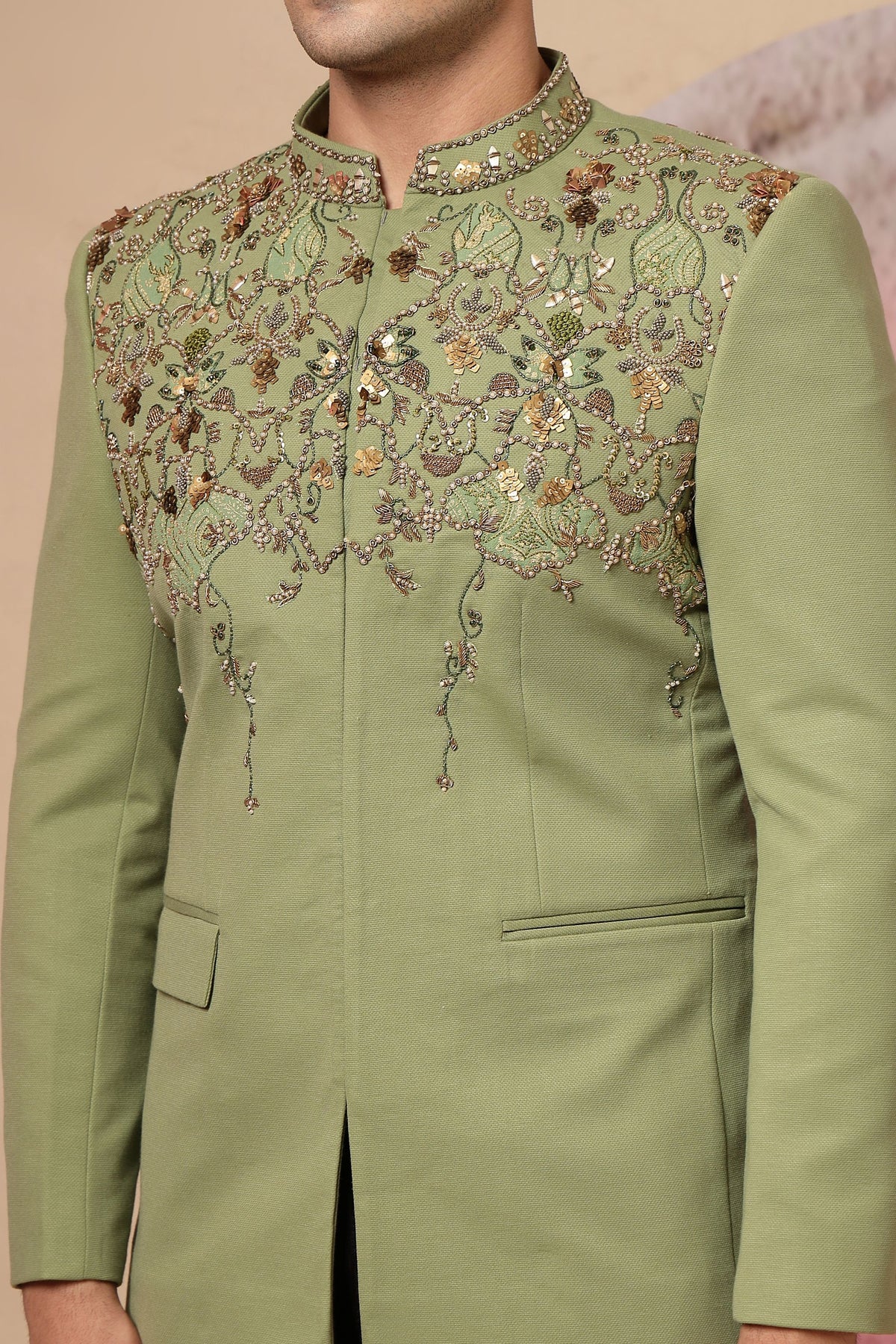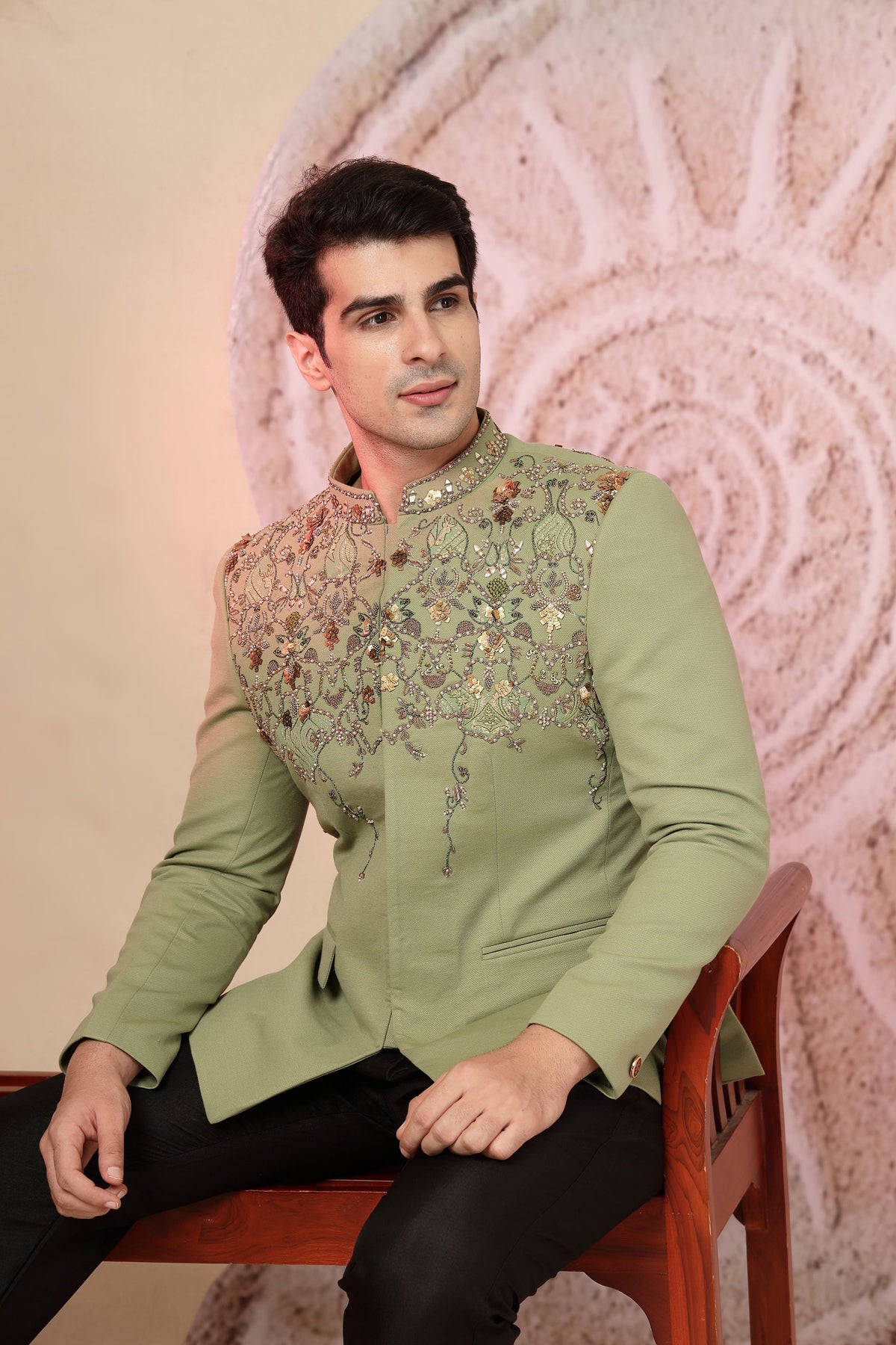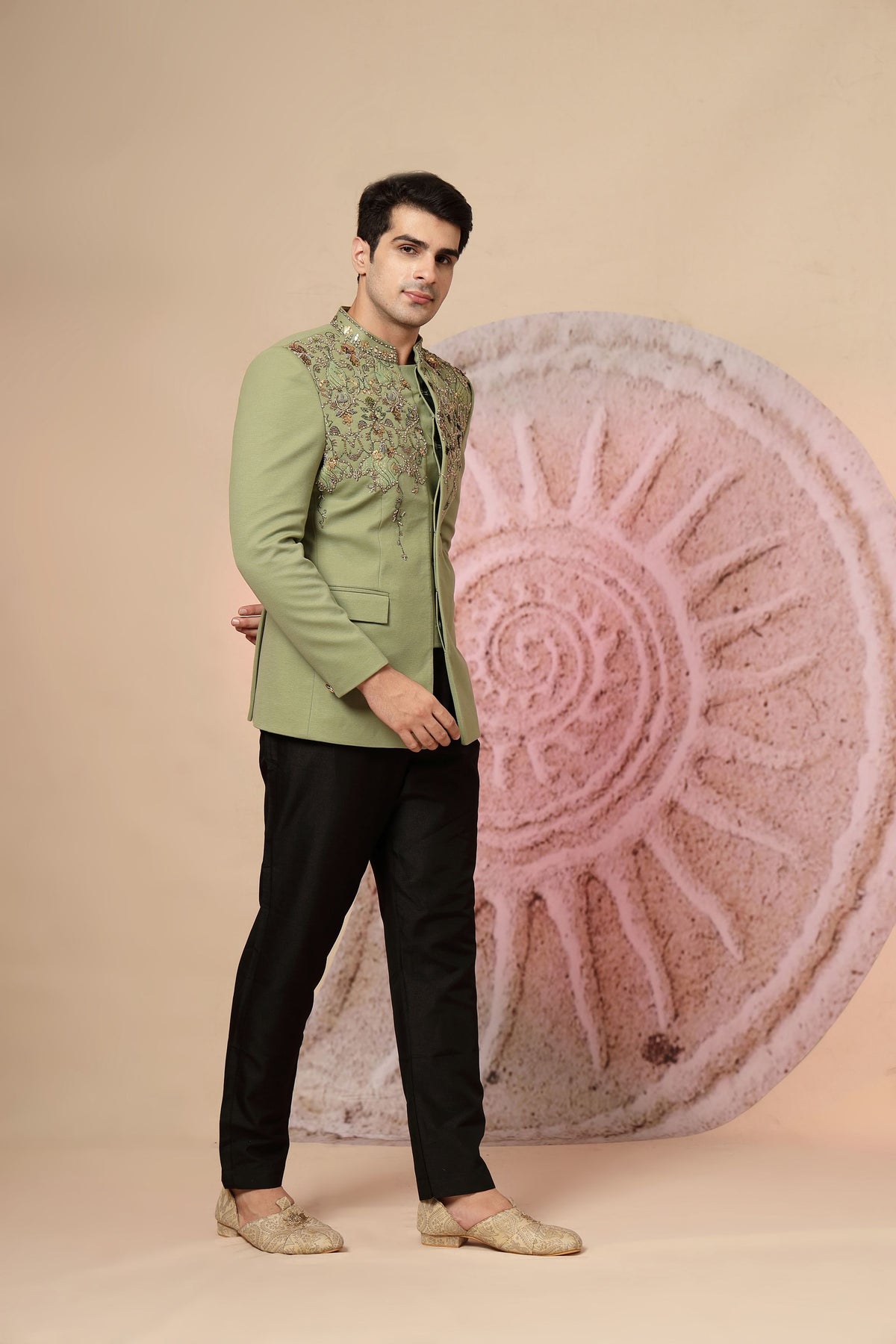 Make a sophisticated statement with this olive green embroidered jacket set, a perfect blend of contemporary tailoring and traditional artistry. Designed for modern men who value elegance, this outfit is ideal for weddings, festive occasions, and cultural celebrations.