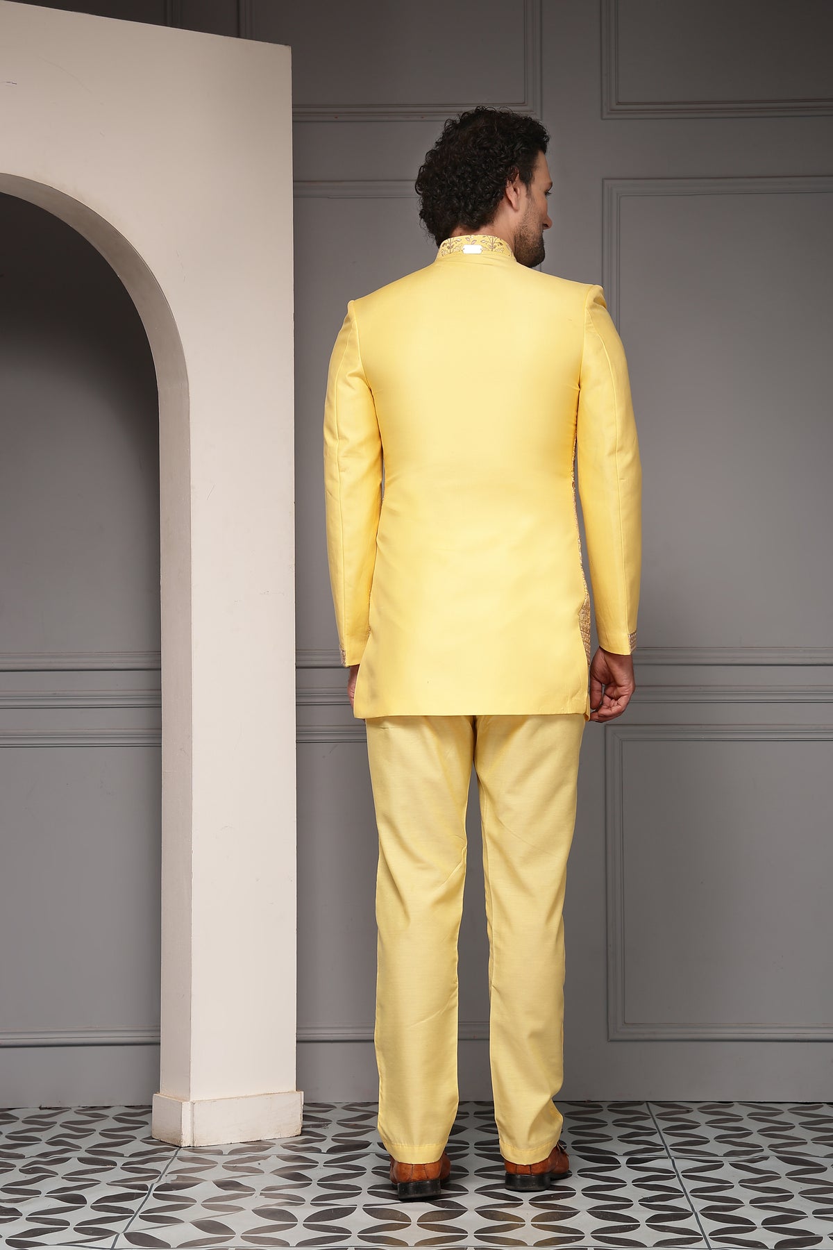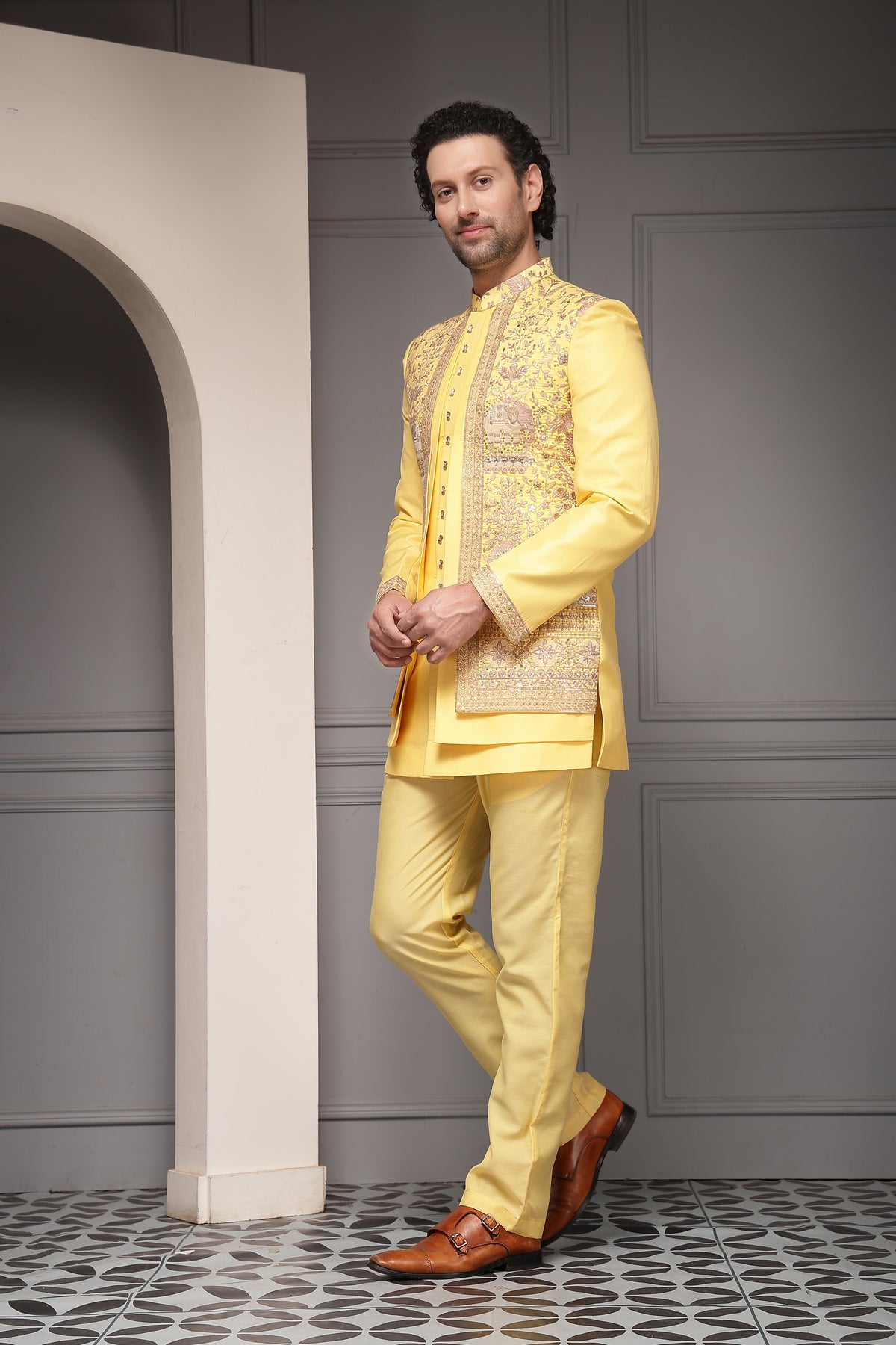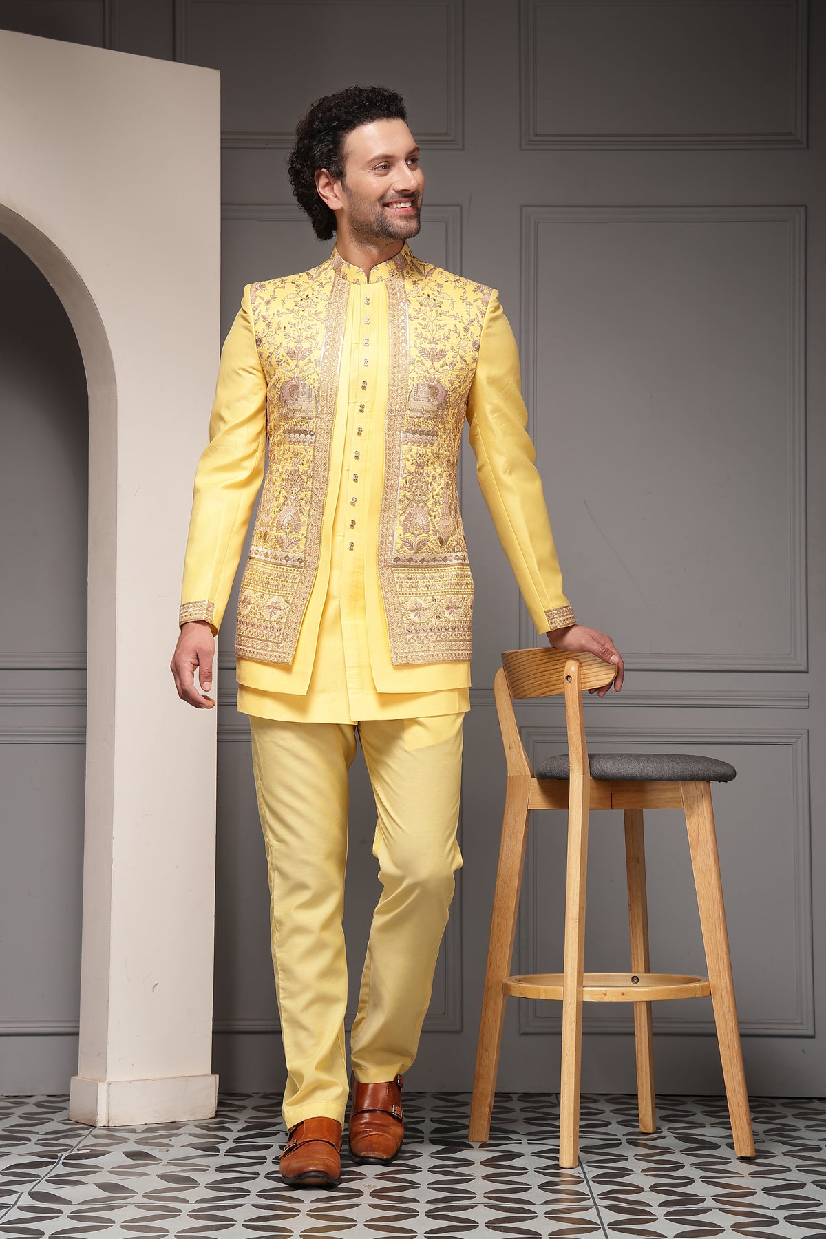 A radiant yellow bandhgala set designed to celebrate joy and festivity. Featuring intricate all-over heritage embroidery inspired by royal motifs, this ensemble blends vibrant colour with traditional craftsmanship—perfect for haldi ceremonies, festive weddings, and celebratory daytime occasions.