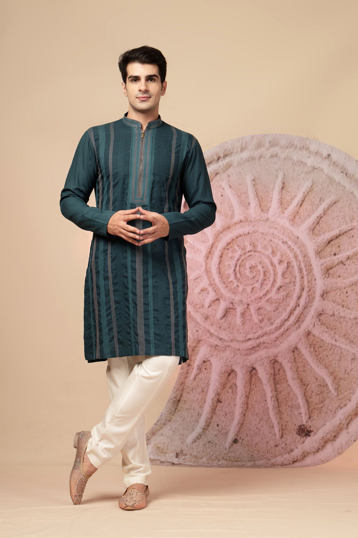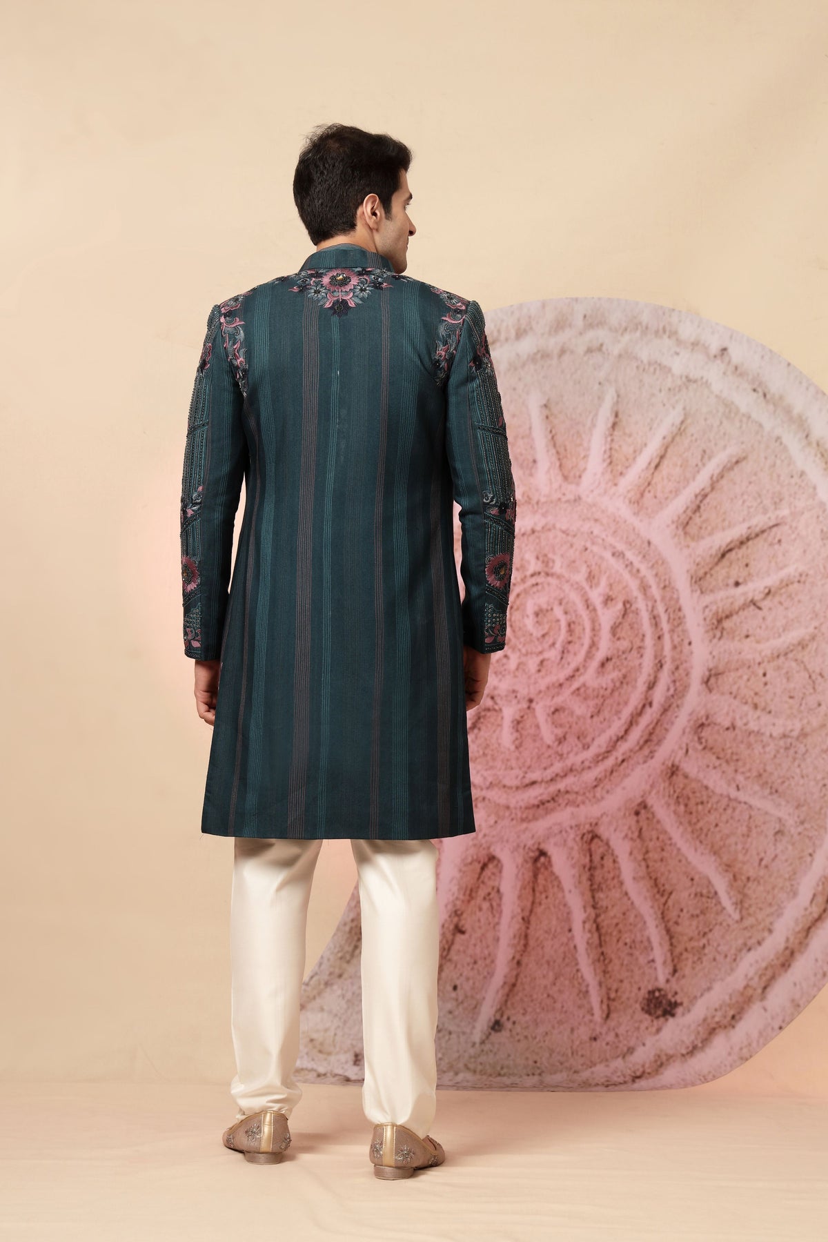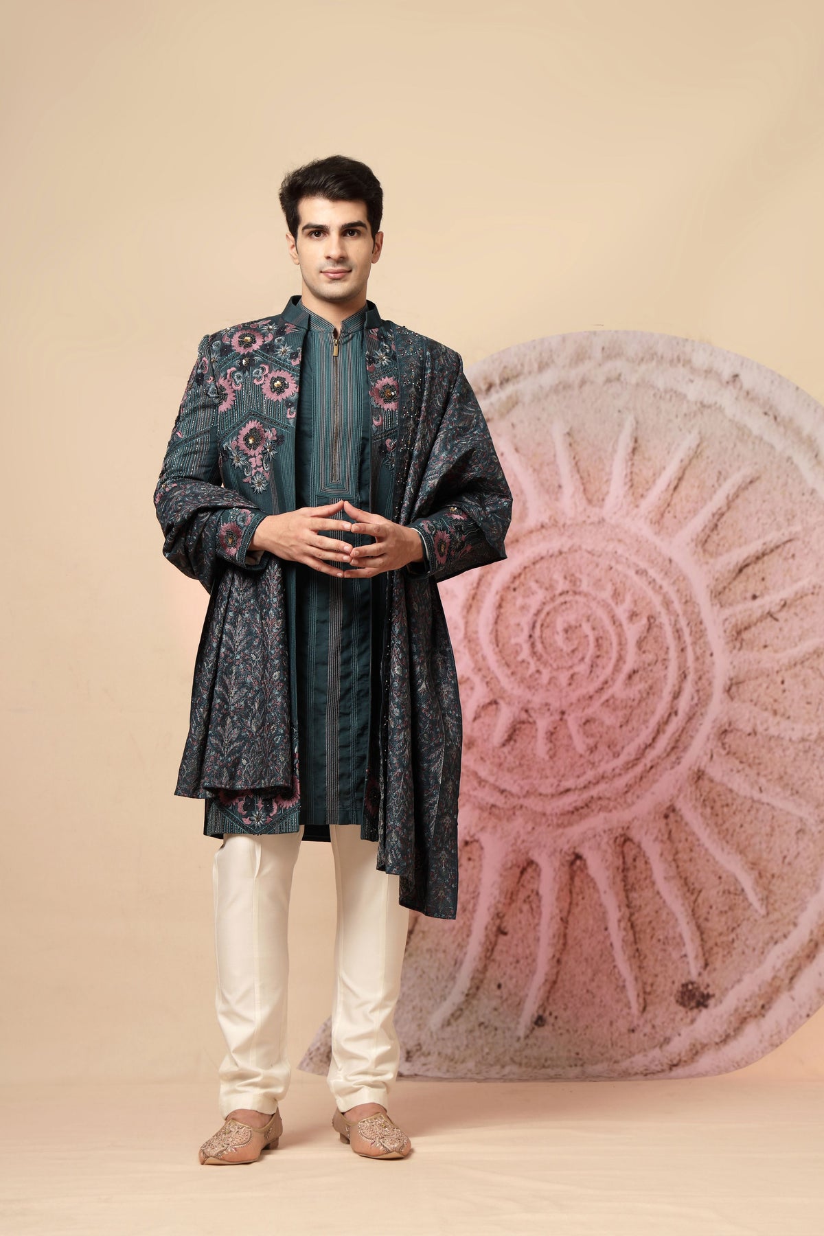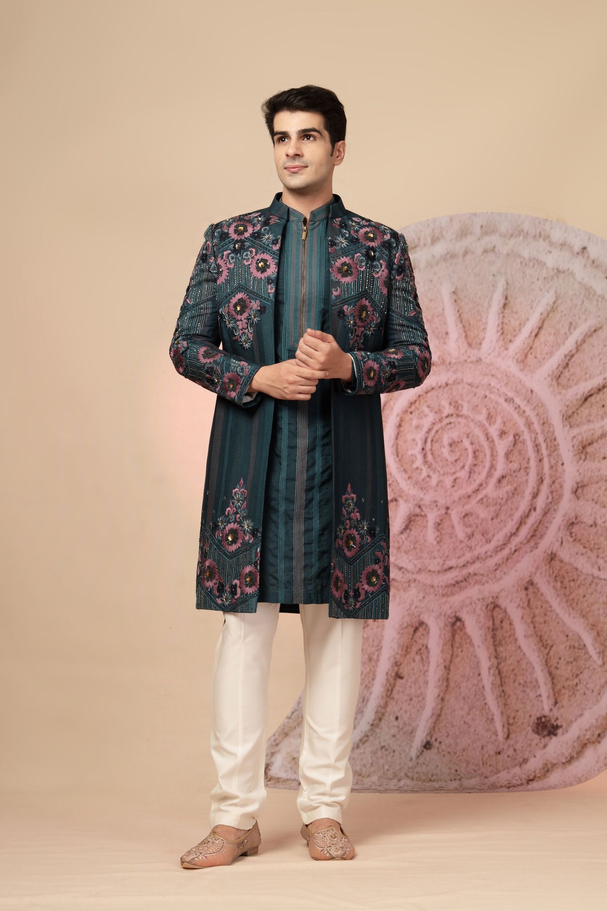 Step into sophistication and style with this stunning teal Indo-Western kurta set, elegantly paired with an intricately designed shawl and ivory trousers. This ensemble is a perfect fusion of modern flair and traditional craftsmanship, designed for men who want to make a lasting impression at weddings, receptions, or festive gatherings. The outfit features a teal jacket-style kurta adorned with delicate floral embroidery on the shoulders and chest in shades of pink and grey. It is tailored in a contemporary silhouette with a mandarin collar and concealed placket, offering a sleek, refined look.