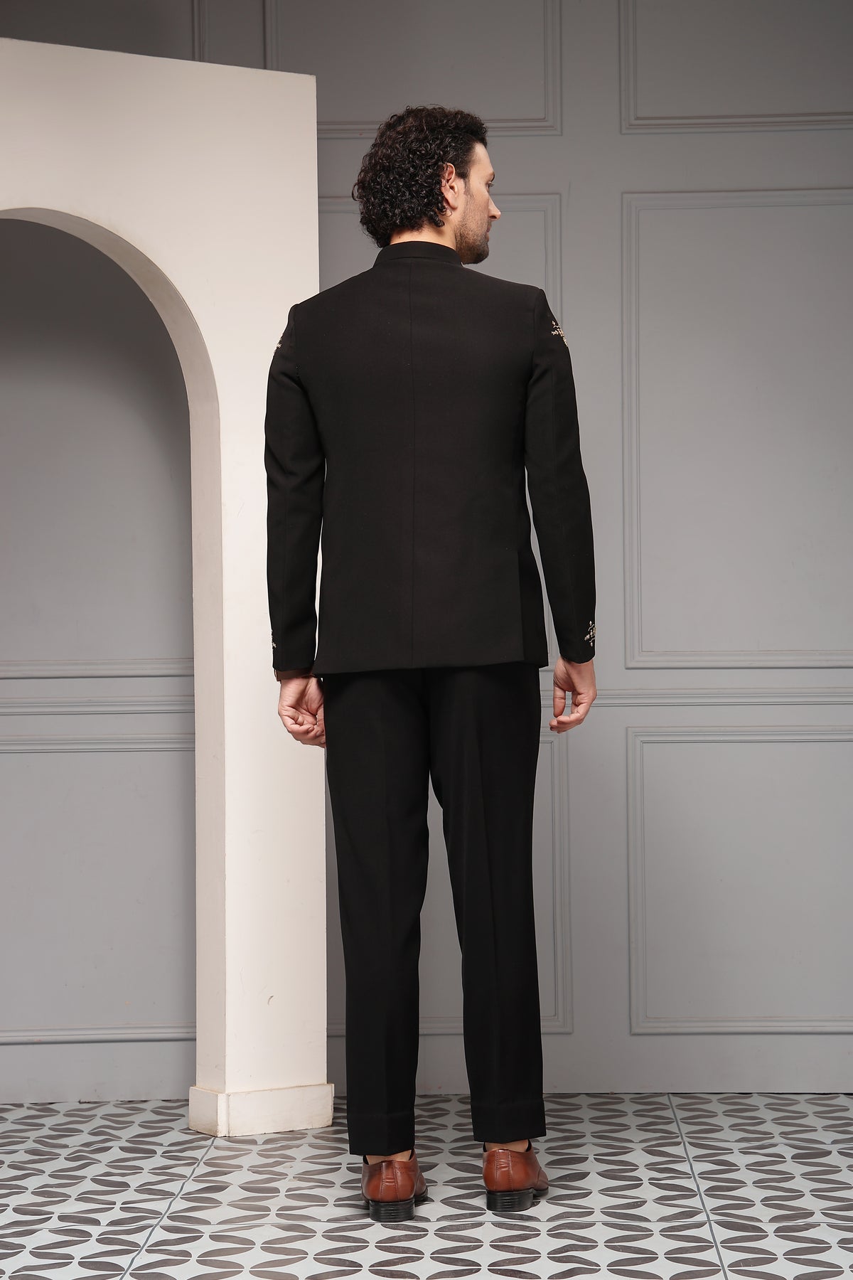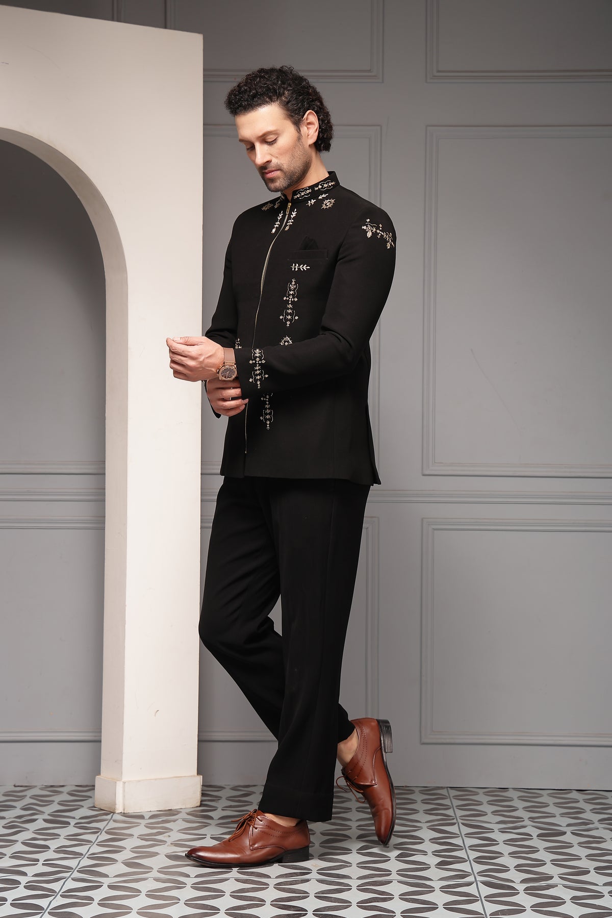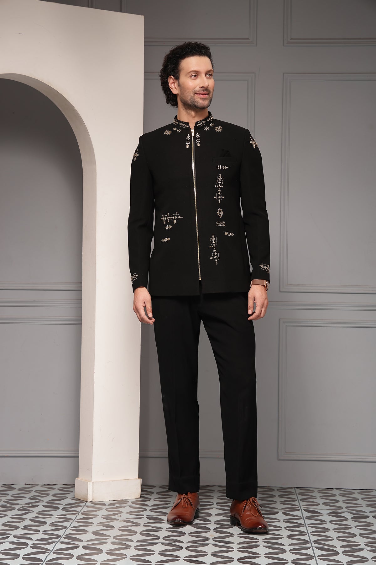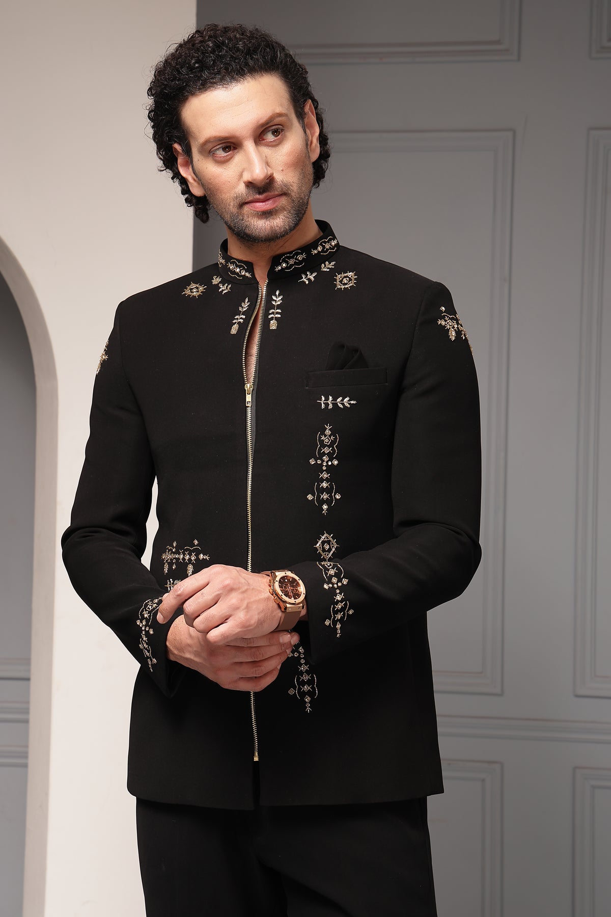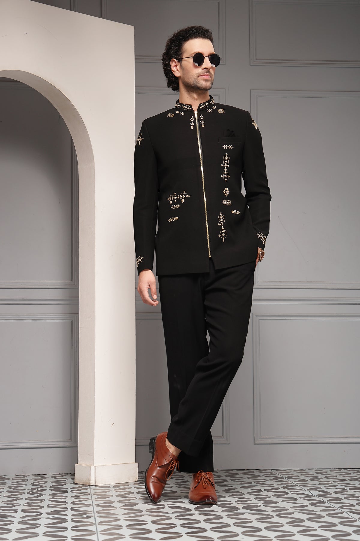 A refined black bandhgala jacket accented with delicate antique-gold embroidery and a sleek front zip closure. Intricately placed motifs across the collar, chest, sleeves, and hem add artisanal depth, making this ensemble a perfect balance of modern structure and regal tradition.