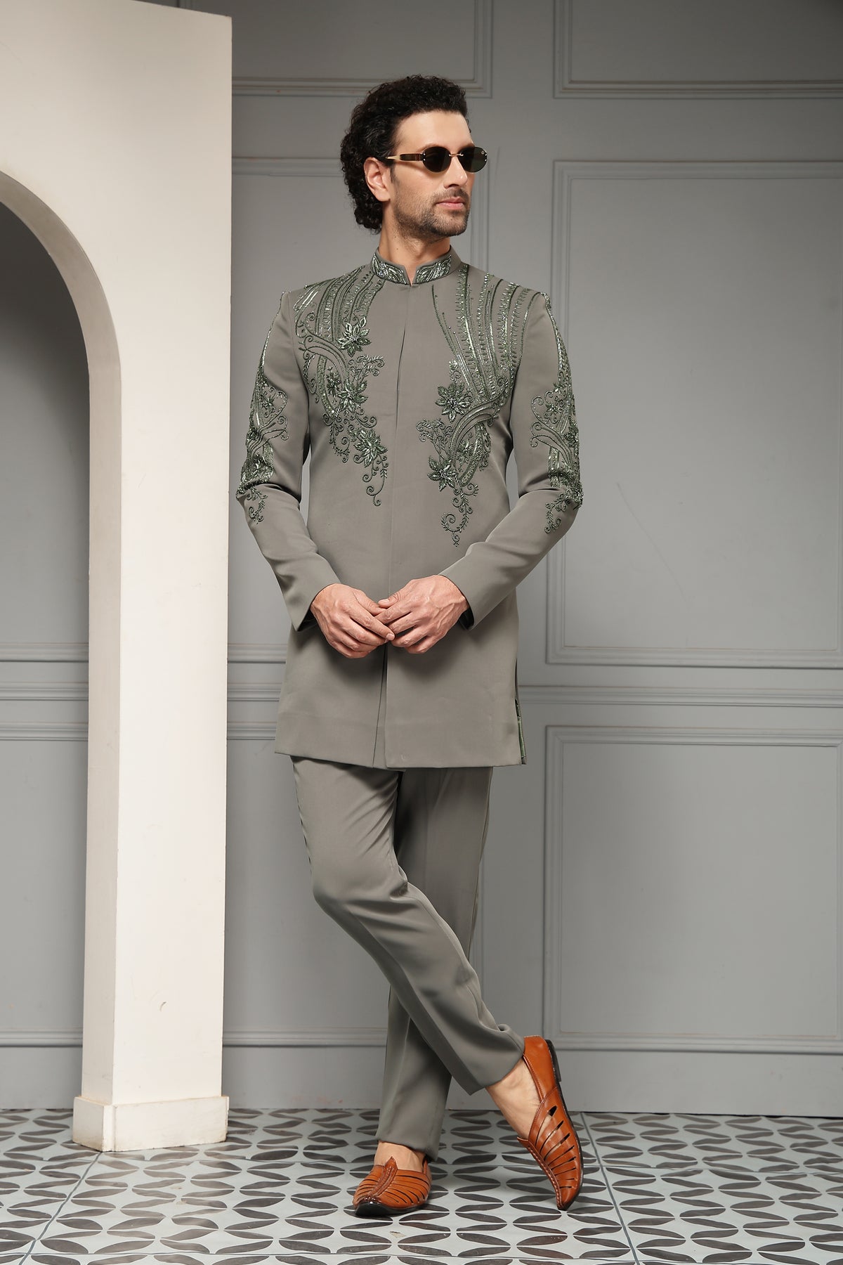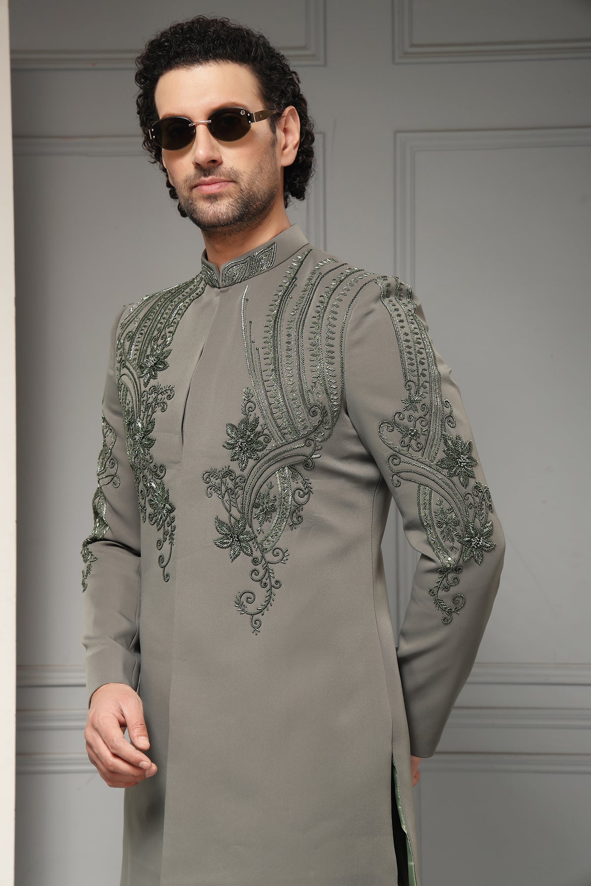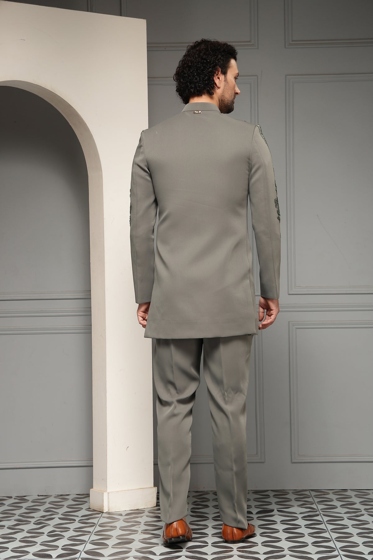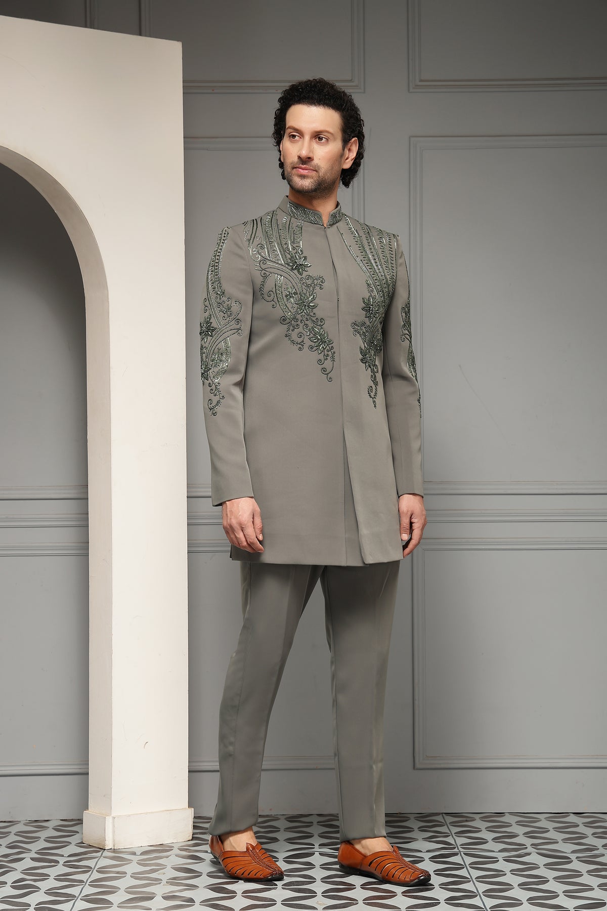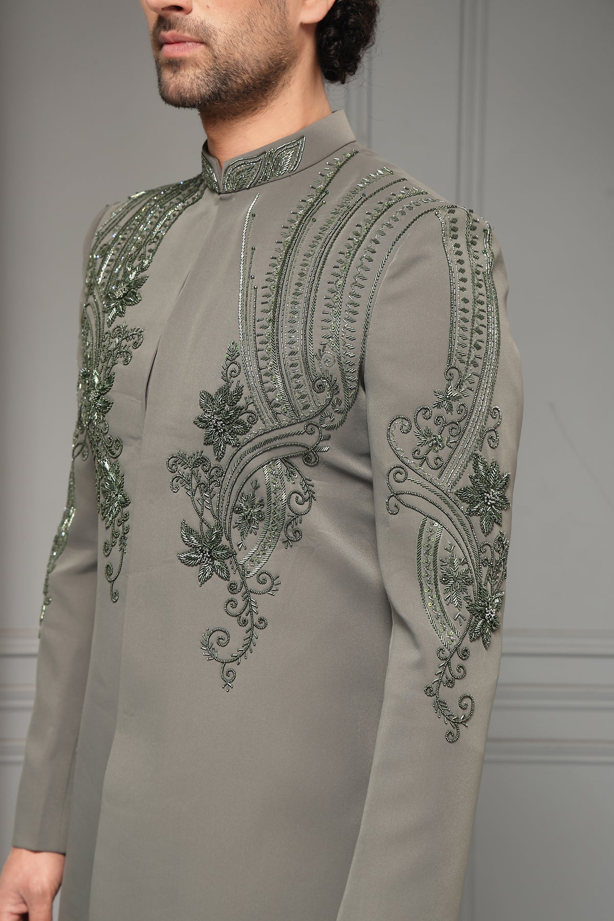 A refined bandhgala set in a sophisticated ash-grey tone, elevated with intricate tonal embroidery across the chest, shoulders, and sleeves. The sculpted motifs and clean tailoring create a harmonious blend of regal tradition and contemporary elegance, ideal for weddings and formal soirées.