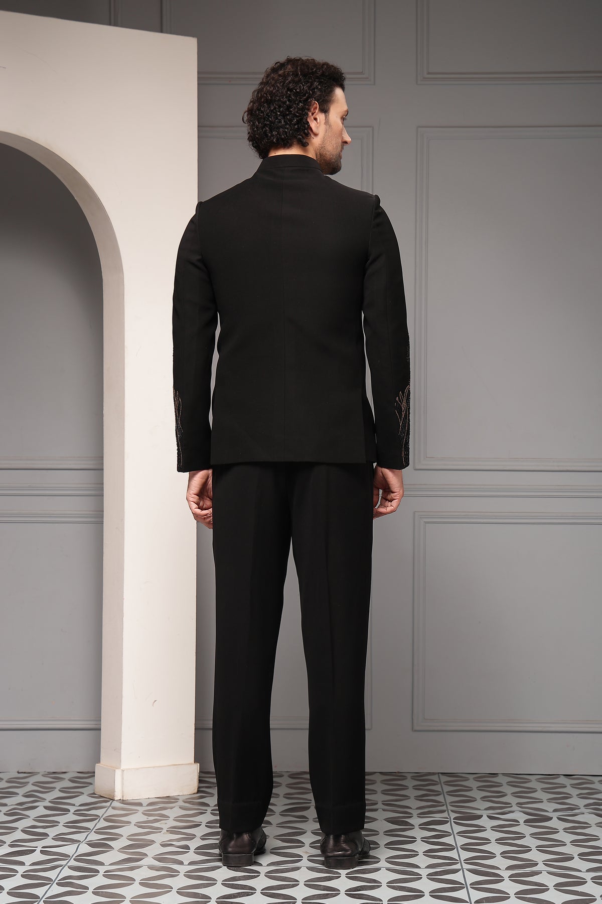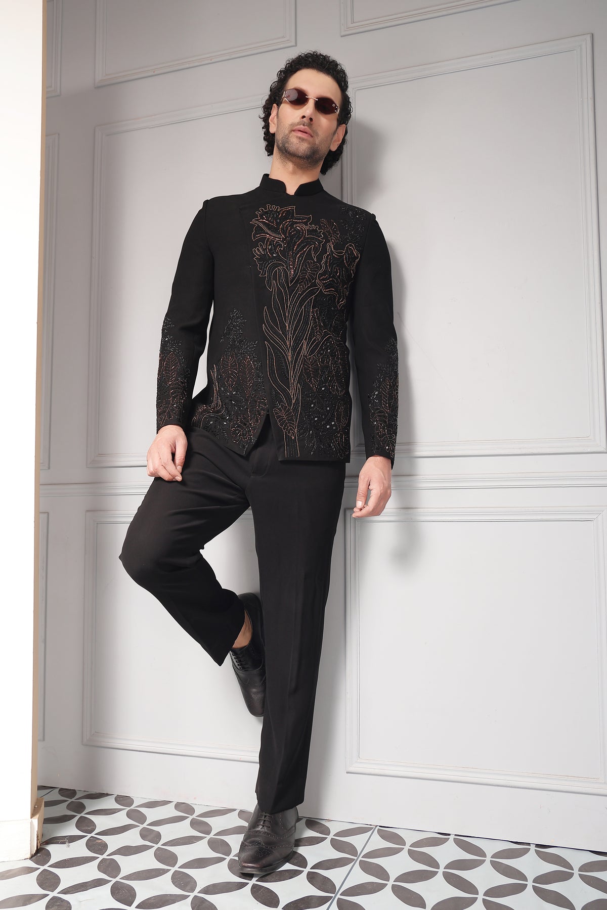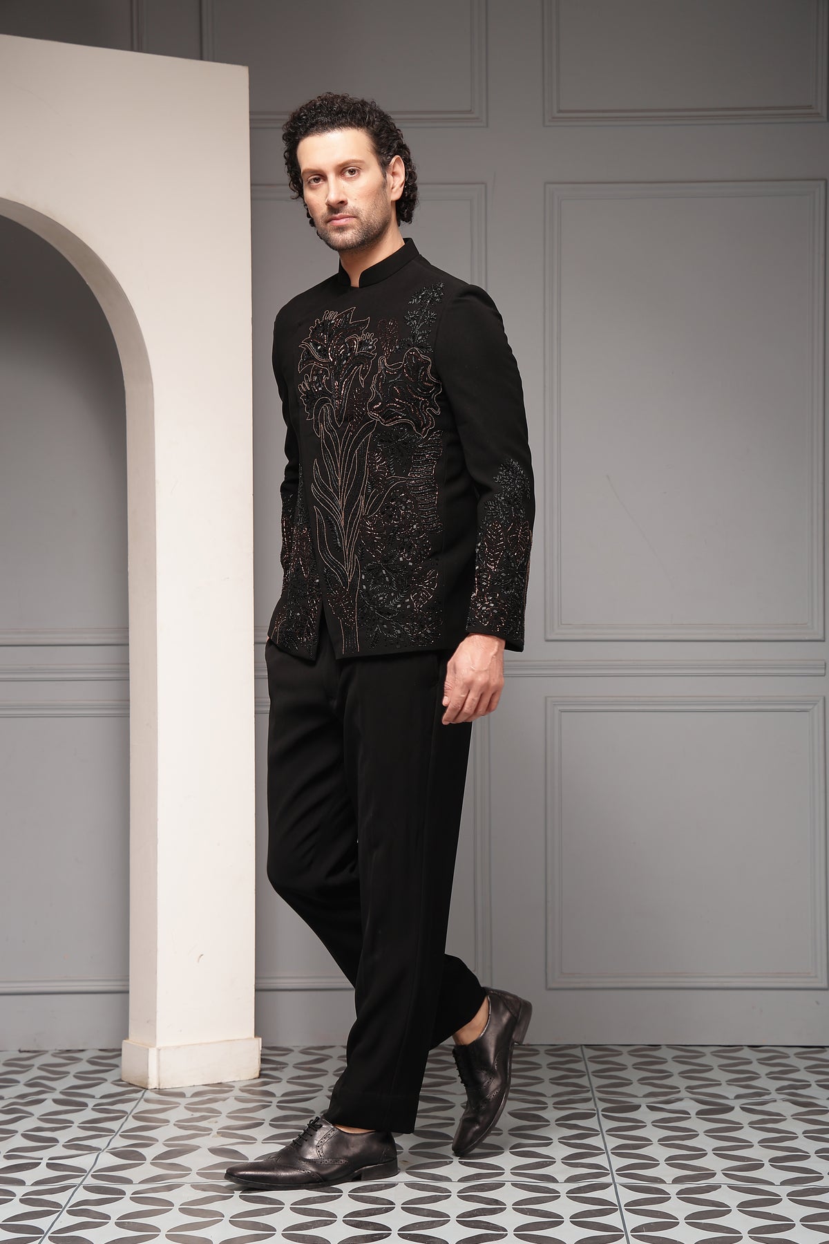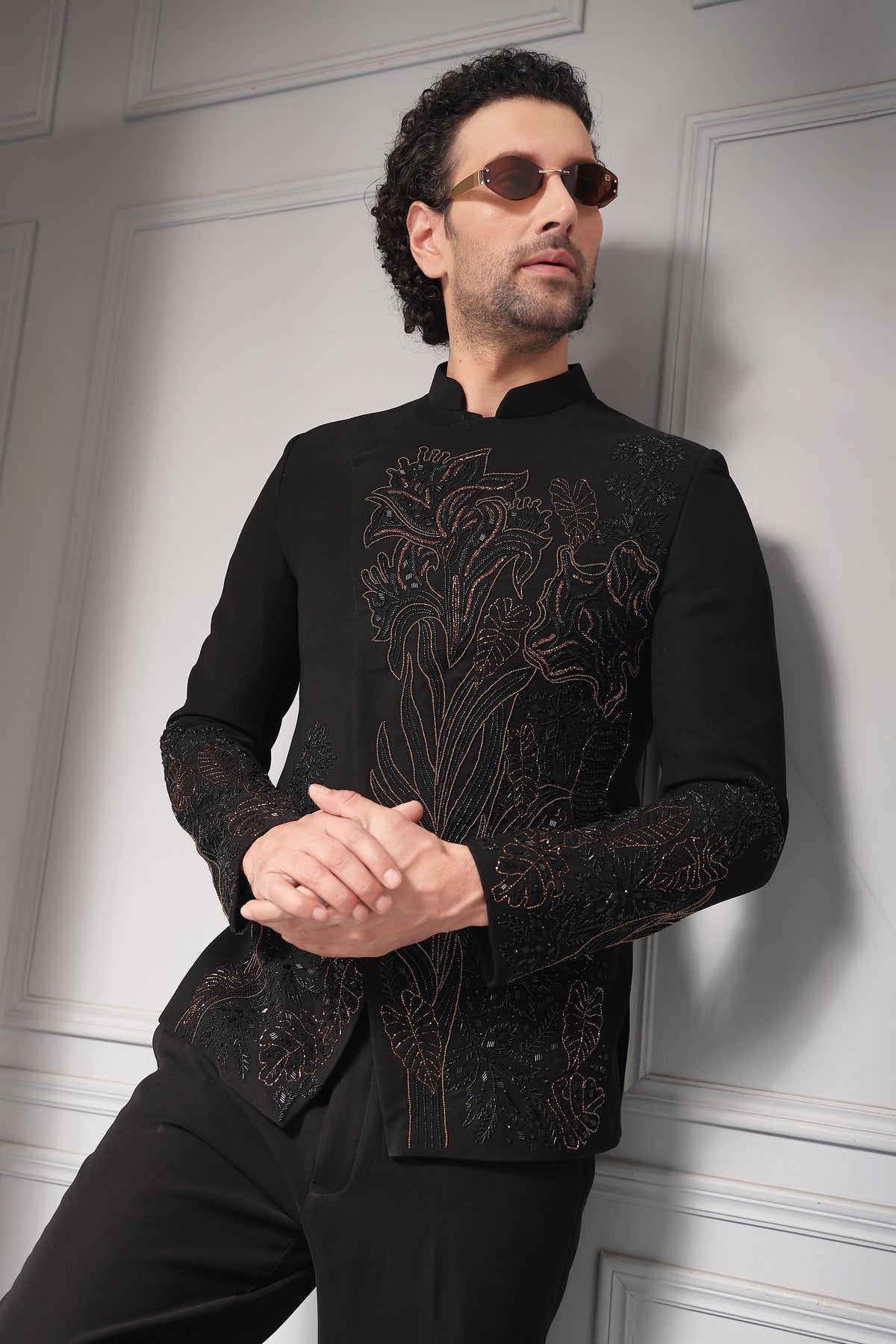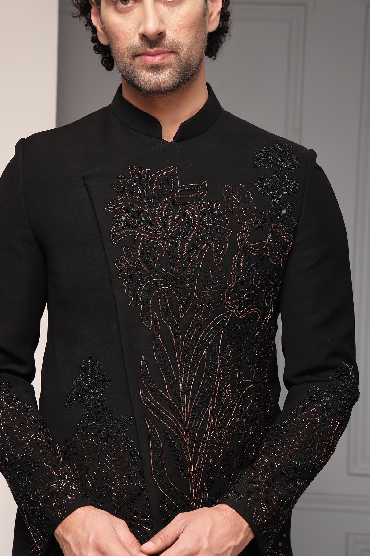 A statement black bandhgala set highlighted with intricate floral embroidery rendered in subtle metallic tones. The artwork flows organically across the front and sleeves, creating depth and drama while maintaining a refined, contemporary silhouette.