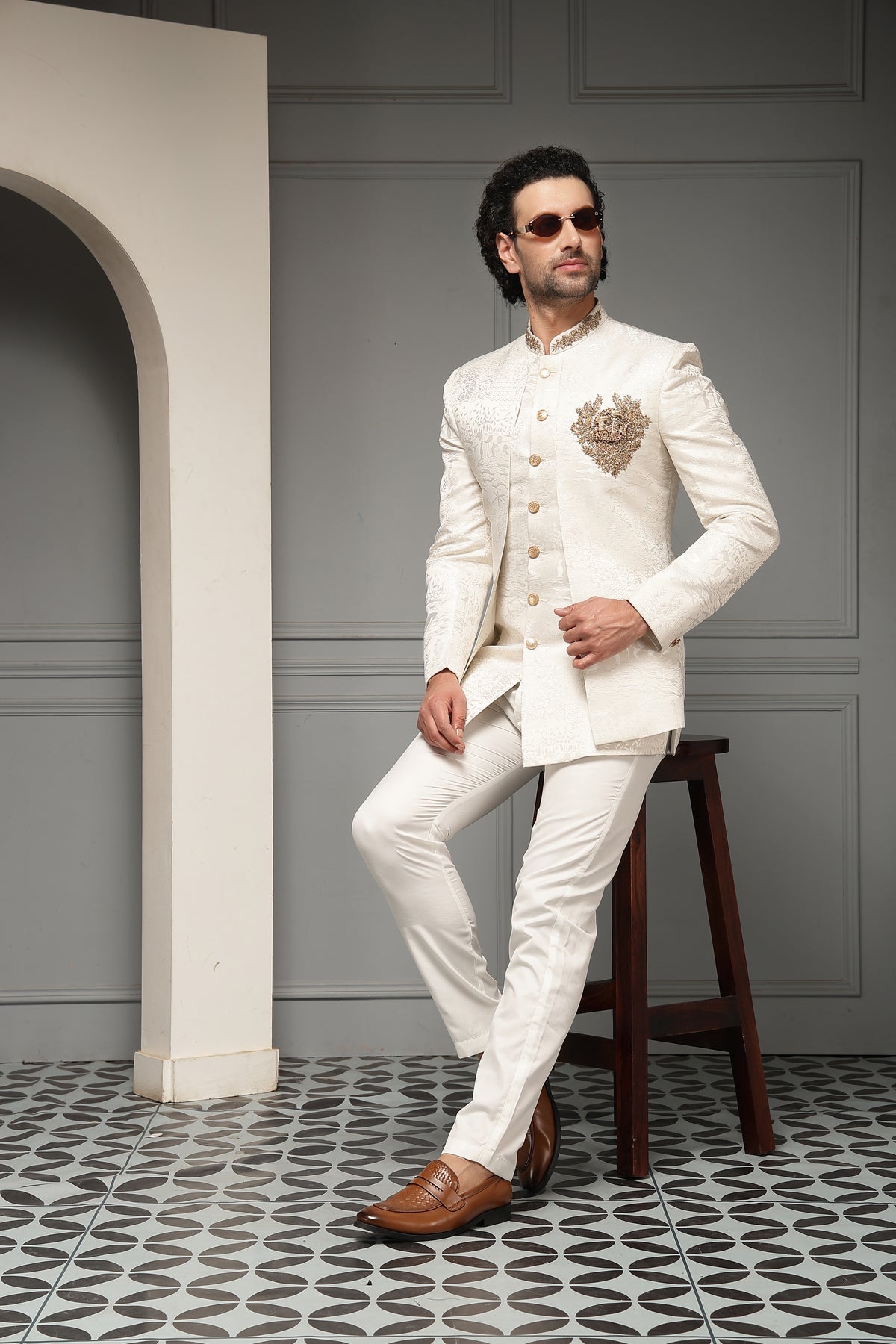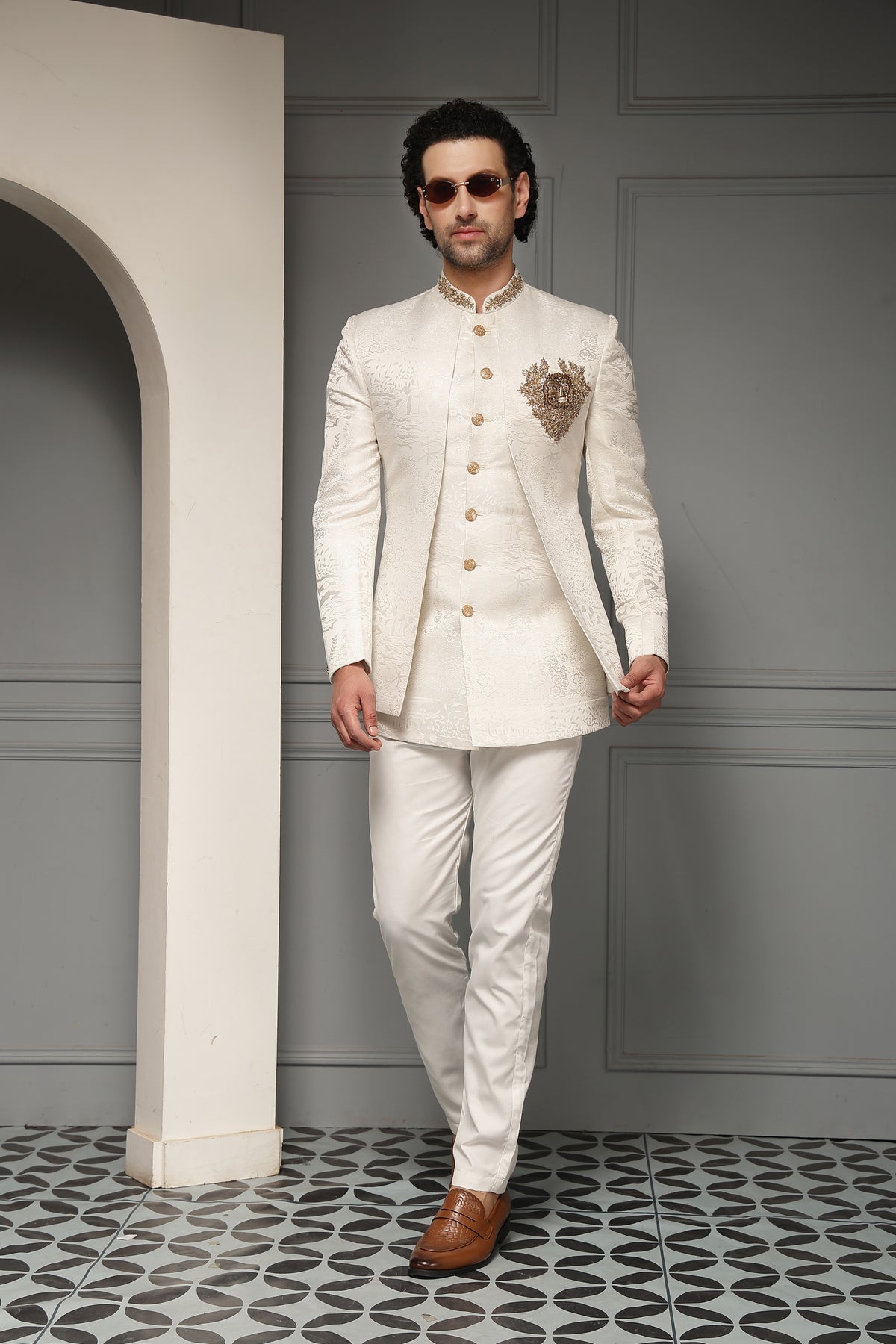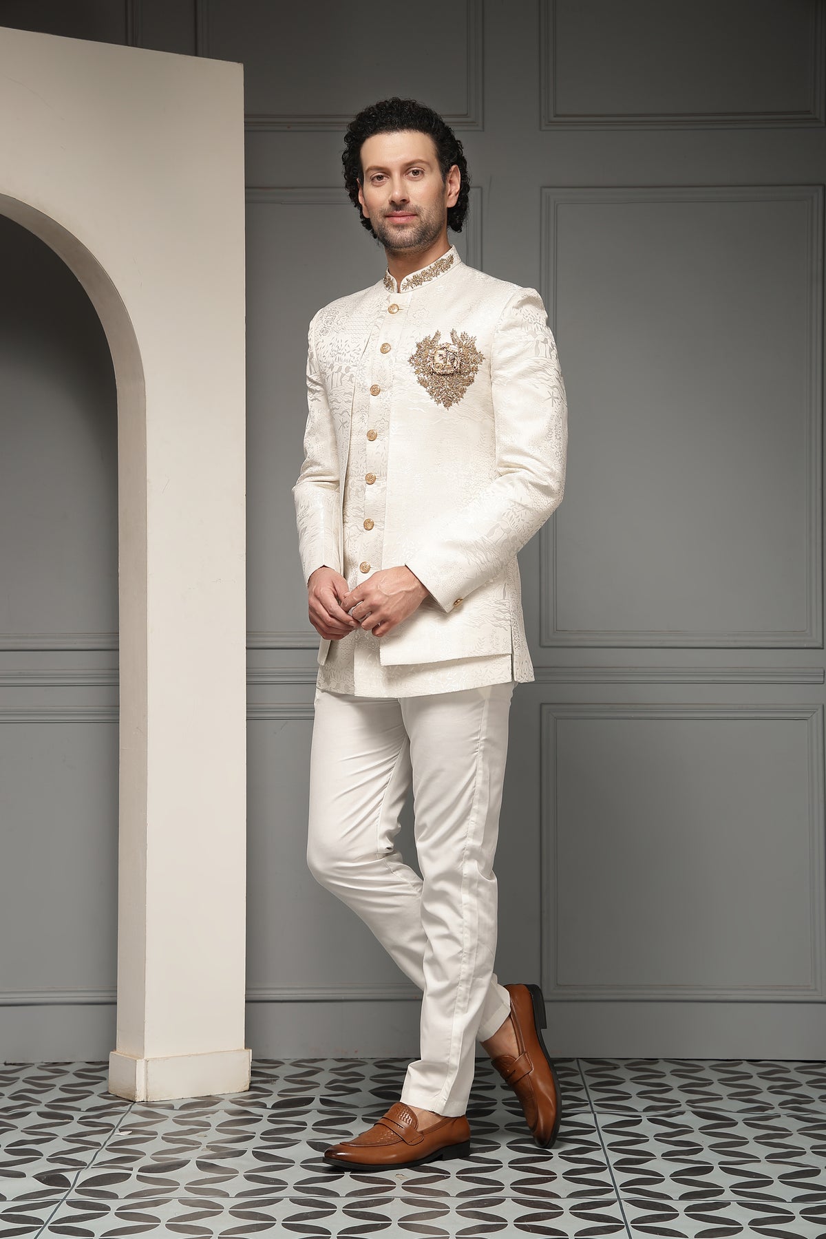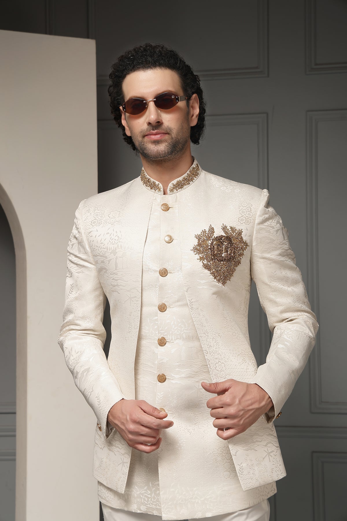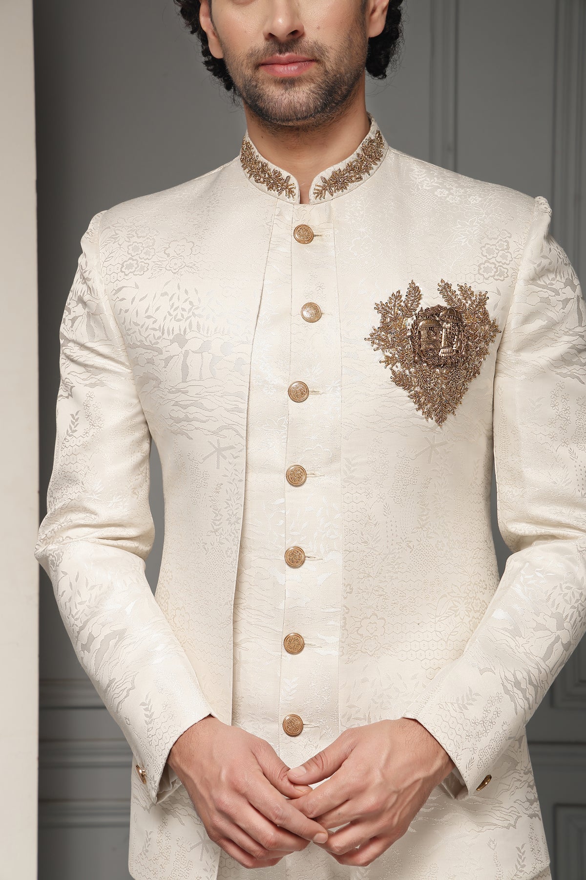 A regal ivory bandh gala set crafted in rich textured fabric and highlighted with an ornate antique-gold crest motif. The refined embroidery and classic silhouette evoke royal elegance, making this ensemble an impeccable choice for weddings, receptions, and ceremonial occasions.