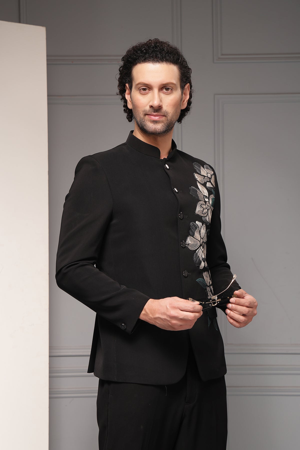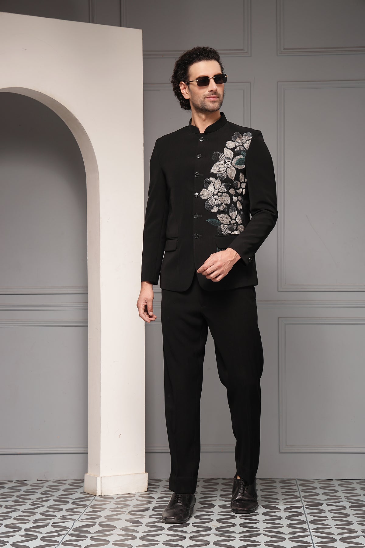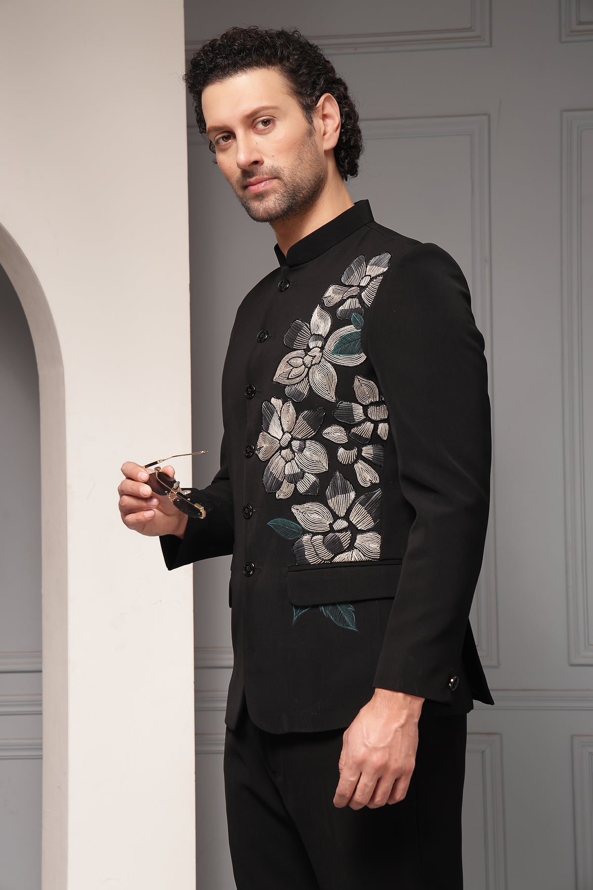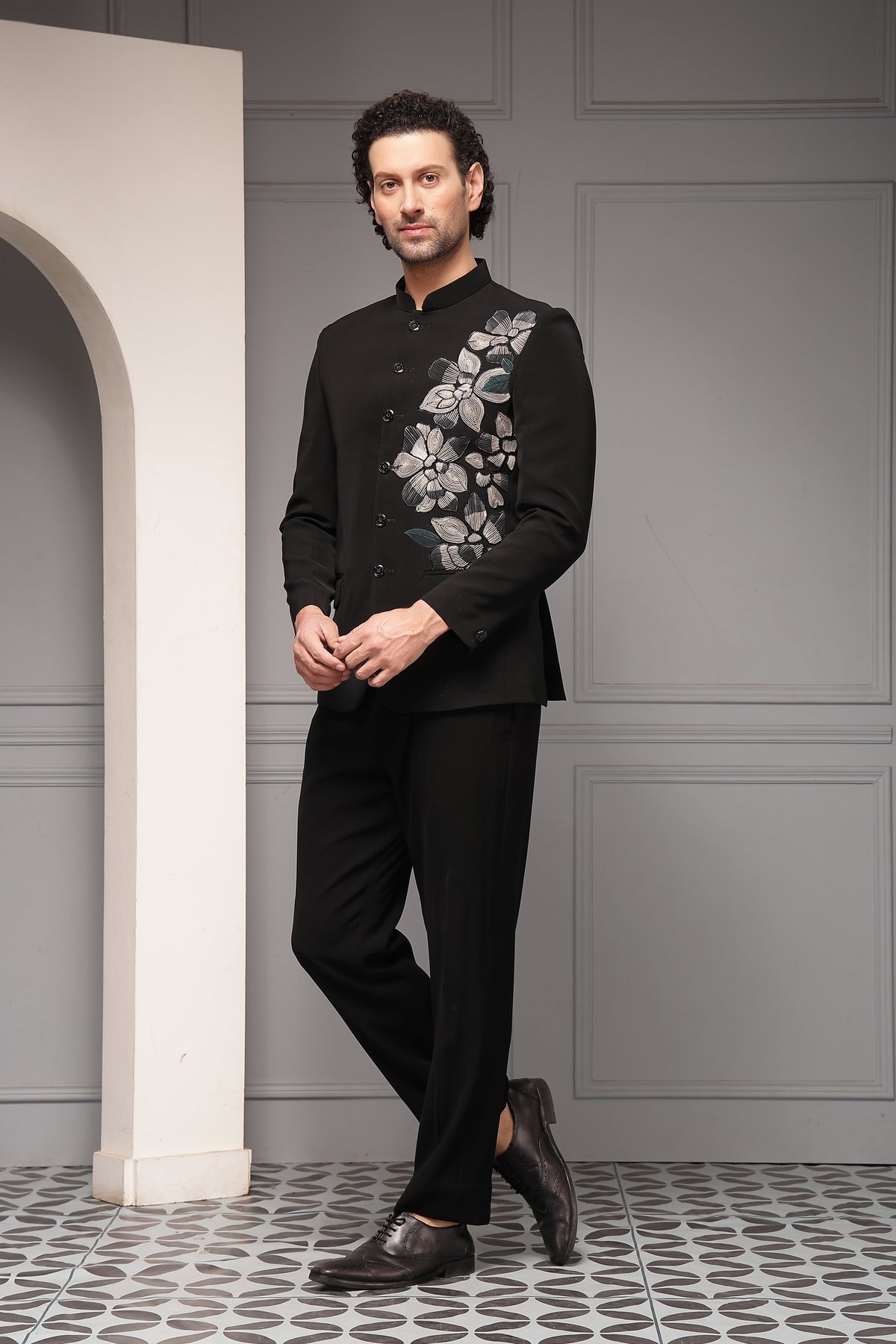 A classic black bandhgala set enhanced with refined floral embroidery placed asymmetrically across the shoulder and chest. The monochrome palette and structured tailoring create a sophisticated statement that blends timeless elegance with contemporary artistry.