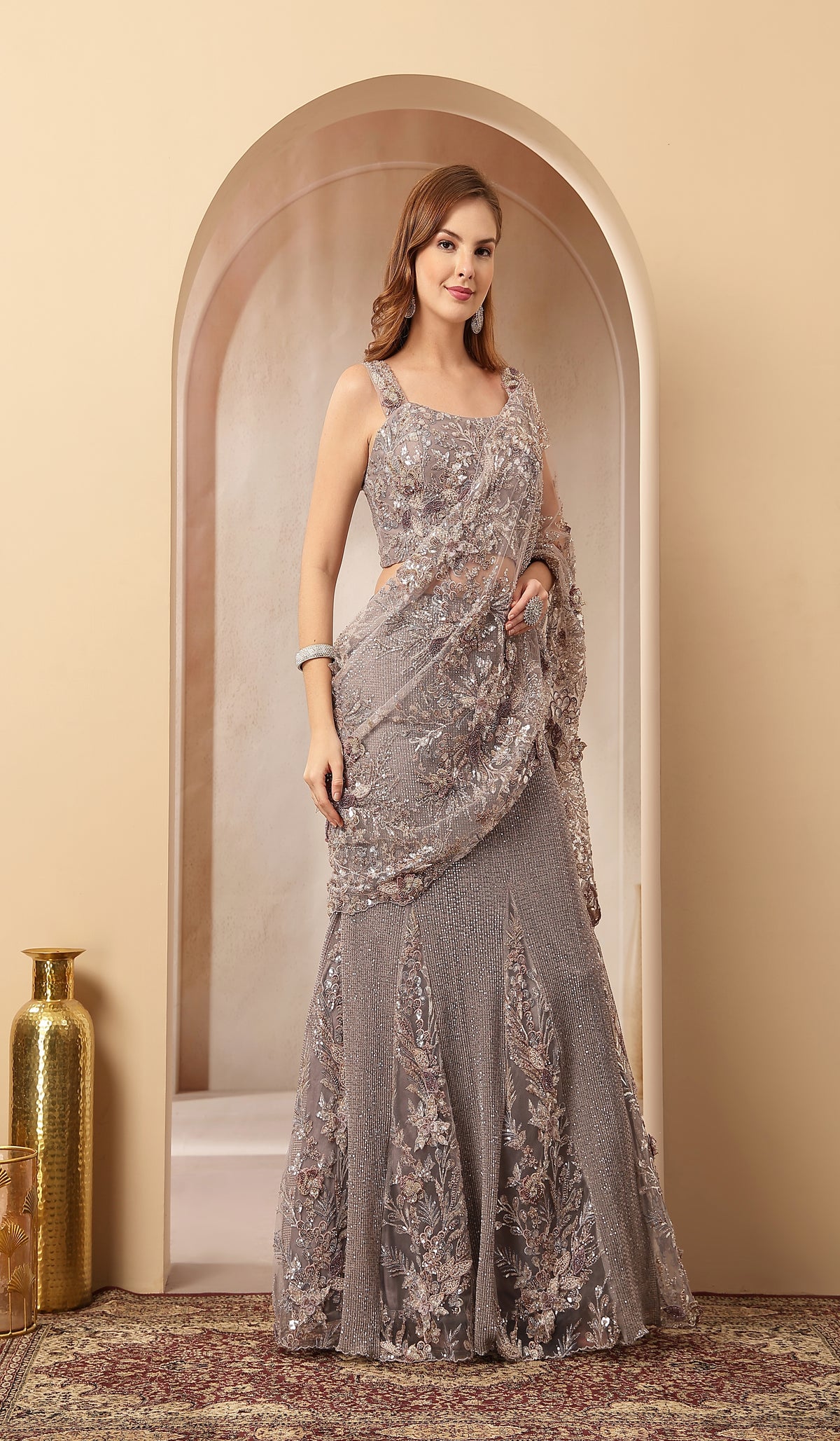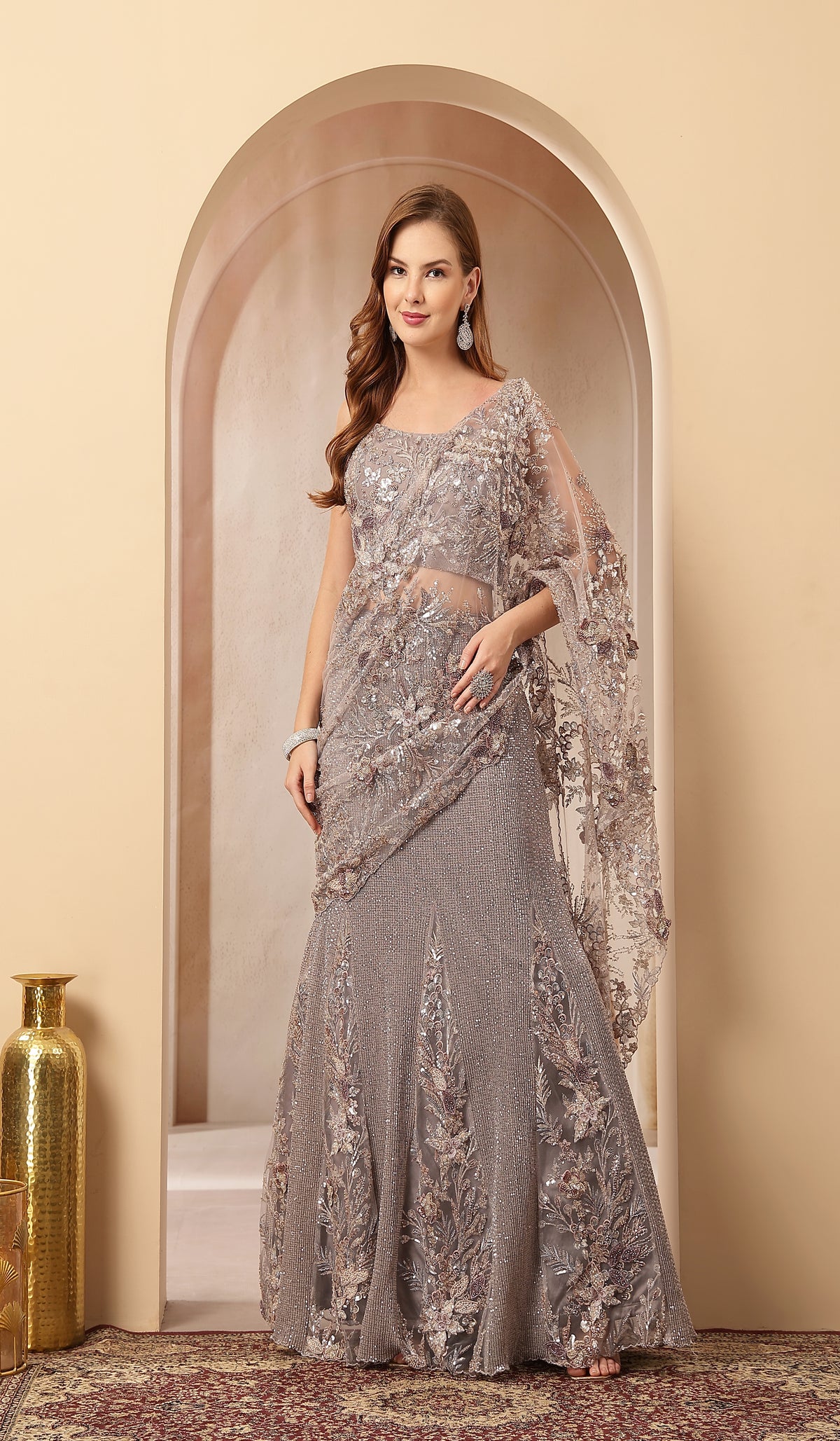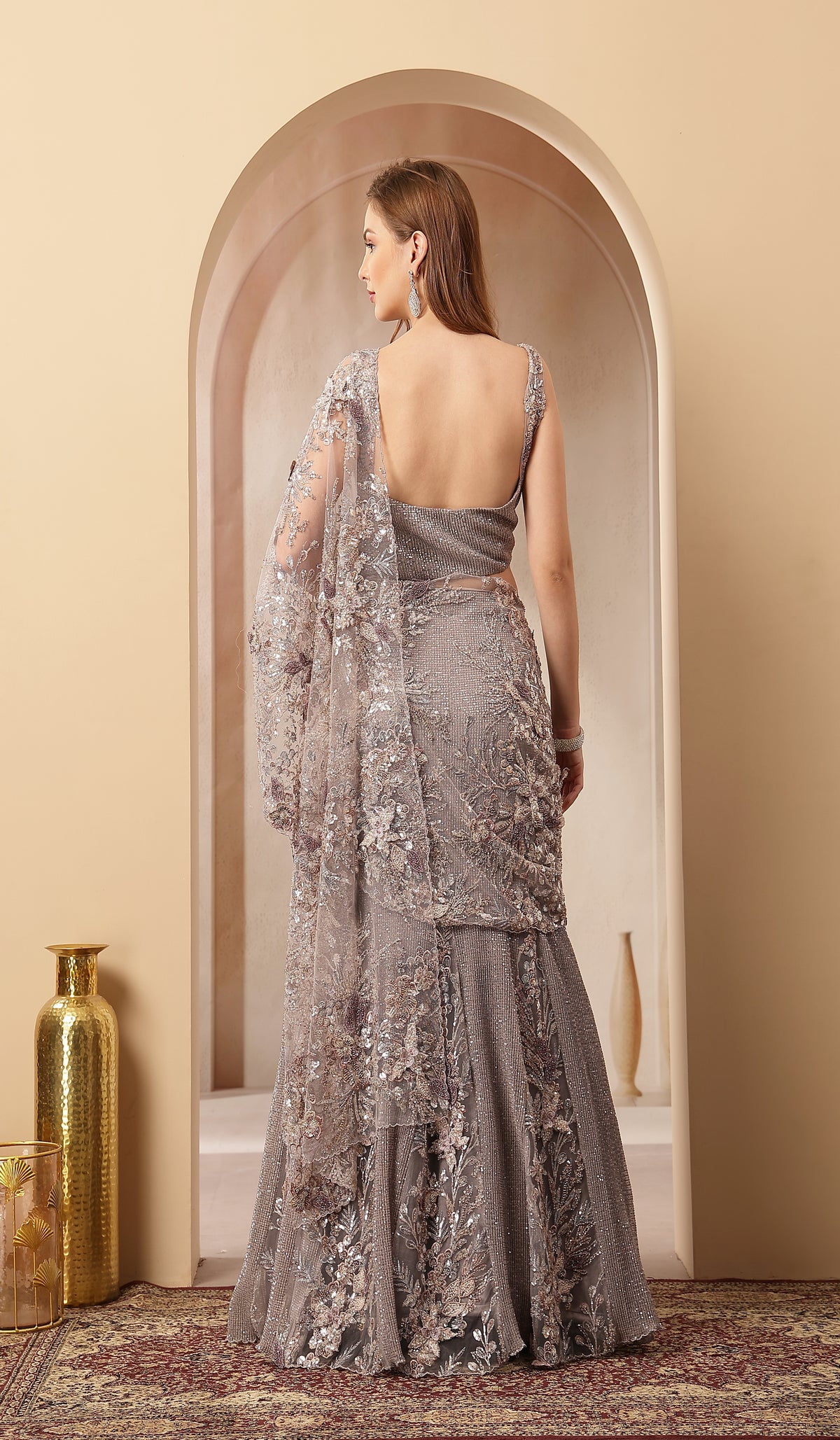 A celestial symphony in silver, this pre-draped saree gown captures the poetry of moonlight on fabric. The ensemble features an intricately hand-embroidered net saree with tonal sequin, cutdana, and beadwork that cascades like liquid shimmer. The layered panels and sculpted silhouette lend a contemporary twist to traditional grace, while the sheer pallu drapes effortlessly over one shoulder, evoking a soft, ethereal allure.